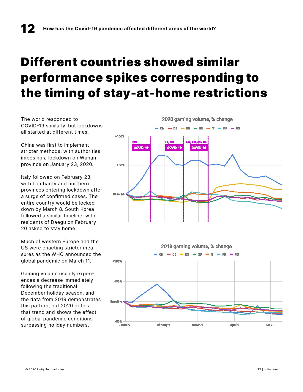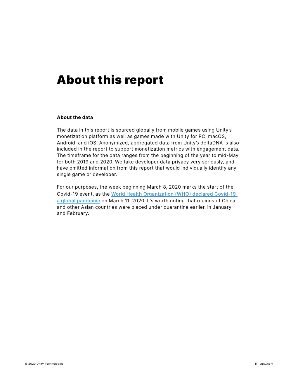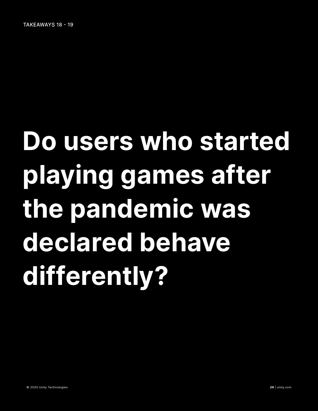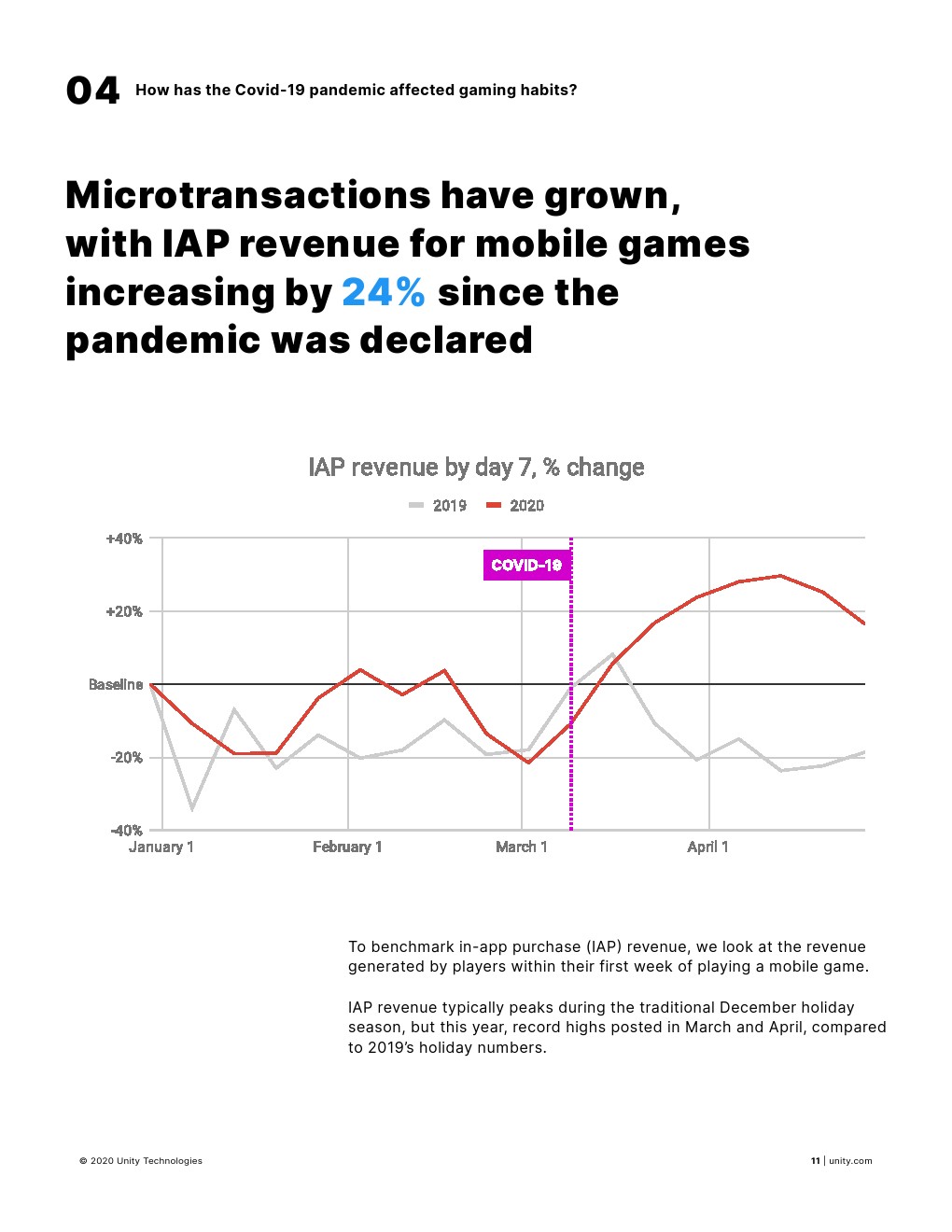 Unity的报告收集了使用其货币化平台的手机游戏以及用于PC、Mac OS、Android和iOS的Unity引擎制作的游戏的数据。它分析了来自DeltaDNA的参与数据。数据范围是从2019年到2020年,从年初到5月中旬。