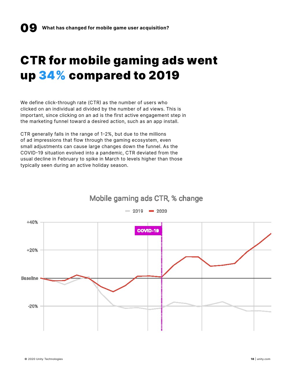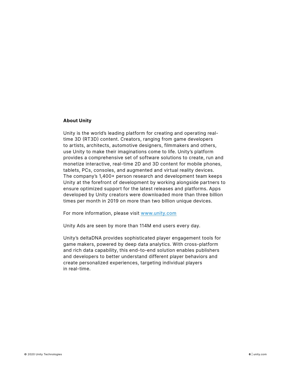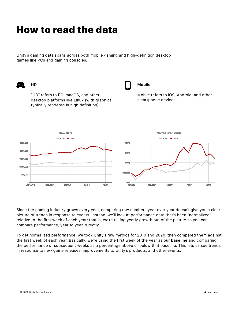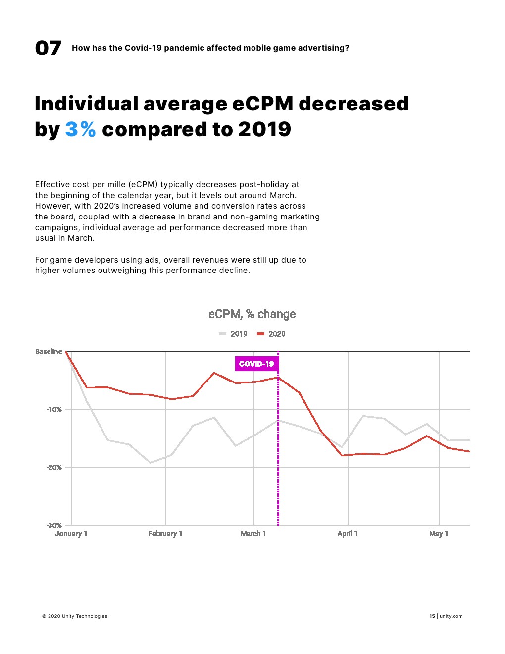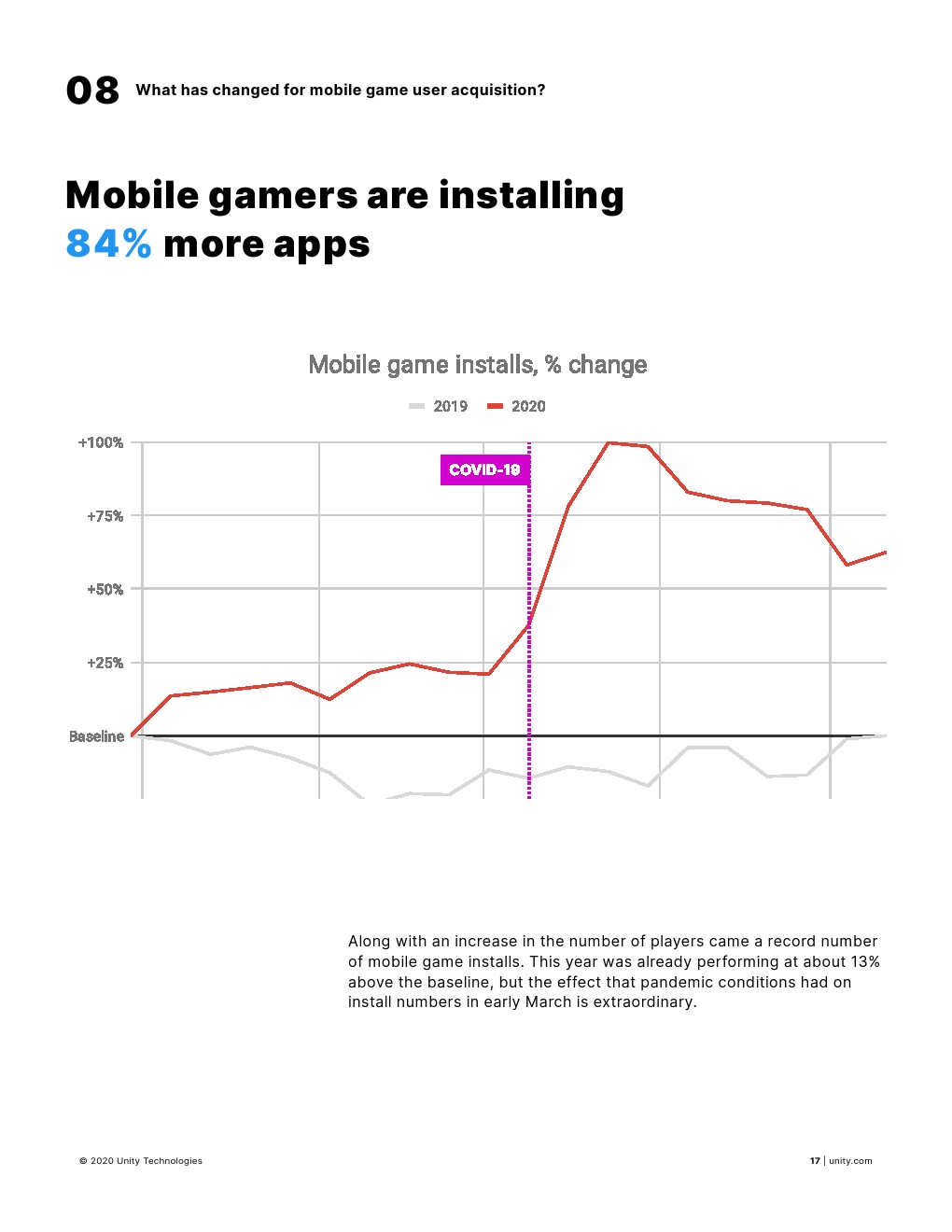 Unity的报告收集了使用其货币化平台的手机游戏以及用于PC、Mac OS、Android和iOS的Unity引擎制作的游戏的数据。它分析了来自DeltaDNA的参与数据。数据范围是从2019年到2020年,从年初到5月中旬。