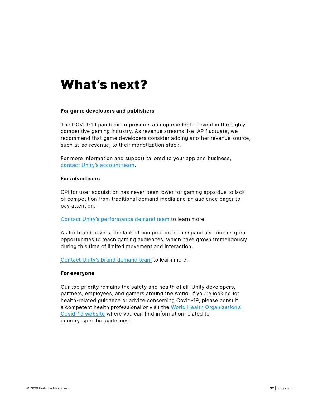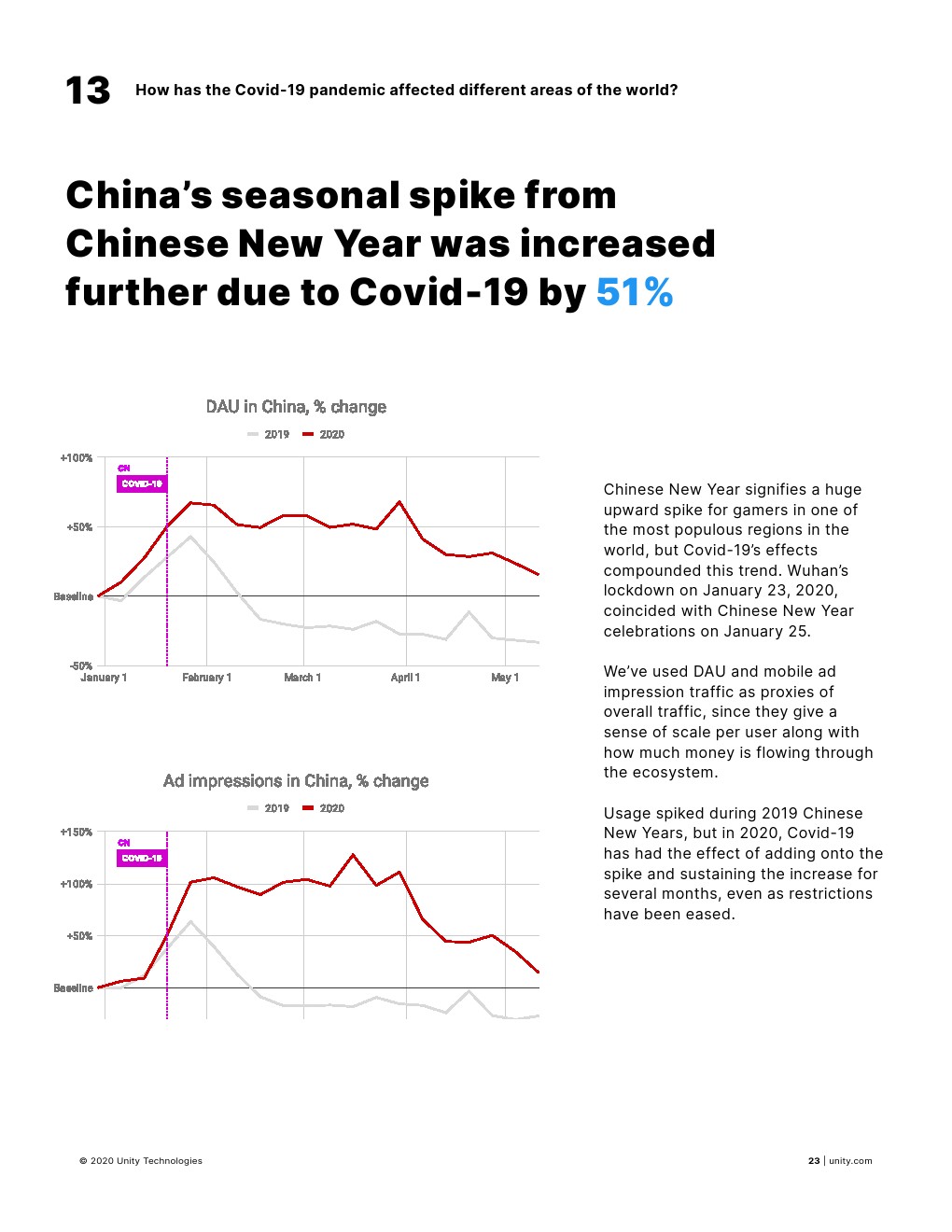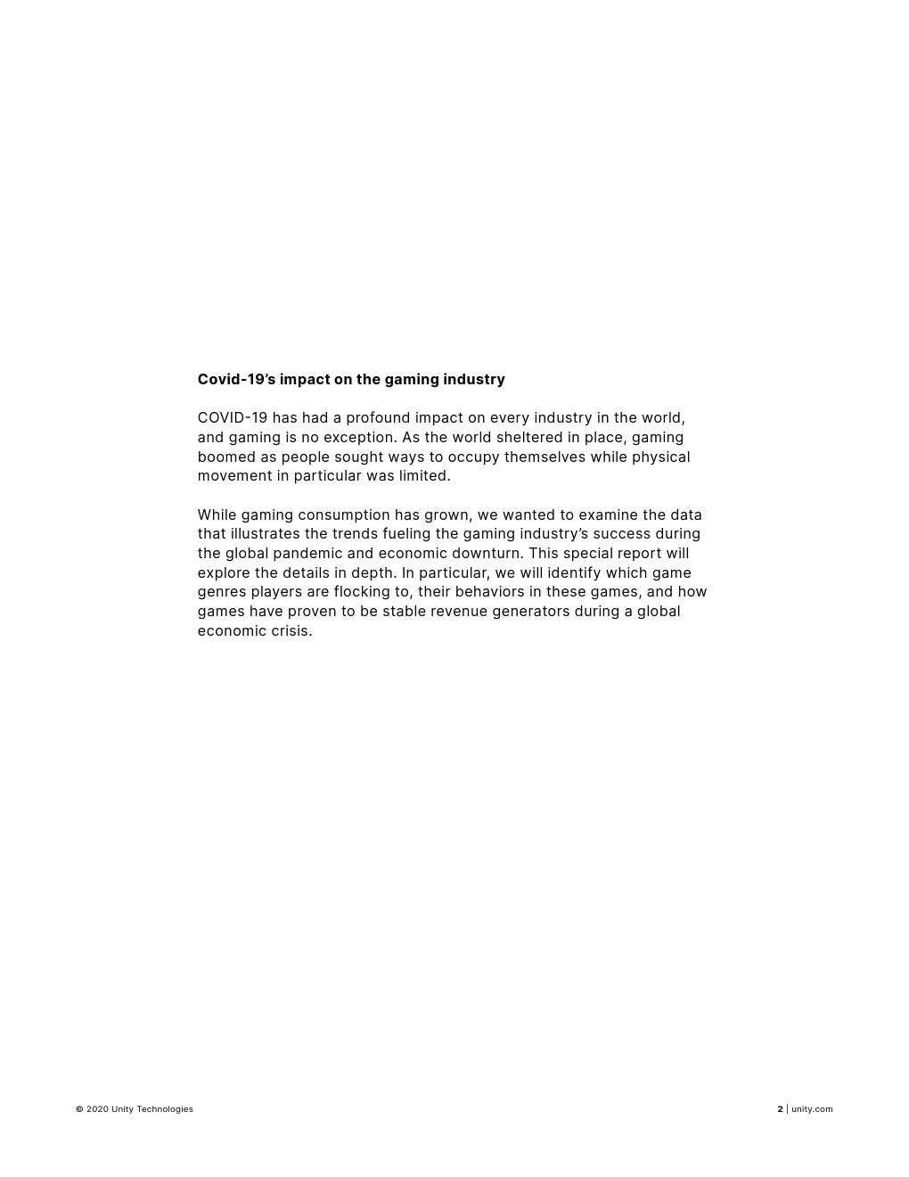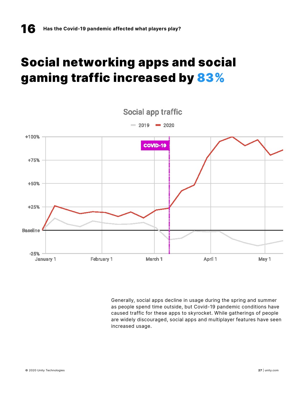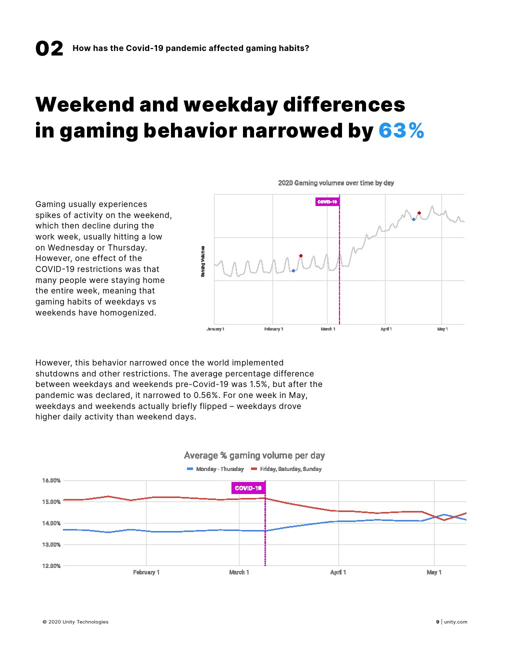Unity的报告收集了使用其货币化平台的手机游戏以及用于PC、Mac OS、Android和iOS的Unity引擎制作的游戏的数据。它分析了来自DeltaDNA的参与数据。数据范围是从2019年到2020年,从年初到5月中旬。