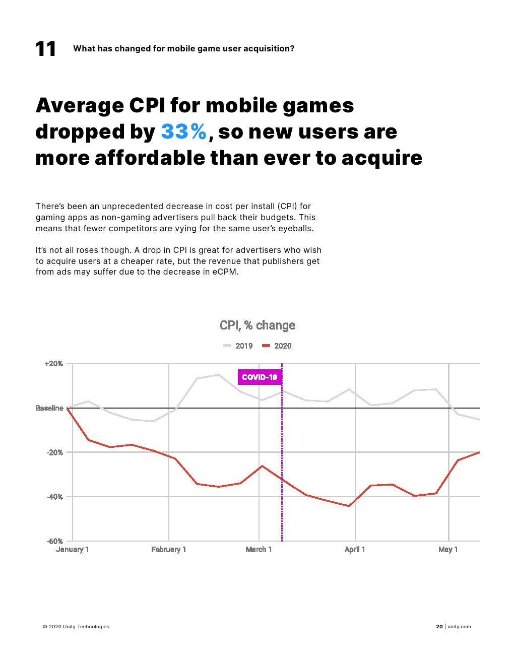 人们对移动游戏兴趣的高涨导致了安装成本的下降。Unity称大流行期间CPI(每次安装成本)下降33%,这是“史无前例的”,Unity将这一趋势归因于非游戏广告商撤回预算。