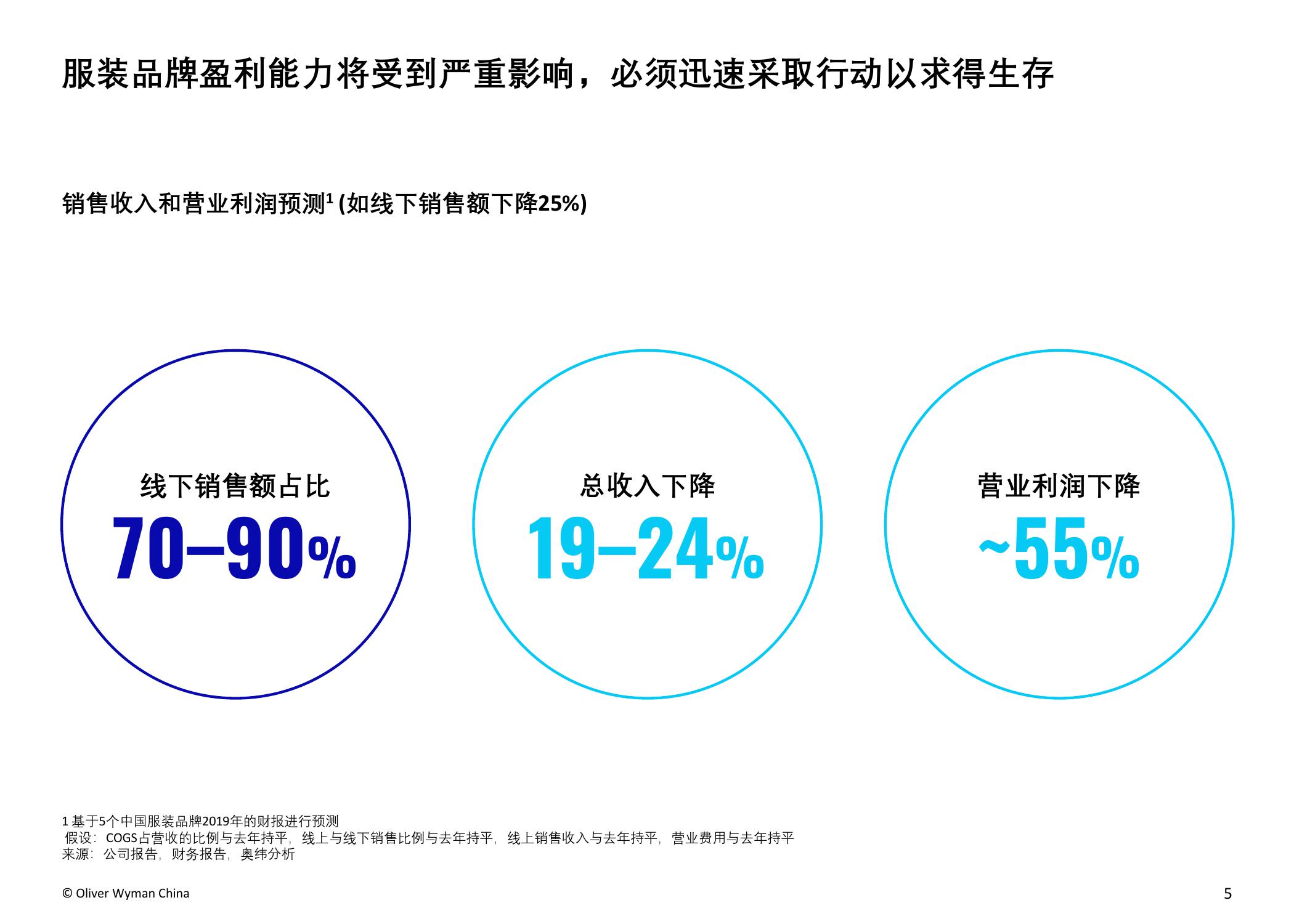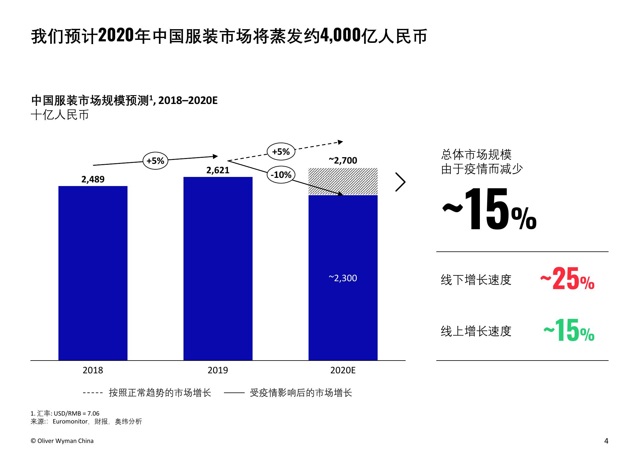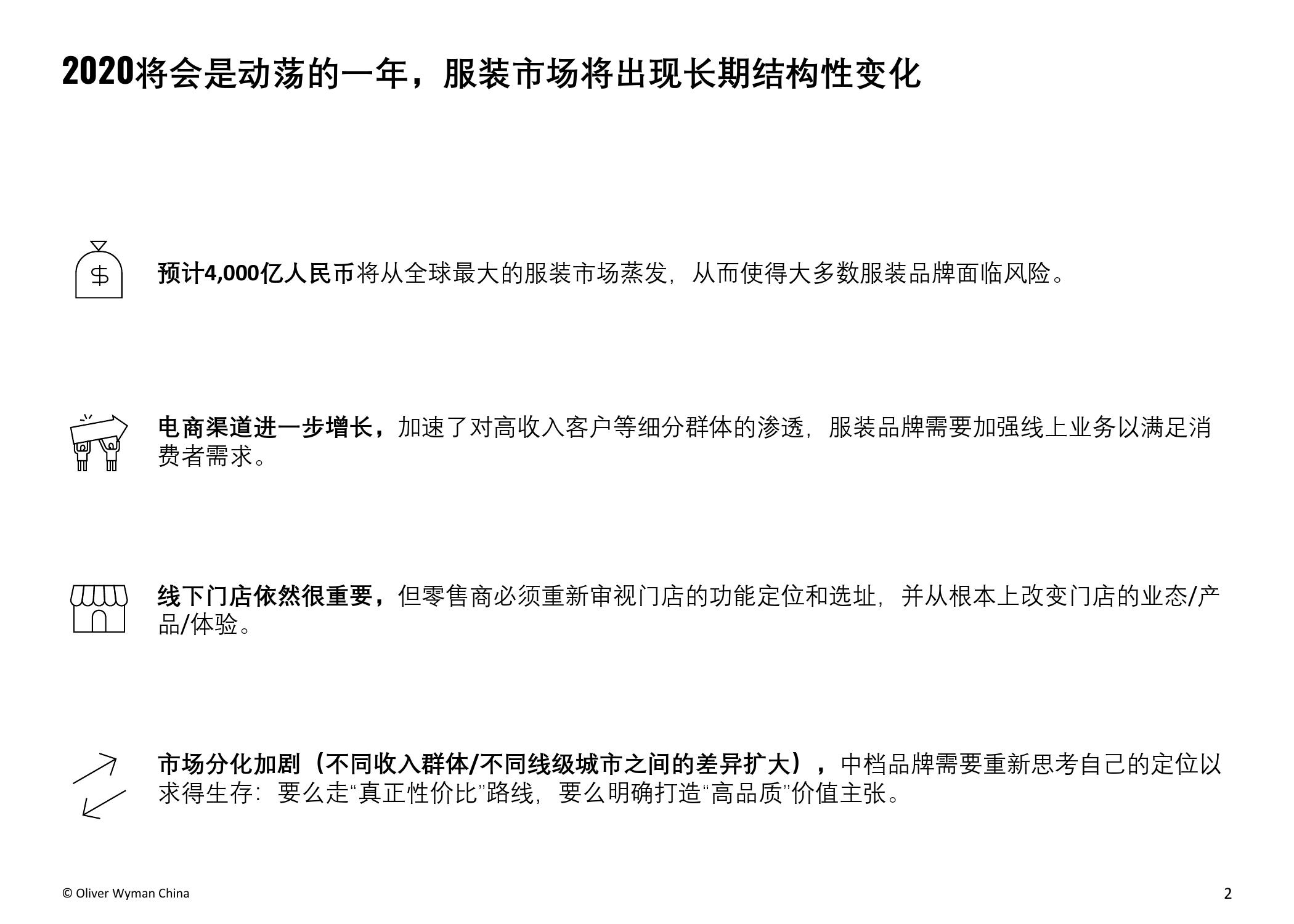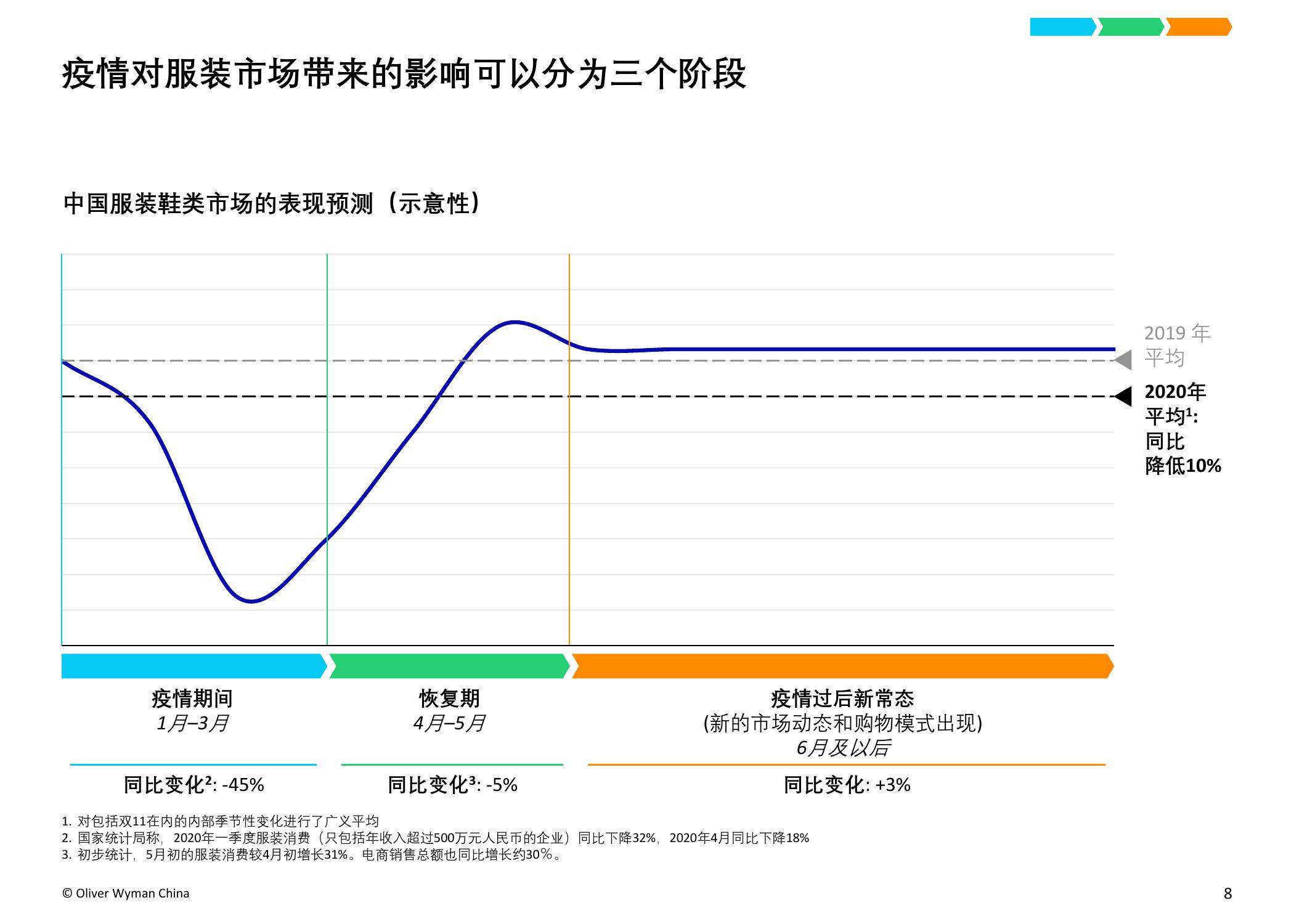 奥纬预计,受疫情影响,2020年中国服装市场的总体市场规模将减少15%,总额约人民币4,000亿元。本次调研的负责人、奥纬咨询零售及消费品业务董事合伙人Imke Wouters对此表示:“中国是世界最大的服装市场,今年是将经历动荡的一年。我们认为疫情使中国的服装和鞋类市场出现了长期结构性转变,例如电商取得进一步增长并向高收入群体加速渗透,不同线级城市间的市场分化加剧,线下门店面临更为严峻的挑战,亟需转变思路以适应疫情后的新常态。”