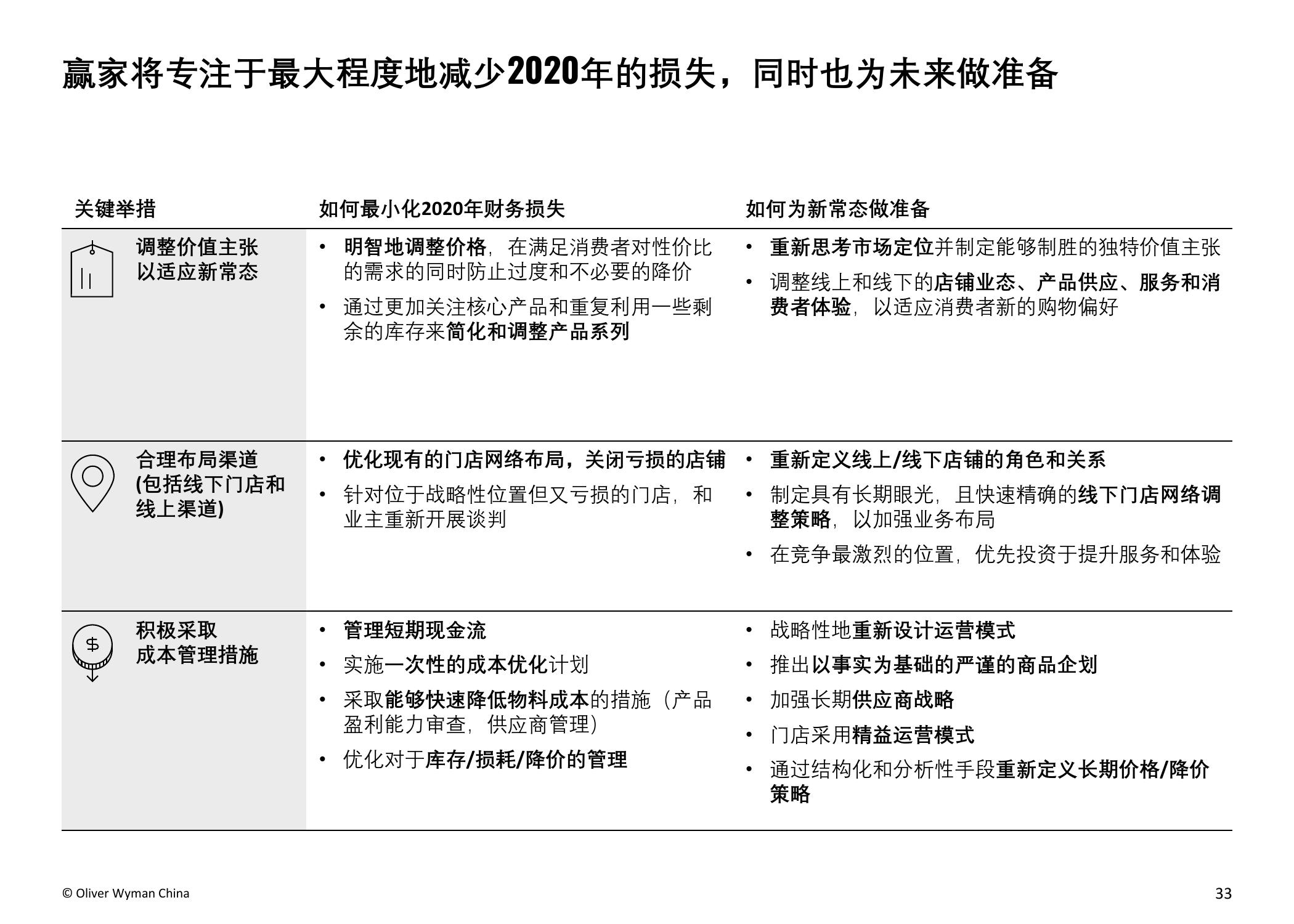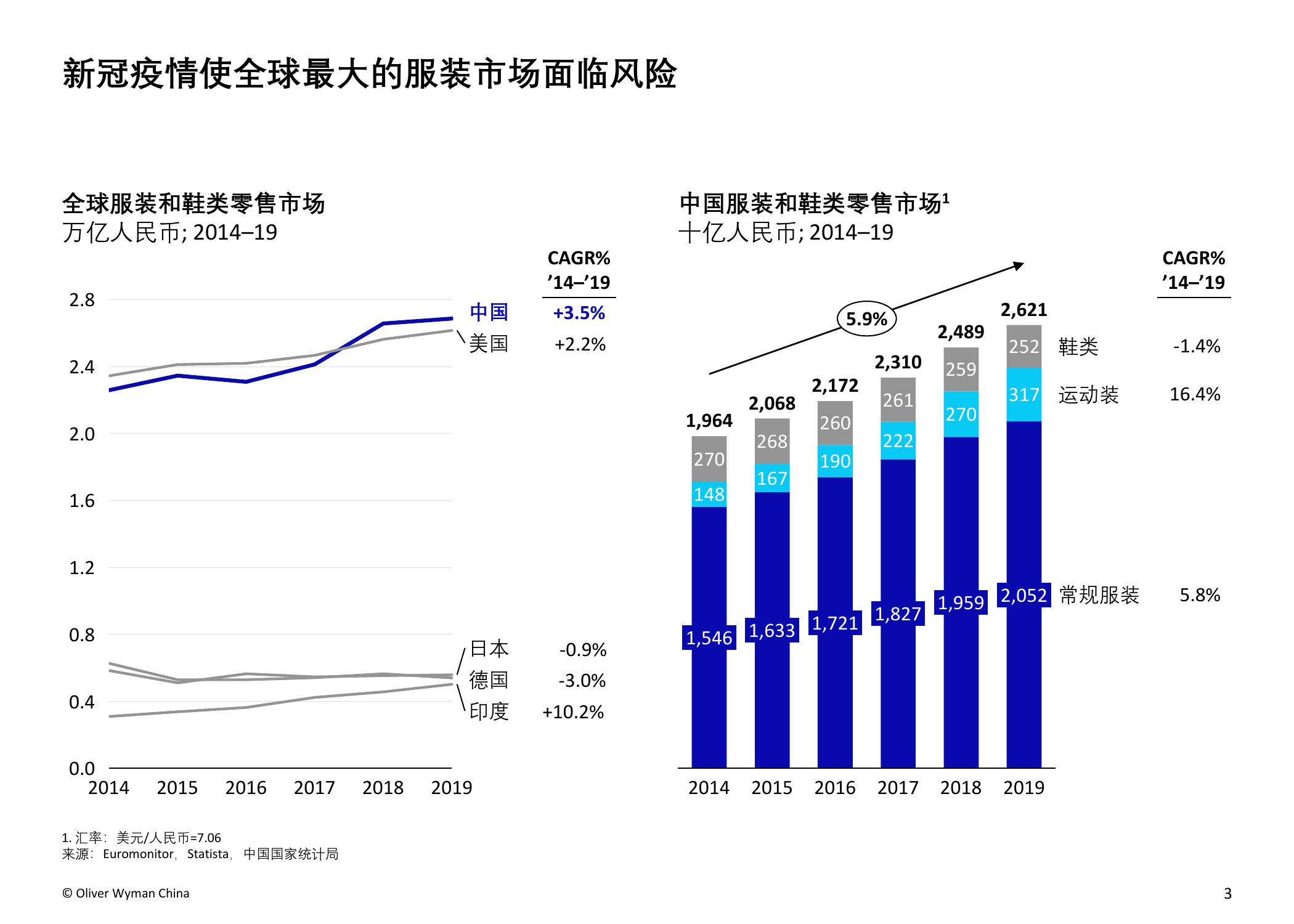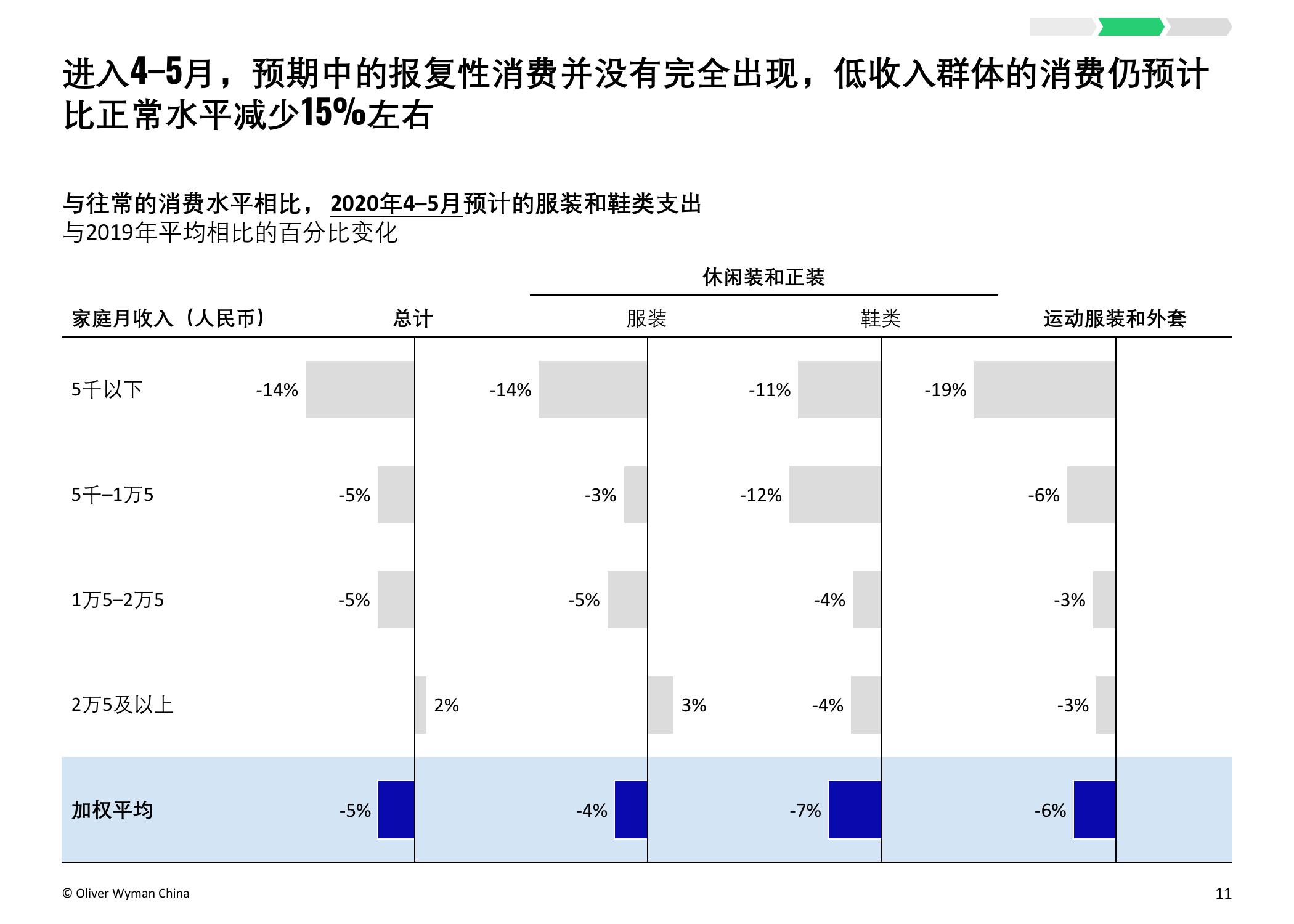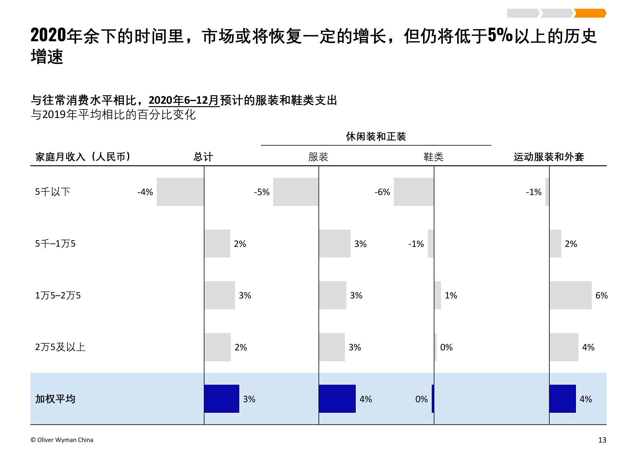 奥纬预计,受疫情影响,2020年中国服装市场的总体市场规模将减少15%,总额约人民币4,000亿元。本次调研的负责人、奥纬咨询零售及消费品业务董事合伙人Imke Wouters对此表示:“中国是世界最大的服装市场,今年是将经历动荡的一年。我们认为疫情使中国的服装和鞋类市场出现了长期结构性转变,例如电商取得进一步增长并向高收入群体加速渗透,不同线级城市间的市场分化加剧,线下门店面临更为严峻的挑战,亟需转变思路以适应疫情后的新常态。”