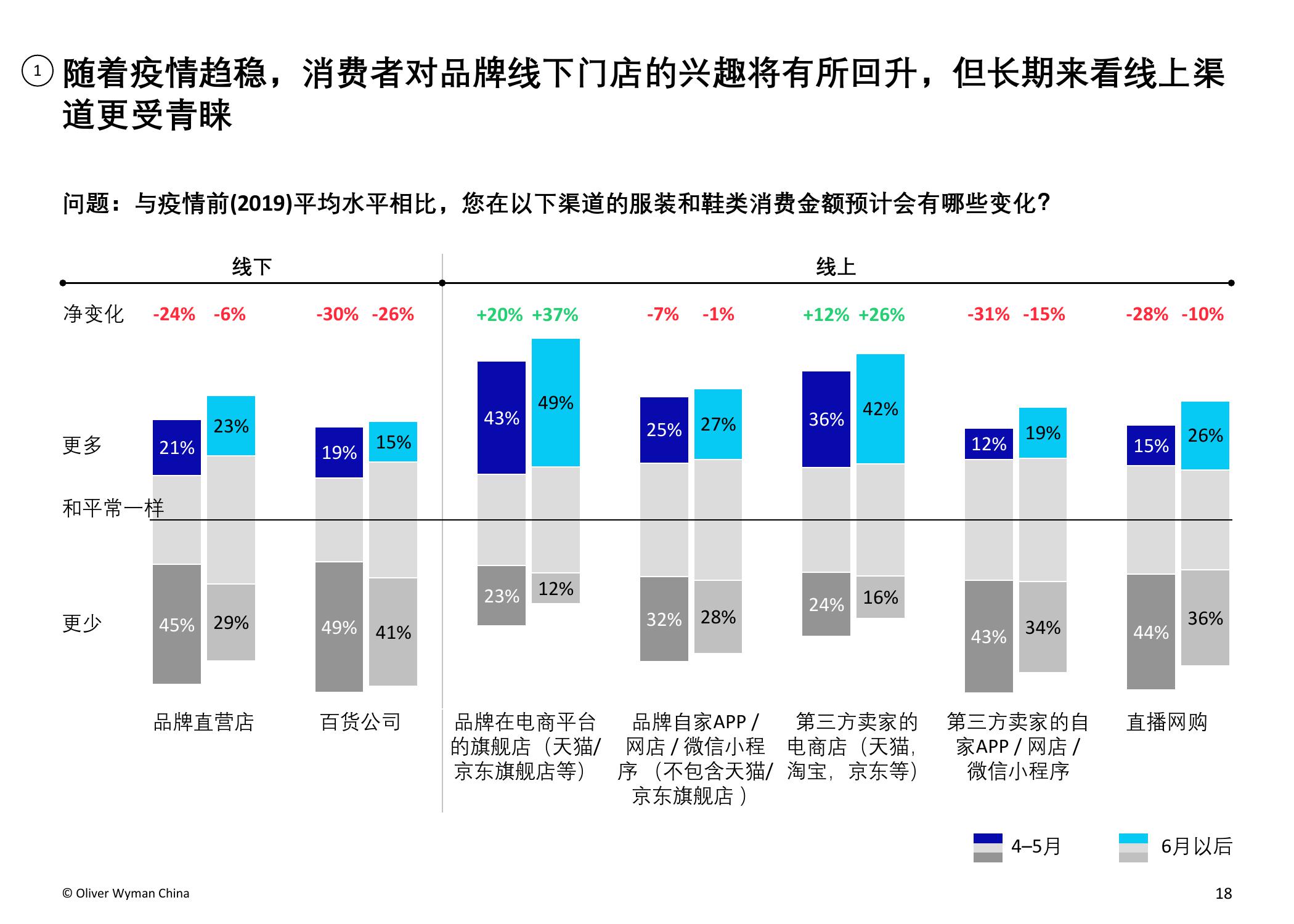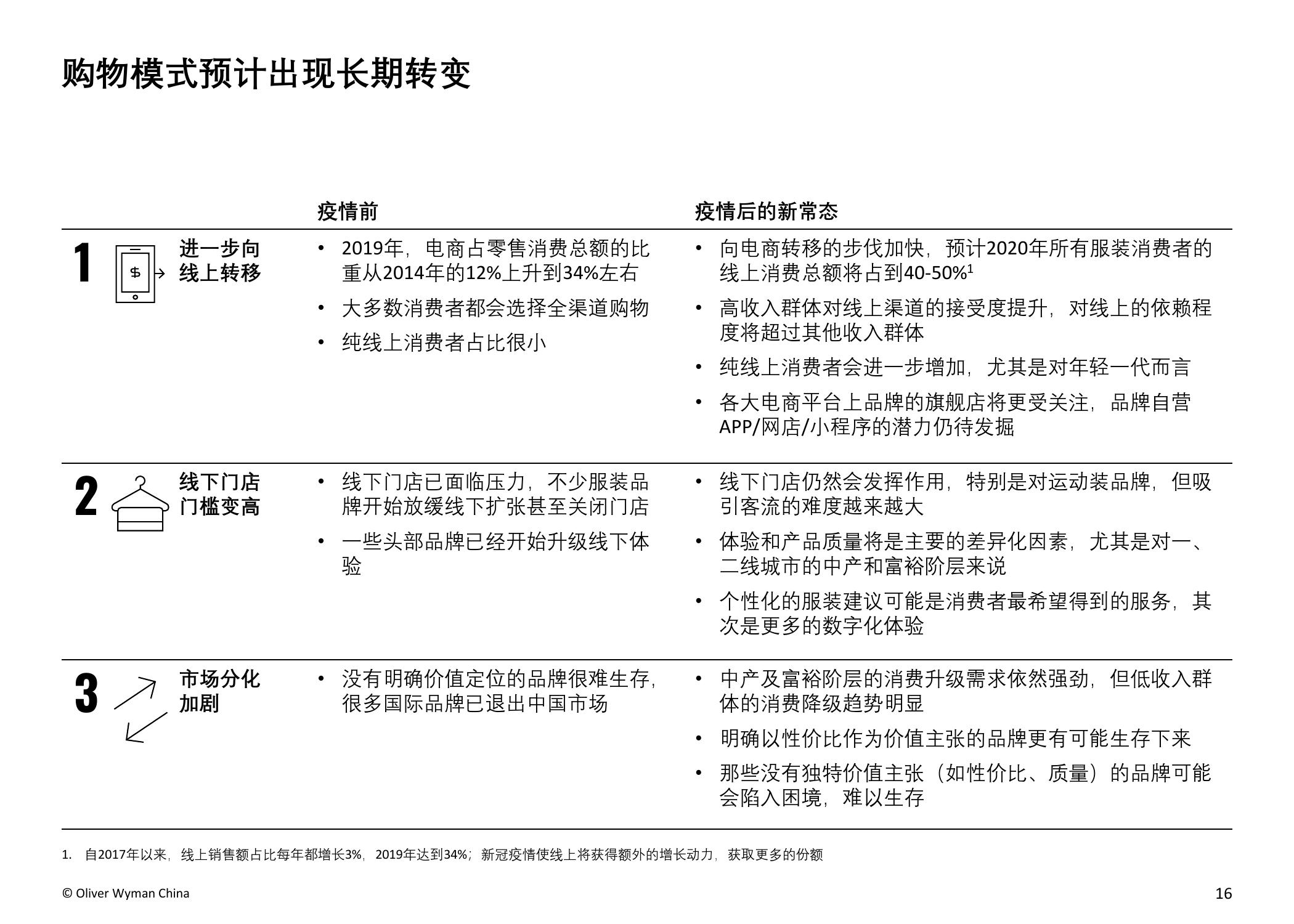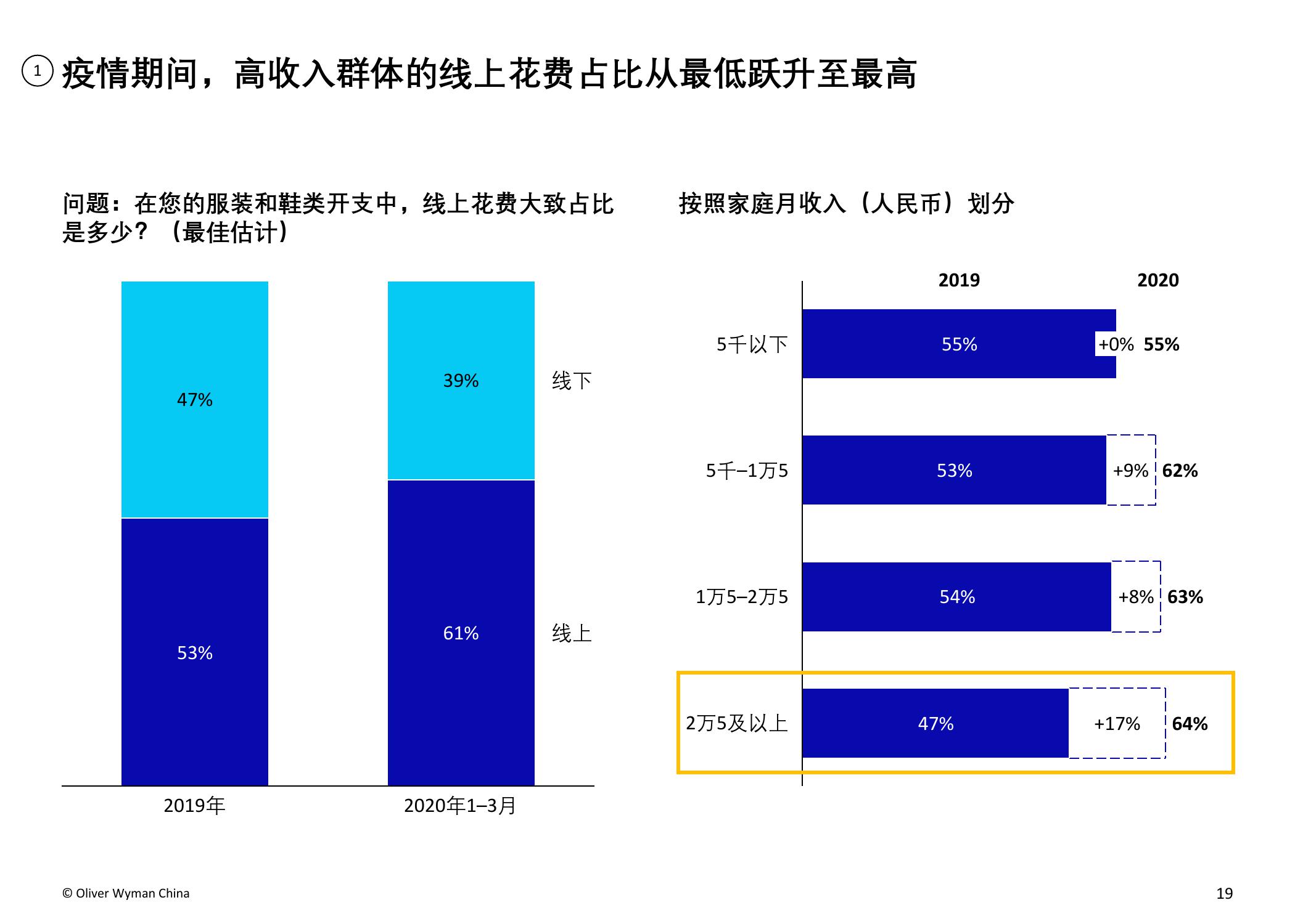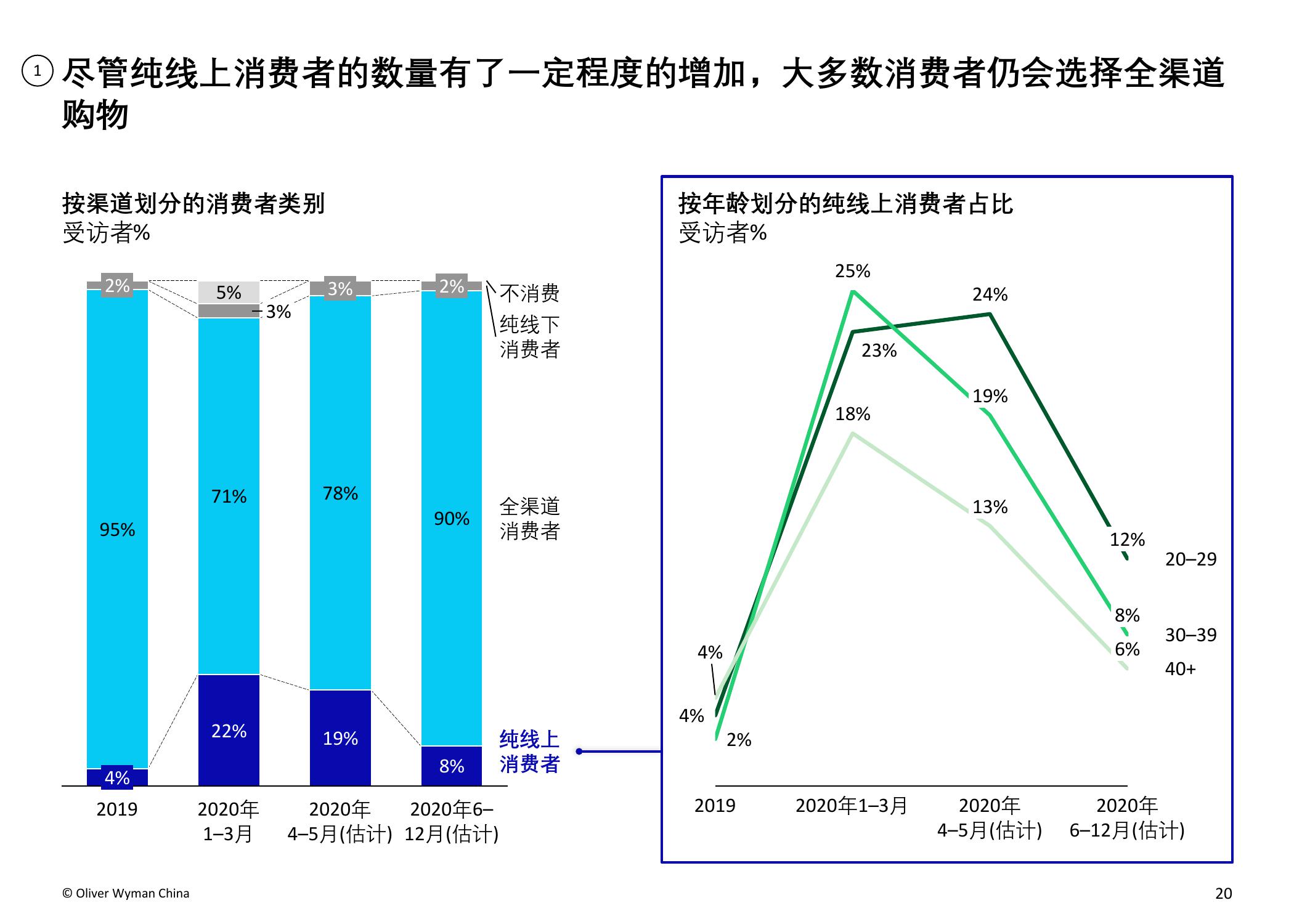 疫情的爆发加速了服装和鞋类品牌向电商转移的步伐。奥纬预测,2020年服装消费者的线上消费总额占比将从2019年的34%上升至40-50%。奥纬调研发现,高收入群体对线上渠道的接受度提升:疫情期间,高收入群体的线上花费占比从最低(疫情前约为47%)跃升至最高(64%)。尽管以年轻一代为主的纯线上消费者的数量有所增加,但高达90%的受访者表示疫情后仍会选择全渠道购物,证明线下实体门店的作用不可或缺。