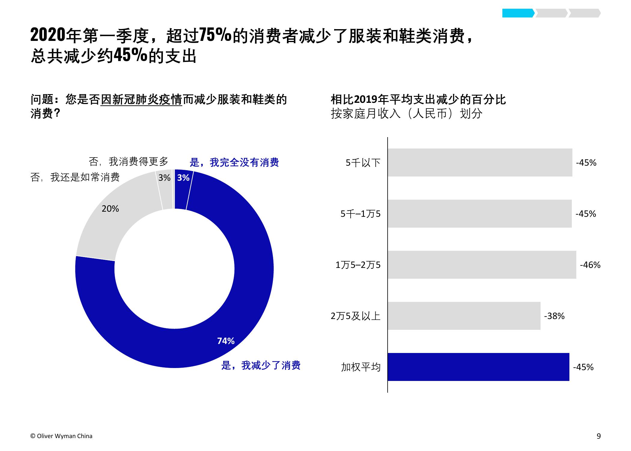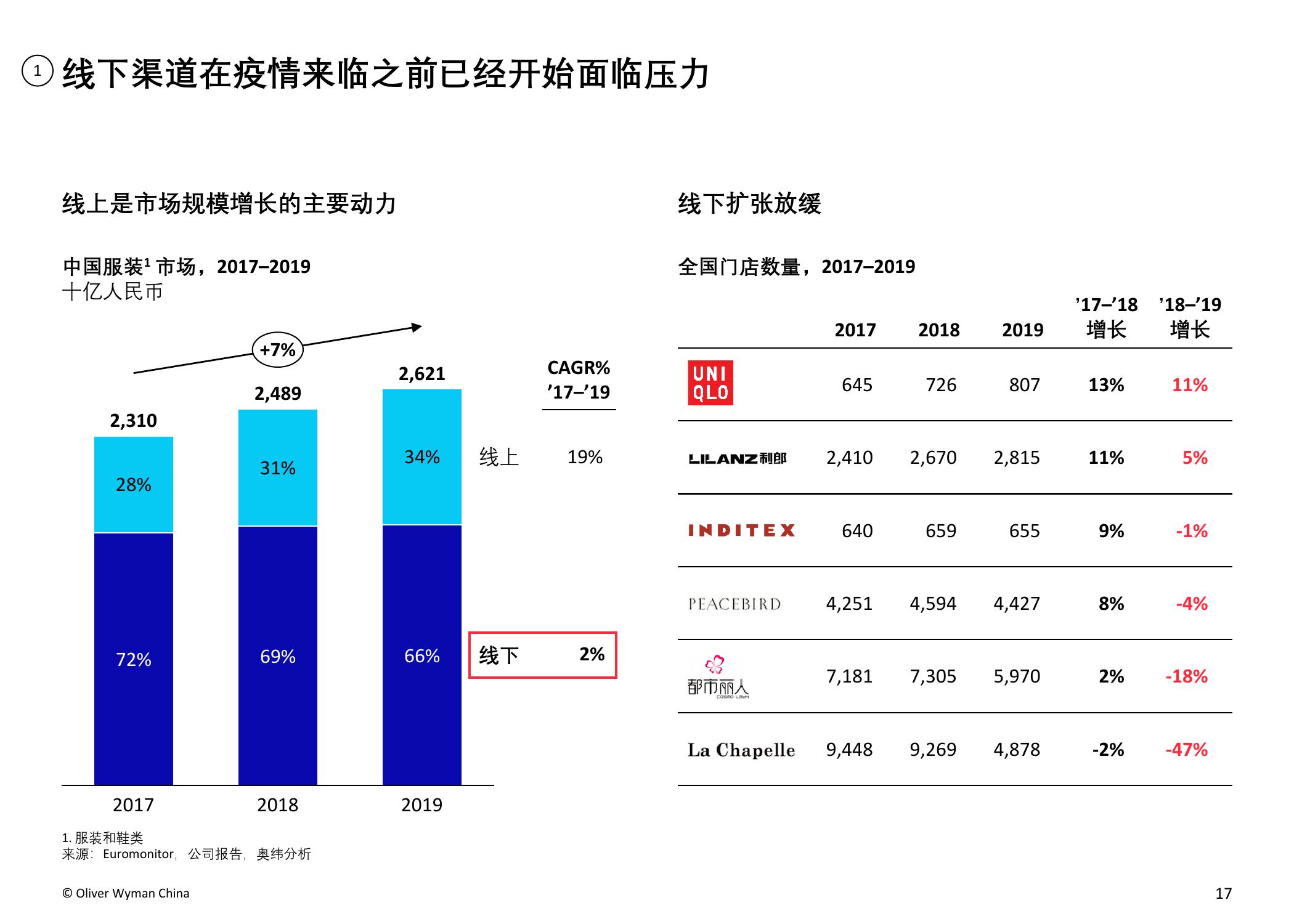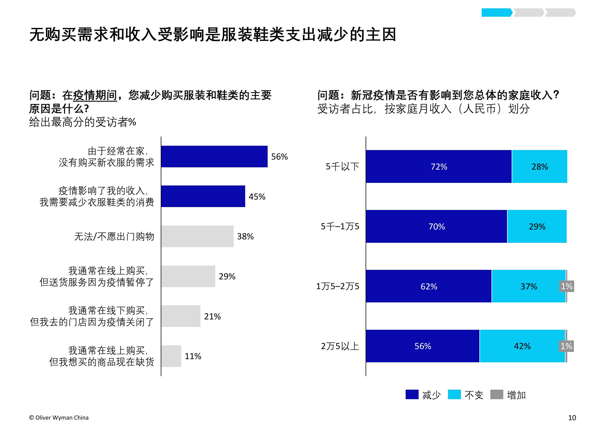 疫情的爆发加速了服装和鞋类品牌向电商转移的步伐。奥纬预测,2020年服装消费者的线上消费总额占比将从2019年的34%上升至40-50%。奥纬调研发现,高收入群体对线上渠道的接受度提升:疫情期间,高收入群体的线上花费占比从最低(疫情前约为47%)跃升至最高(64%)。尽管以年轻一代为主的纯线上消费者的数量有所增加,但高达90%的受访者表示疫情后仍会选择全渠道购物,证明线下实体门店的作用不可或缺。