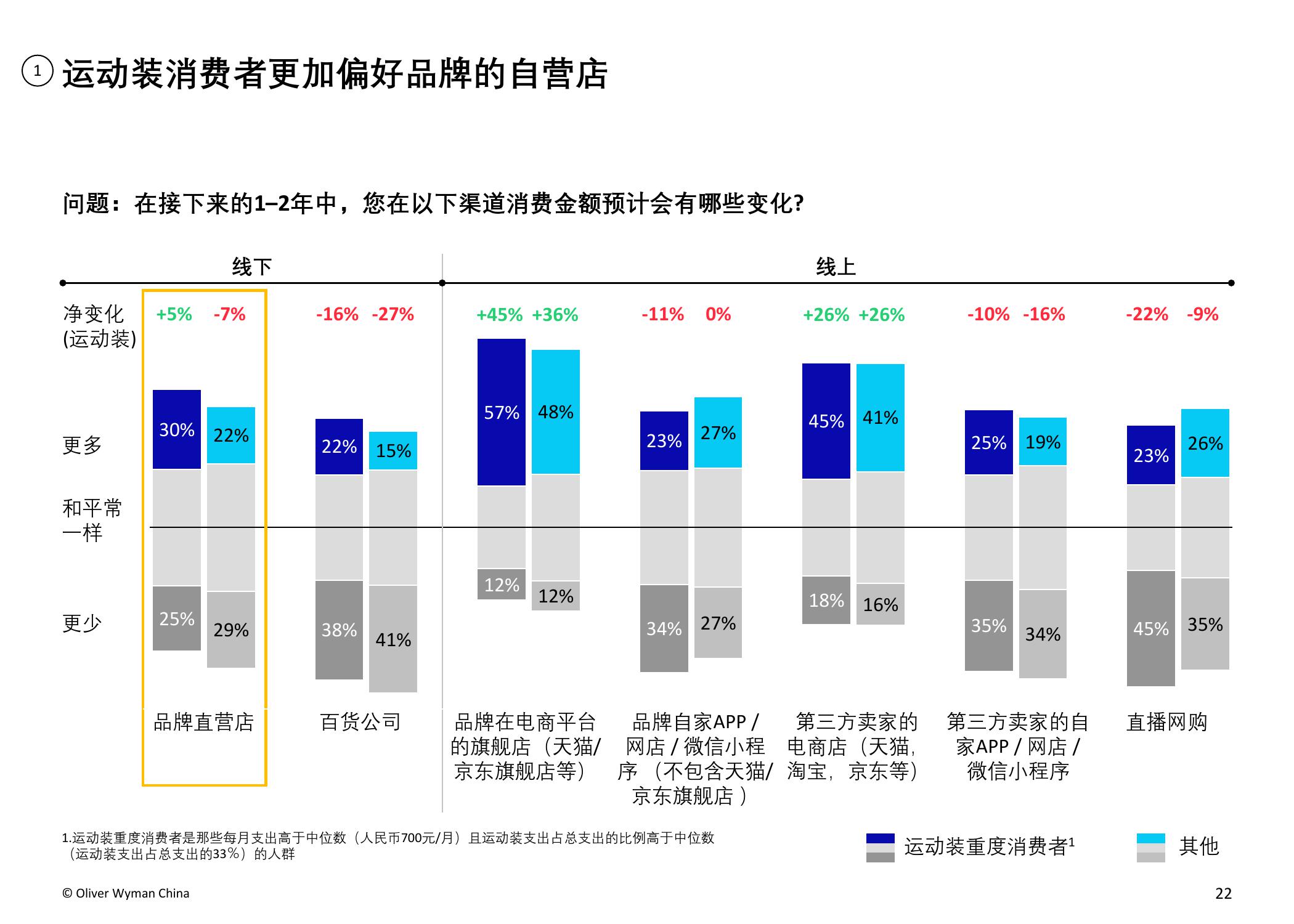 调研发现,运动服装品牌的实体门店较其余品类的服装品牌更受青睐。与普通消费者相比,运动服装爱好者表示,在未来一到两年内,他们更倾向于在品牌的实体店购物。