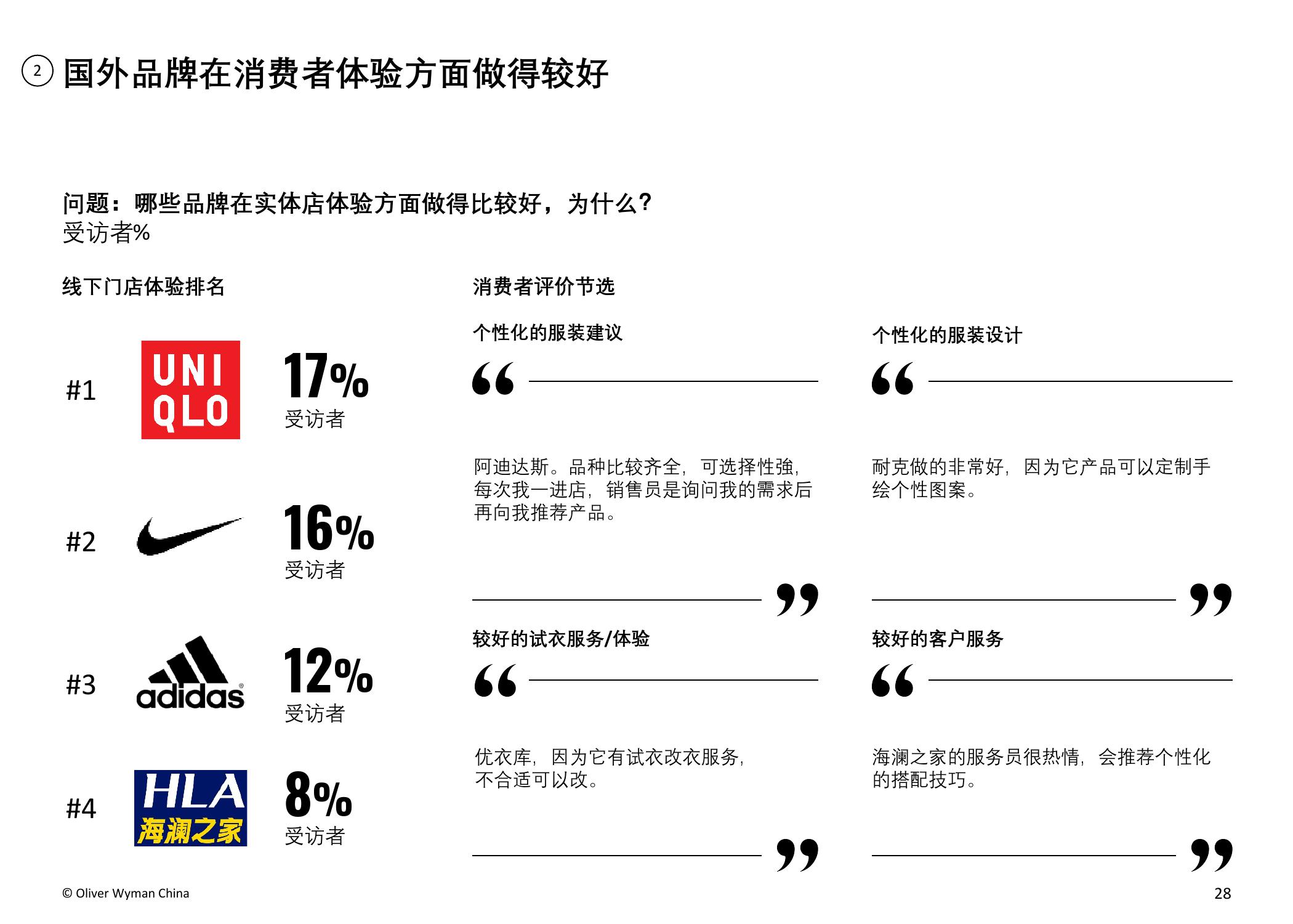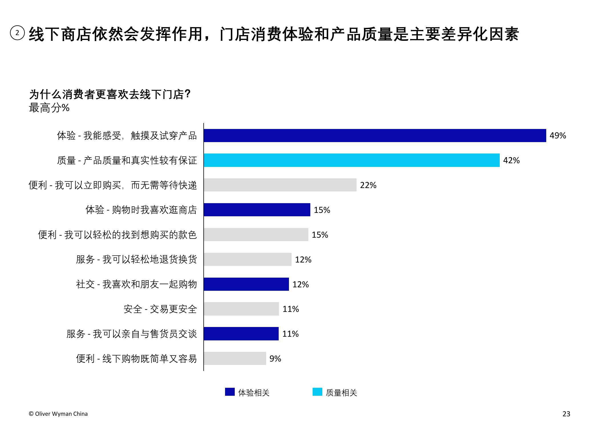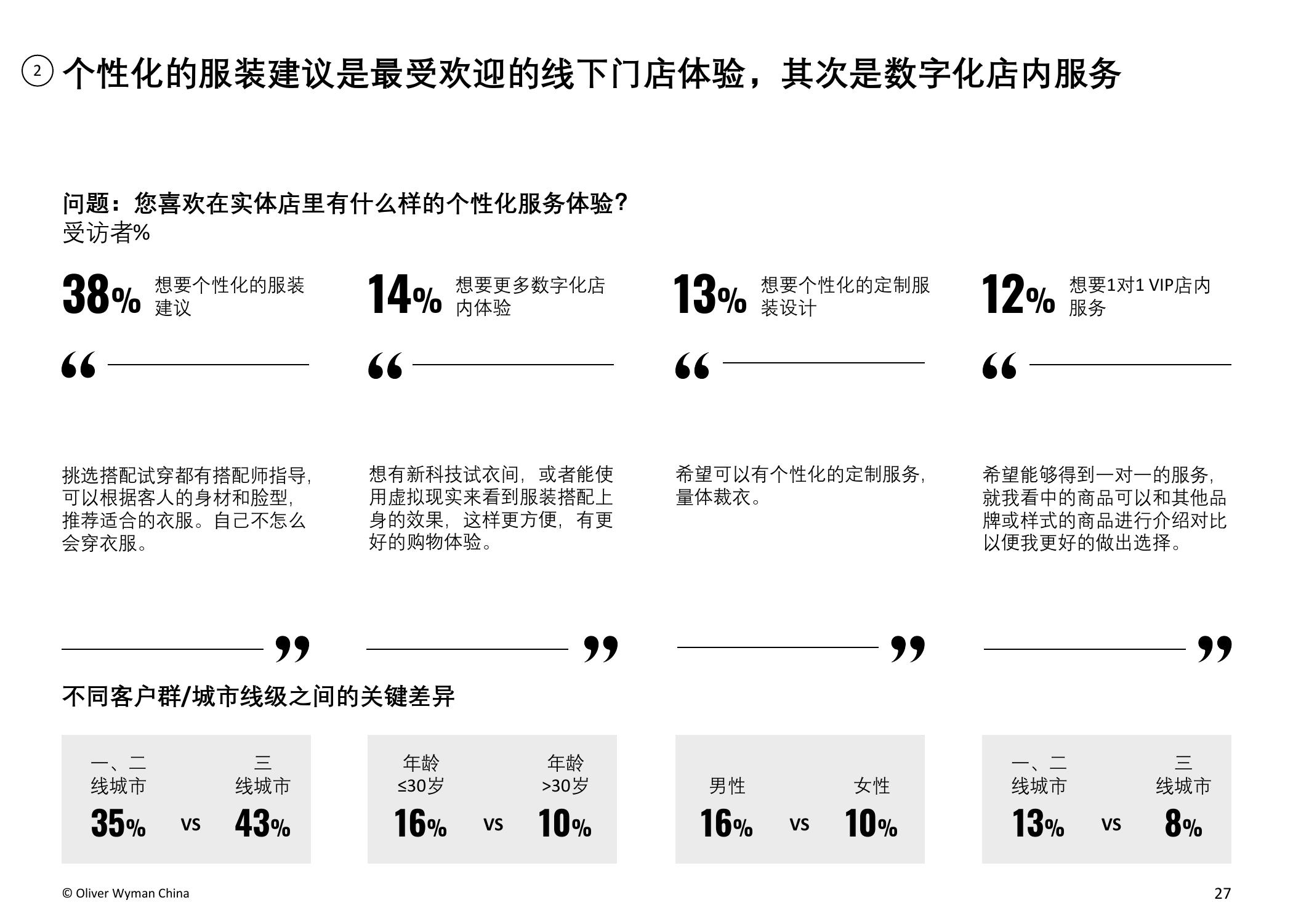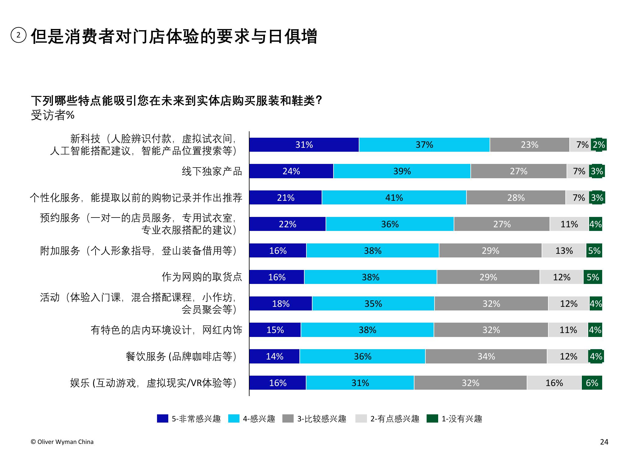 疫情趋稳后(6月至12月),品牌实体店的客流水平预计将有所回升,而百货商场的客流难以出现明显好转。超过四成的受访者表示,他们仍愿意去实体店购物,试穿等亲身体验和产品质量的保证是他们的主要考虑因素。另外,超过六成受访者认为实体店如增加有趣的新体验,对顾客来说将会更具吸引力,包括新科技VR试衣、AI搭配建议、提供线下独家产品以及个性化导购服务等。
