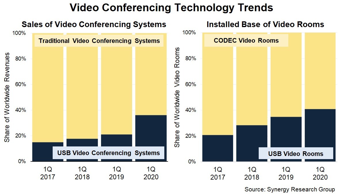 Synergy Research Group的最新研究表明,USB技术正迅速在视频会议市场占据一席之地。第一季度,USB视频会议系统占视频会议市场收入的36%,高于一年前的21%。与此同时,视频房间的USB份额从一年前的35%增长至41%。USB技术比更传统的视频编解码器系统更便宜,而且能够插入VaaS服务。