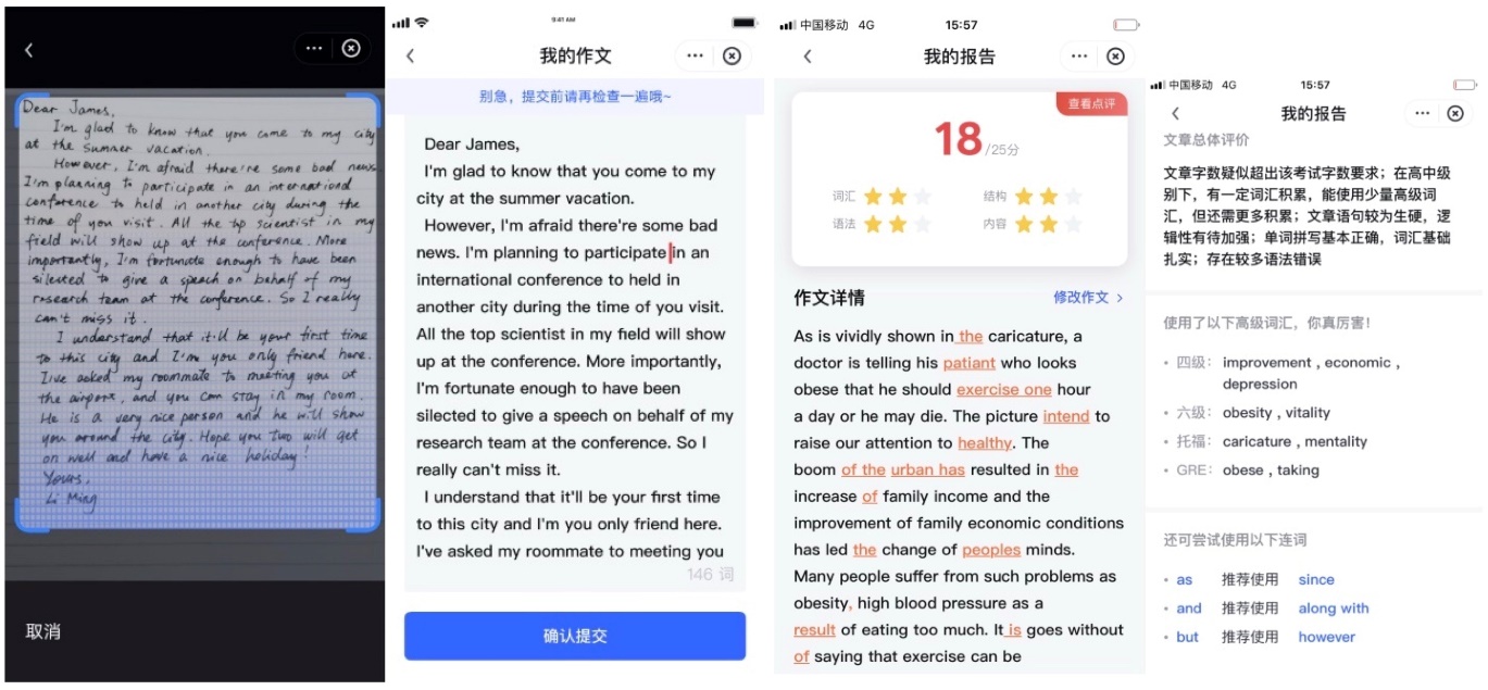 众所周知,网易有道是中国领先的智能学习公司。此次入选机器之心2020 人工智能金炼奖的AI作文批改功能,是网易有道在软件附加内容布局上继神经网络翻译后,推出的又一重要的人工智能技术应用。AI作文批改,顾名思义,是通过人工智能技术自动批改英语作文,使用者可以通过直接拍照或者手动输入需要批改的作文,系统可以自动录入和识别具体作文内容完成批改,帮助各个学段的学习者更好地检测作文水平,快速有效地提升英语写作能力。