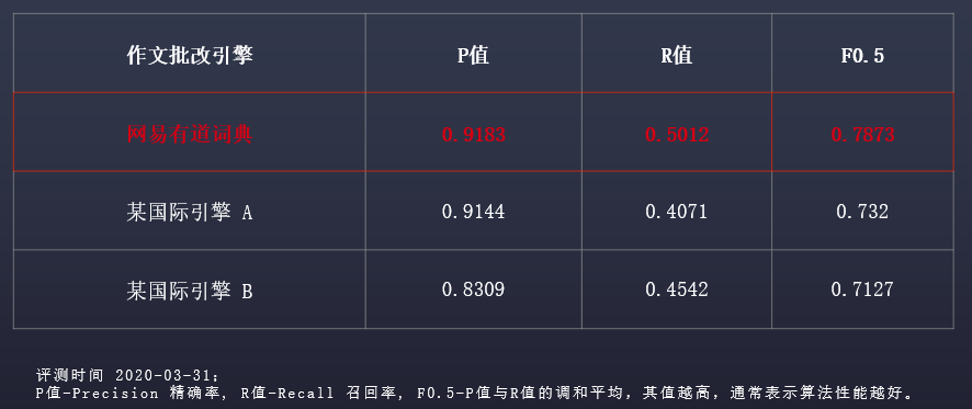 网易有道AI作文批改功能主要由三个核心模块构成:评分模块、评语模块和纠错模块。其中,评分的模型框架结合了传统的方法和深度学习的方法,以词、句、篇章作为核心的评分维度;评语模块提供全文评语、词汇推荐、范文推荐;纠错模块提供14个类别的语法错误识别及修正,包括浅层的拼写错误、深层的语法错误等。通用的评价标准可从批改精确率、召回率等关键数据进行测评。从图中我们可以看出,有道AI作文批改的精确率和召回率明显优于国际同类型产品。