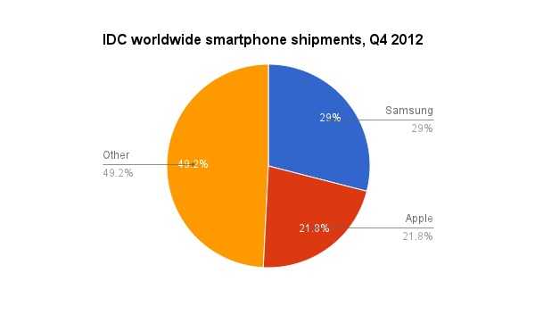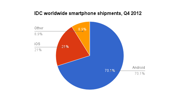 据国际数据公司 IDC 称,从全球范围来看,Android 手机销售数量是领先于 iPhone 的。在 2012 年第四季度,Android 手机在全球的出货量超过了 70%,而 iPhone 只有 21%。