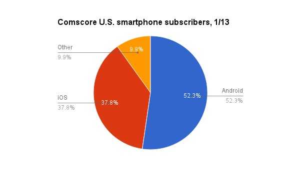 下图是另一家分析公司 Comscore 的研究报告,这份报告主要是统计全美 13 岁以上的手机用户在用的手机系统。而该报告最新发布的统计结果和 Kantar 公司的很接近。