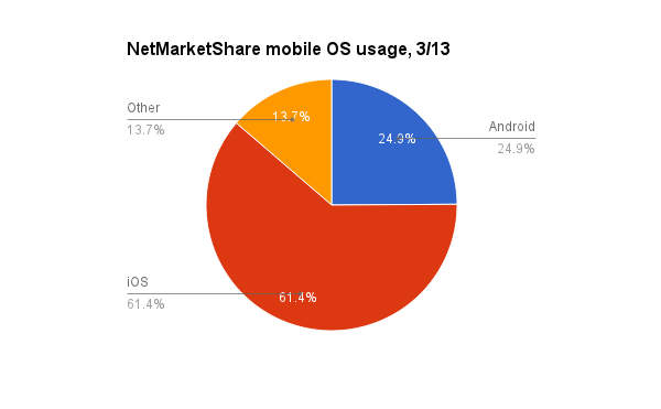 根据 NetMarketShare 公布的数据,在 2013 年 3 月,iOS 用户以 61.4% 的份额领先于 Android 用户的 24.9%,让 iOS 成为用户上网更多的平台。值得注意的是,由于 Android 设备数量更多,所以真正活跃在网上的 iOS 用户数量并不符合这个比例。