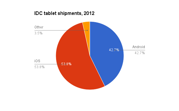 平板电脑的出货数据比智能手机的更难得到,我能找到最新的,关于平台占有率的统计数据就是在去年 12 月 5 日公布的,IDC2012全年概算。可以看出,在平板市场中,iOS 依然还是最受欢迎的操作系统。