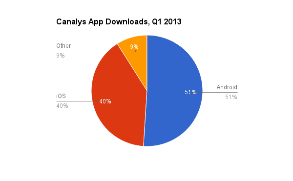 据Canalys公司称,Android 应用下载量占应用总下载量的一半,而 iOS 应用下载量占总下载量的 40%。
