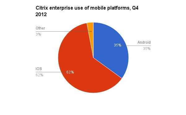根据 Citrix 公司 2012 年第四季度的报告,Android 和 iOS 平台两个平台都是企业优先考虑的对象。而 iOS 平台更受企业青睐。