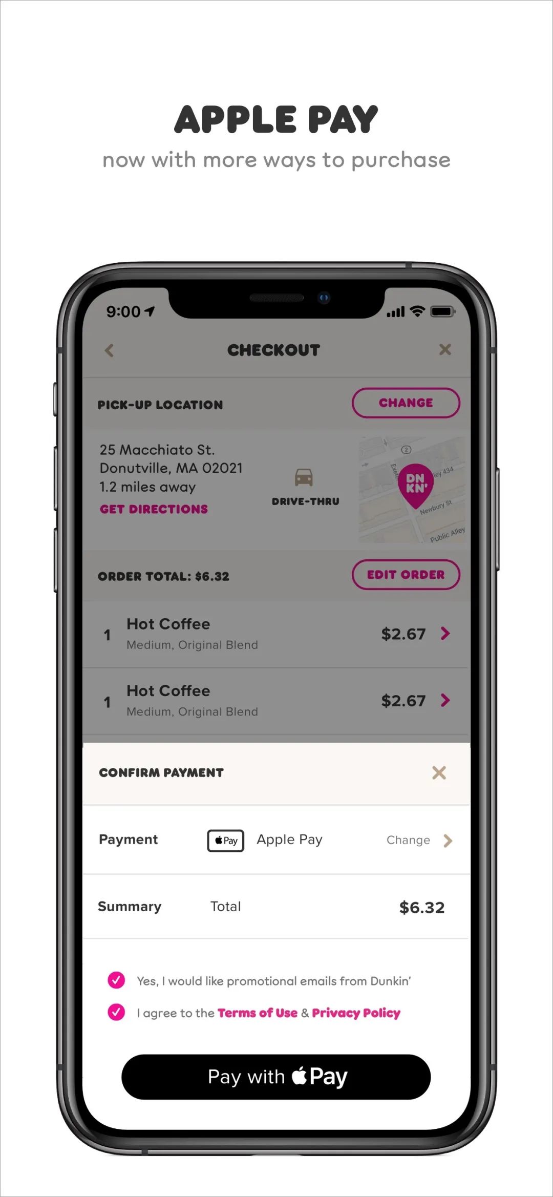 滑动查看 Dunkin 的应用界面截图,包括路边取餐、手机下单与无接触在线支付