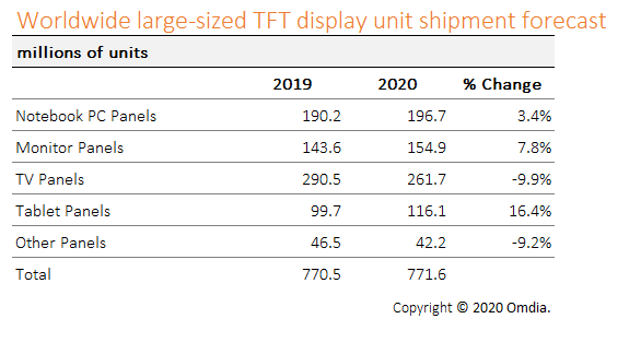 根据Omdia《大尺寸面板市场追踪报告》,2020年全球大尺寸TFT面板出货量预计将达到7.716亿片,比2019年的7.705亿片增长不到1%。这个数据包括9英寸及以上的LCD和OLED 面板。本年度的增长总量持平,反映了上半年面板市场以及全球经济状况剧烈变化的情势,与下半年相比可能会有很大的不同。