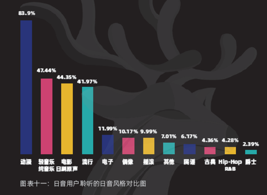 报告统计显示,最受日音用户欢迎的音乐风格为动漫音乐,其次为轻音乐/纯音乐、电影/日剧原声和流行音乐,同时,像电子、偶像、摇滚、民谣等各类风格也有一席之地,这既展现出动漫音乐在乐迷心中毋庸置疑的高人气,也是音乐分众化趋势加剧的重要例证。