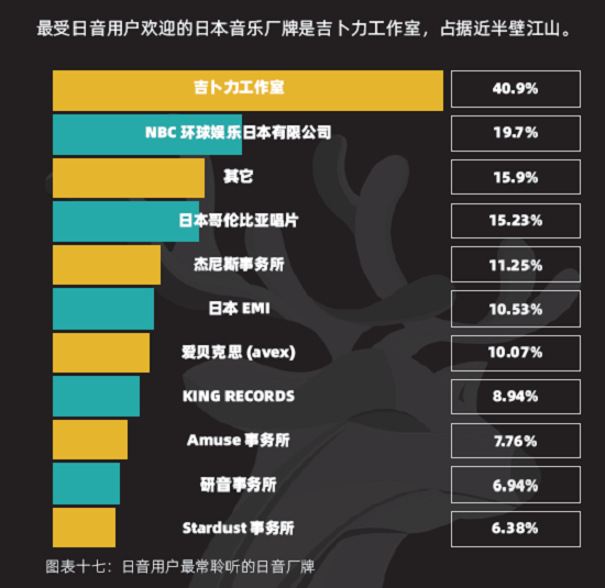 在关于日本音乐厂牌的调研中,吉卜力工作室支持占比达40.9%,远超其他厂牌成为最受用户喜爱的日音厂牌,其次为NBC环球娱乐日本有限公司。日音用户最常收听的音乐人前三为米津玄师、初音未来、RADWIMPS。