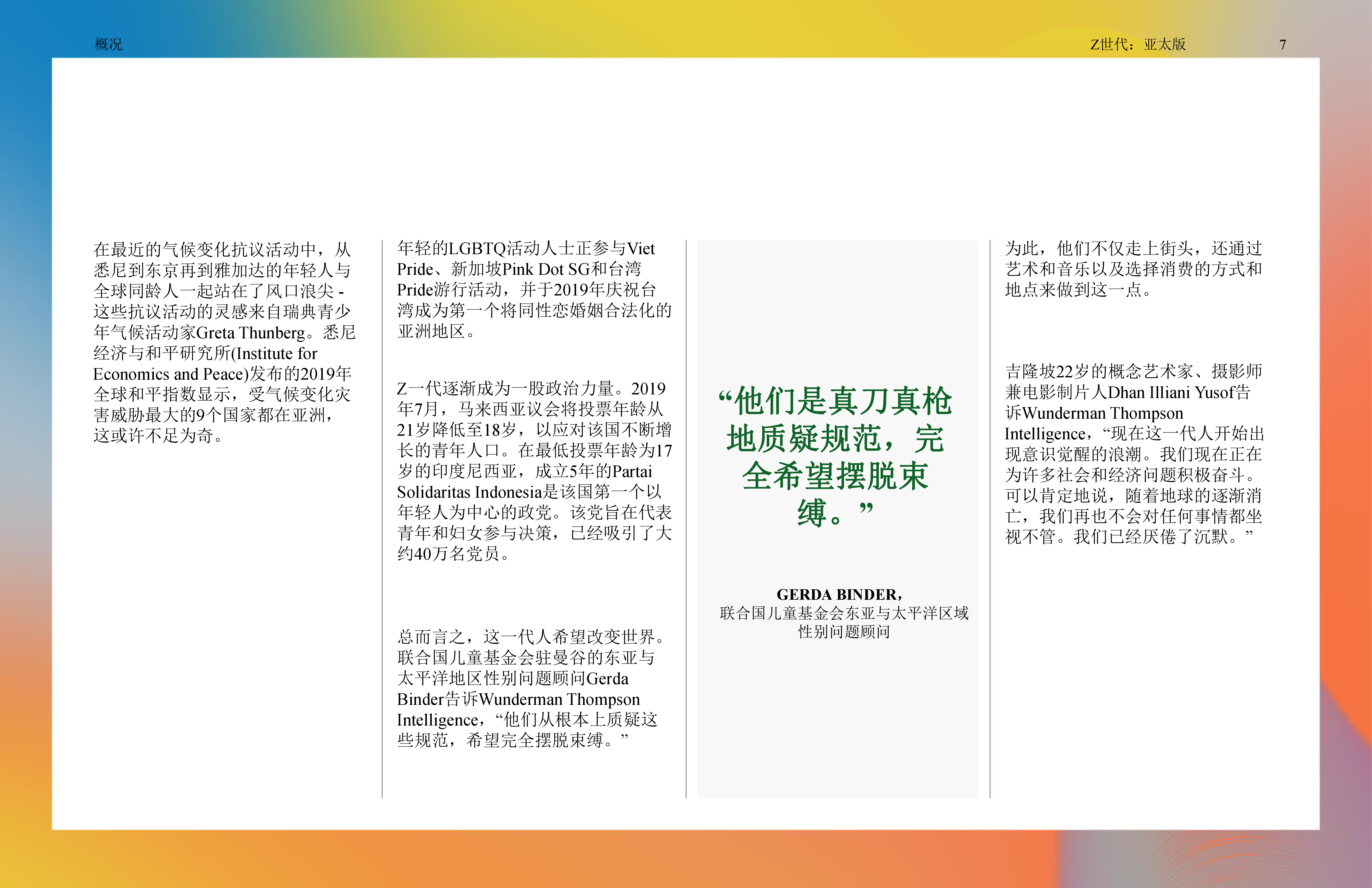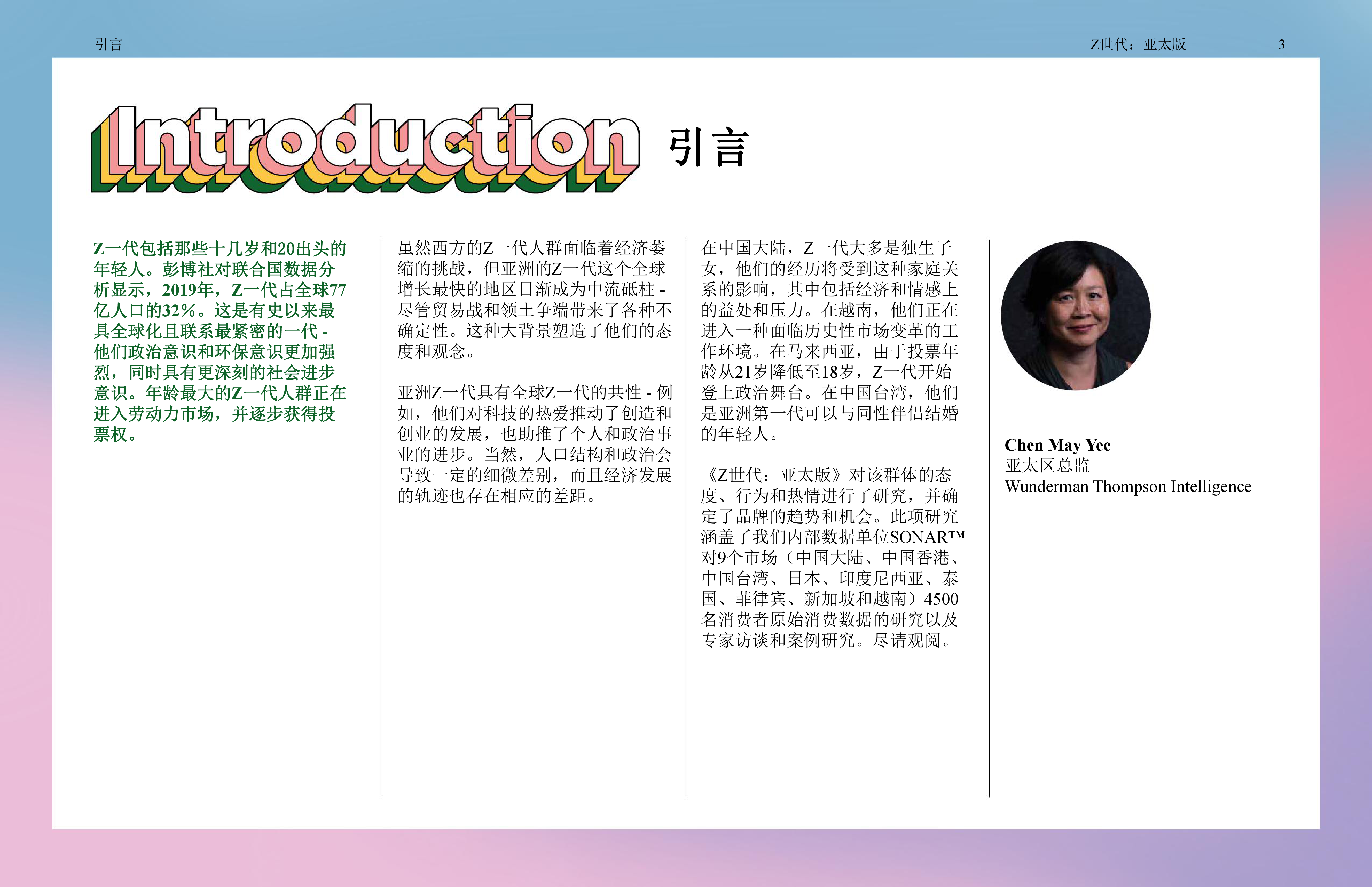 此报告基于Wunderman Thompson内部数据部门SONAR提供的消费者数据,通过对中国大陆、中国香港、中国台湾、印度尼西亚、日本、菲律宾、新加坡、越南和泰国在内九个地区内的4500位13岁至23岁的年轻消费者的行为进行分析研究,洞察这一代年轻人的消费动力,担忧及他们所崇拜的英雄精神,并从零售,金融,科技技术和媒体等层面解读潜在品牌机会。