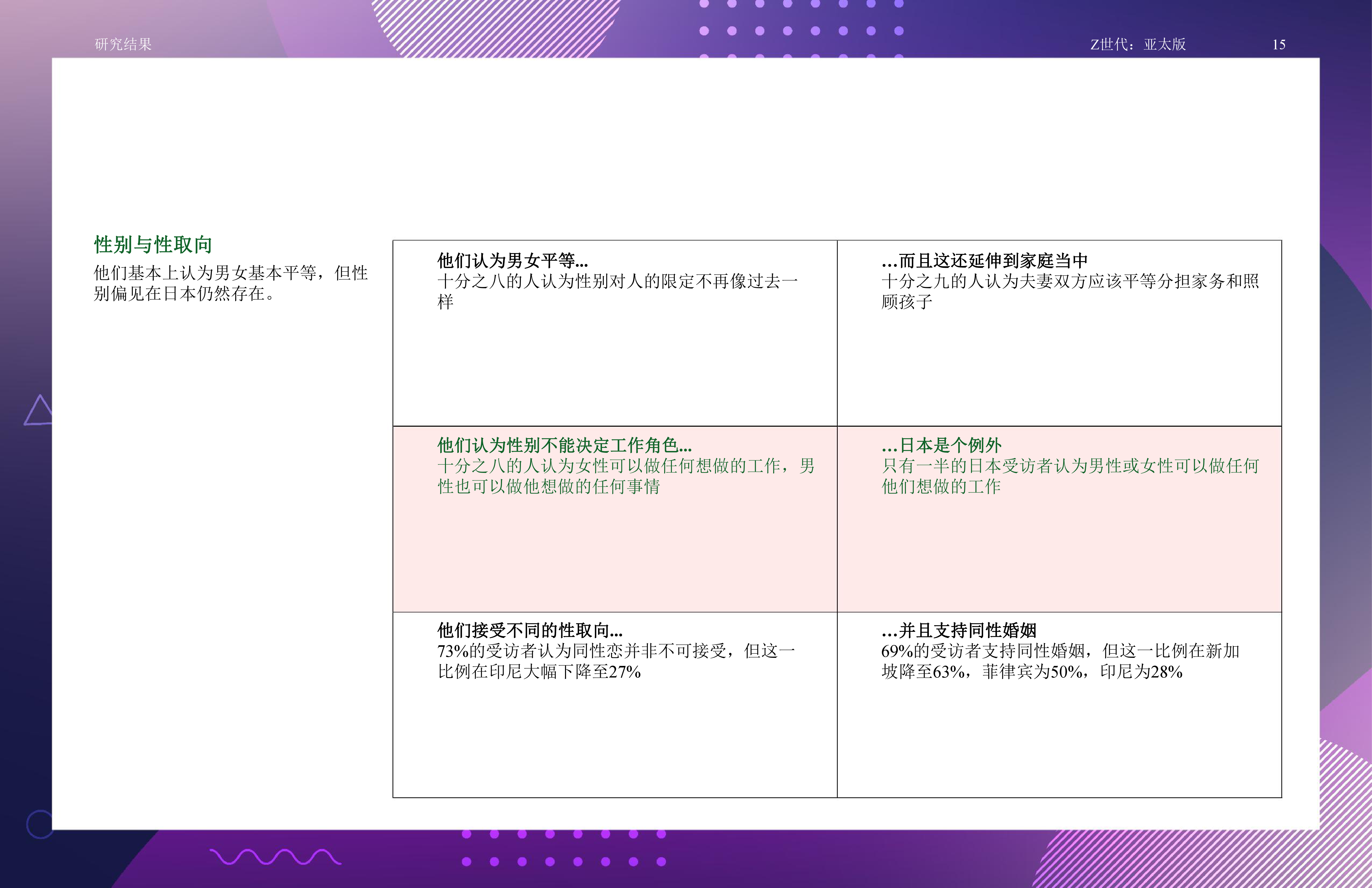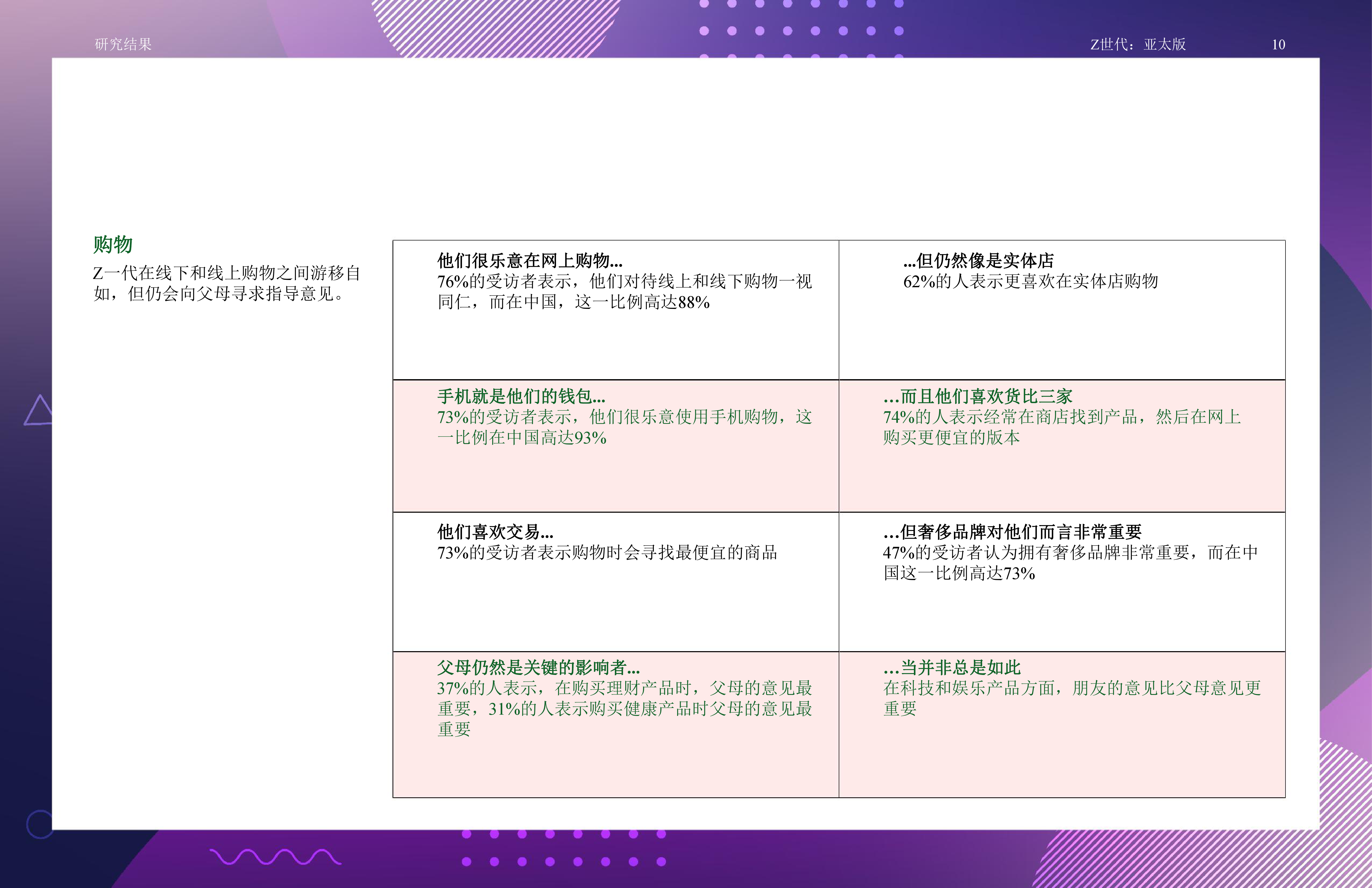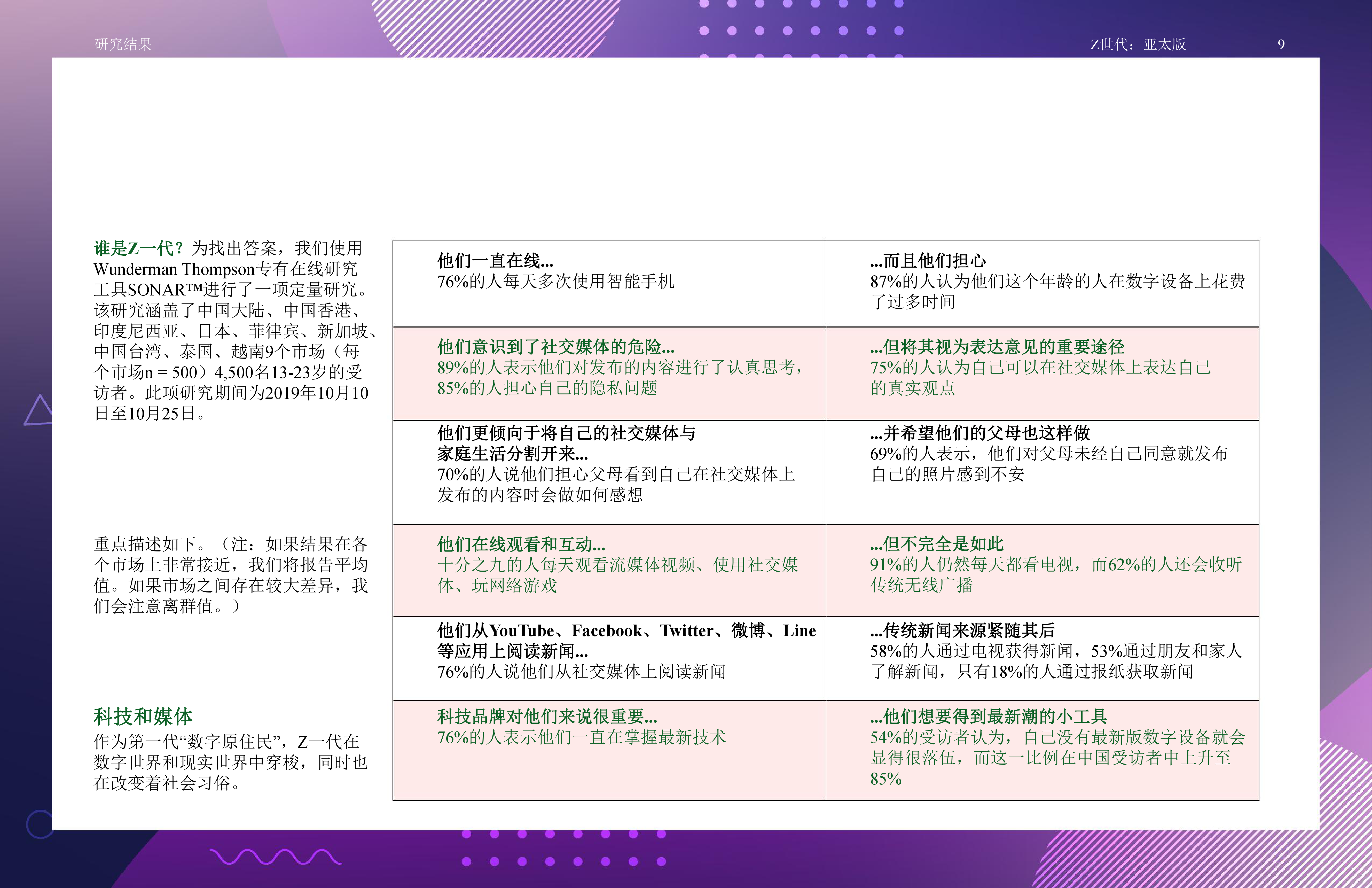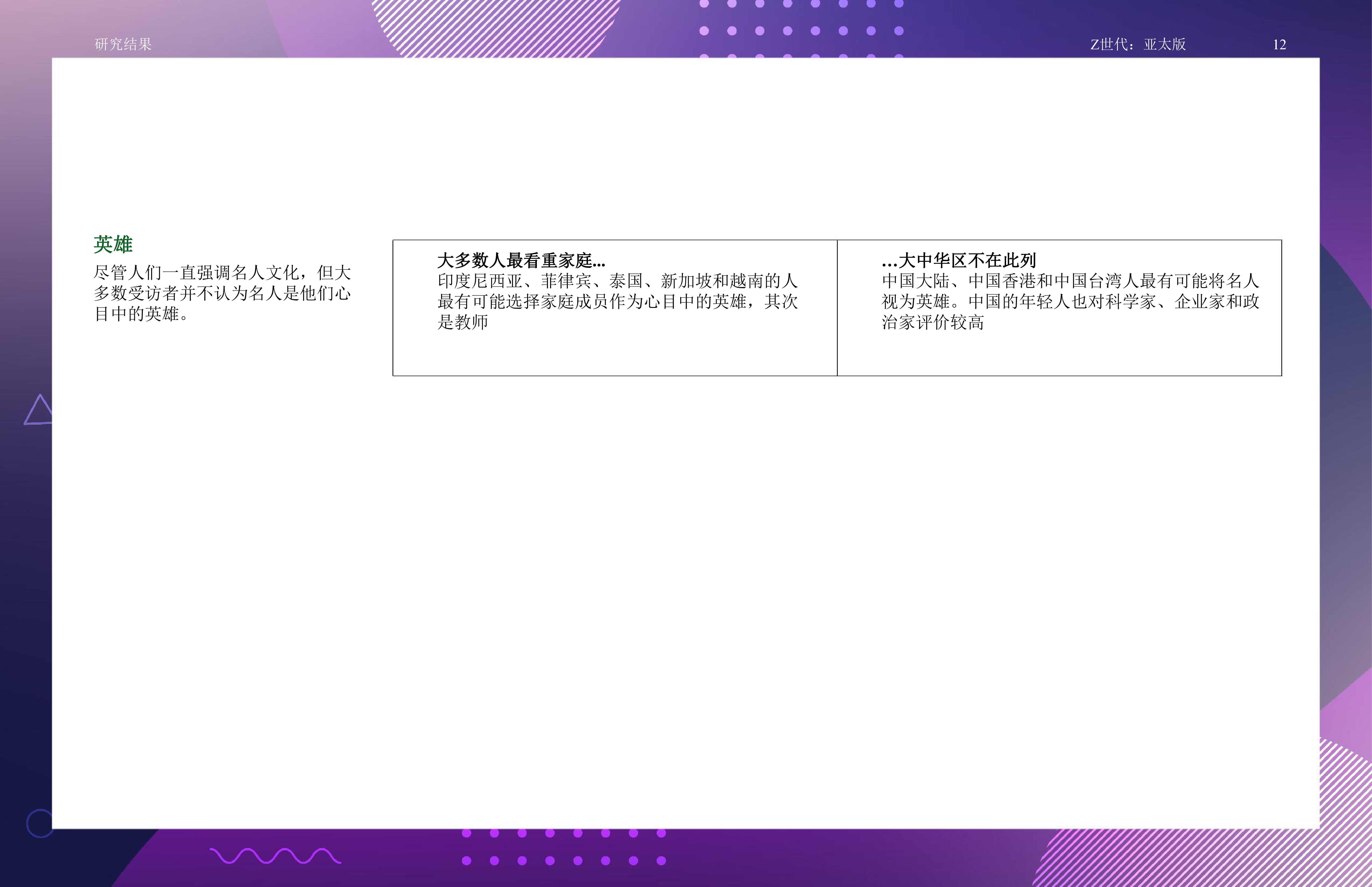 在这份报告中,我们将Z一代定义为90年代中期到21世纪初之间出生的一代。他们既是当今的青少年,又是开始进入职场的年轻人。在西方,Z一代被描述为没有目标的千禧一代或Y一代;亚太地区幅员辽阔,全球60%的人口集中于此,所以整体形势更加微妙。