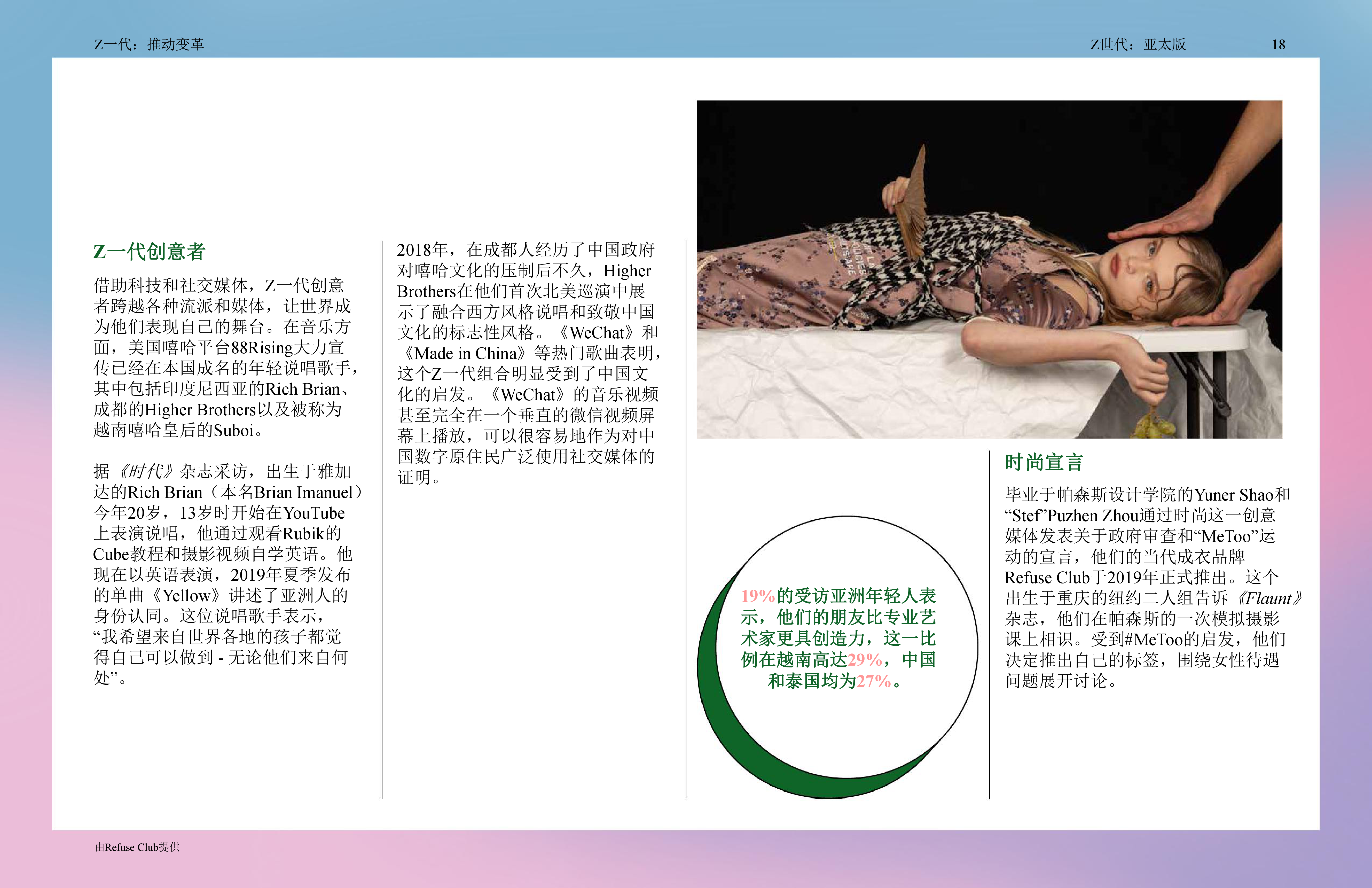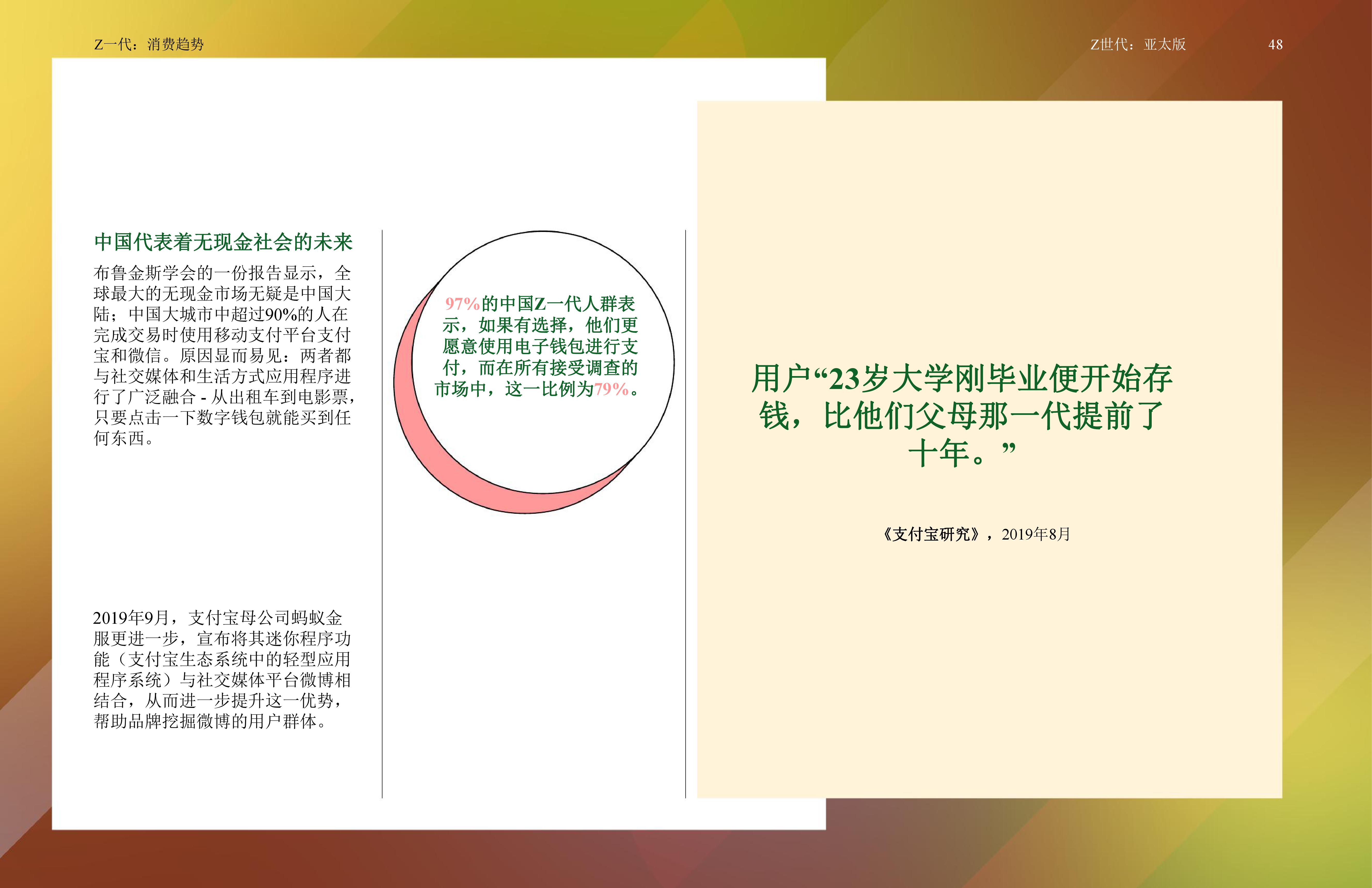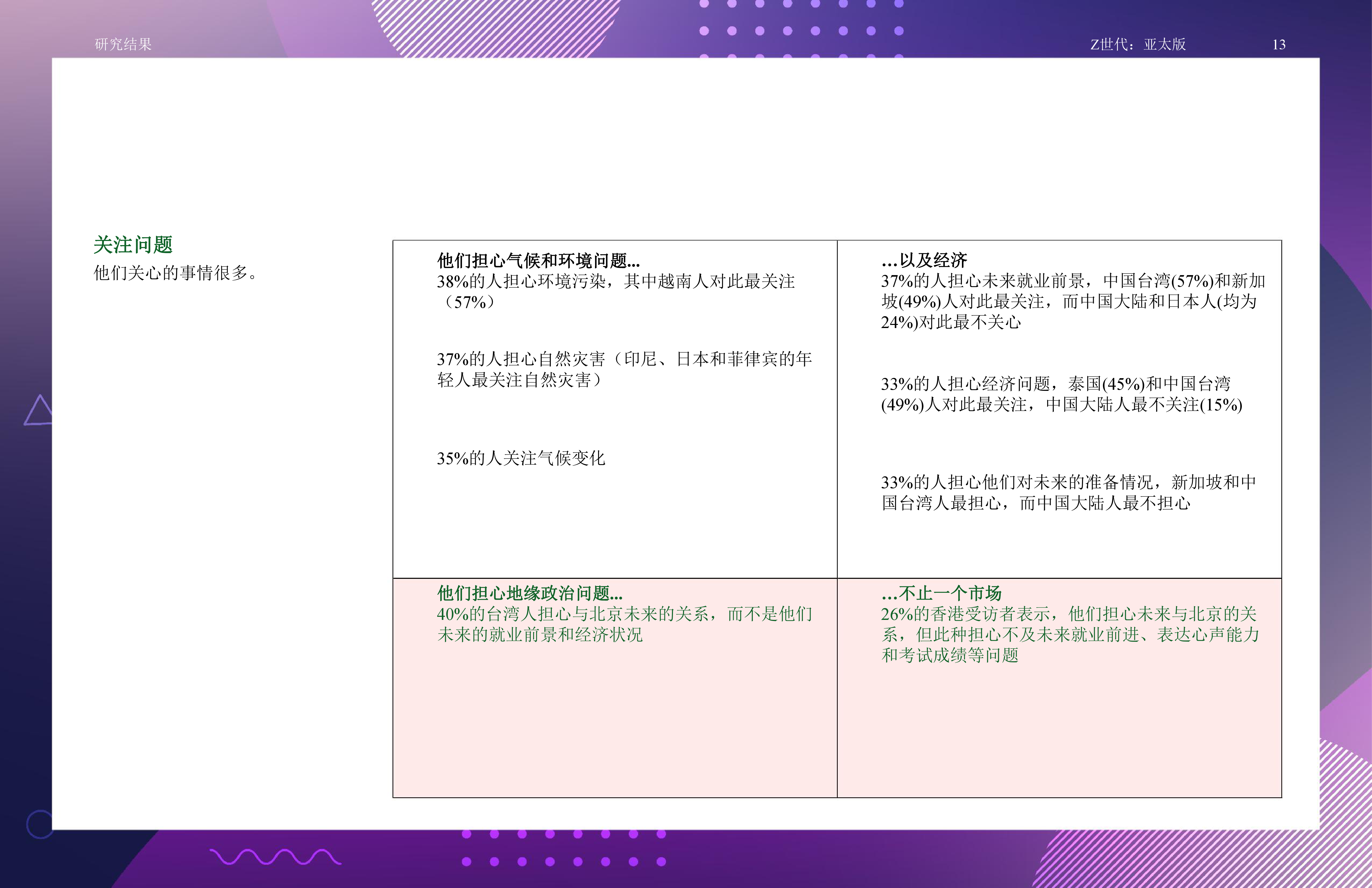 在这份报告中,我们将Z一代定义为90年代中期到21世纪初之间出生的一代。他们既是当今的青少年,又是开始进入职场的年轻人。在西方,Z一代被描述为没有目标的千禧一代或Y一代;亚太地区幅员辽阔,全球60%的人口集中于此,所以整体形势更加微妙。
