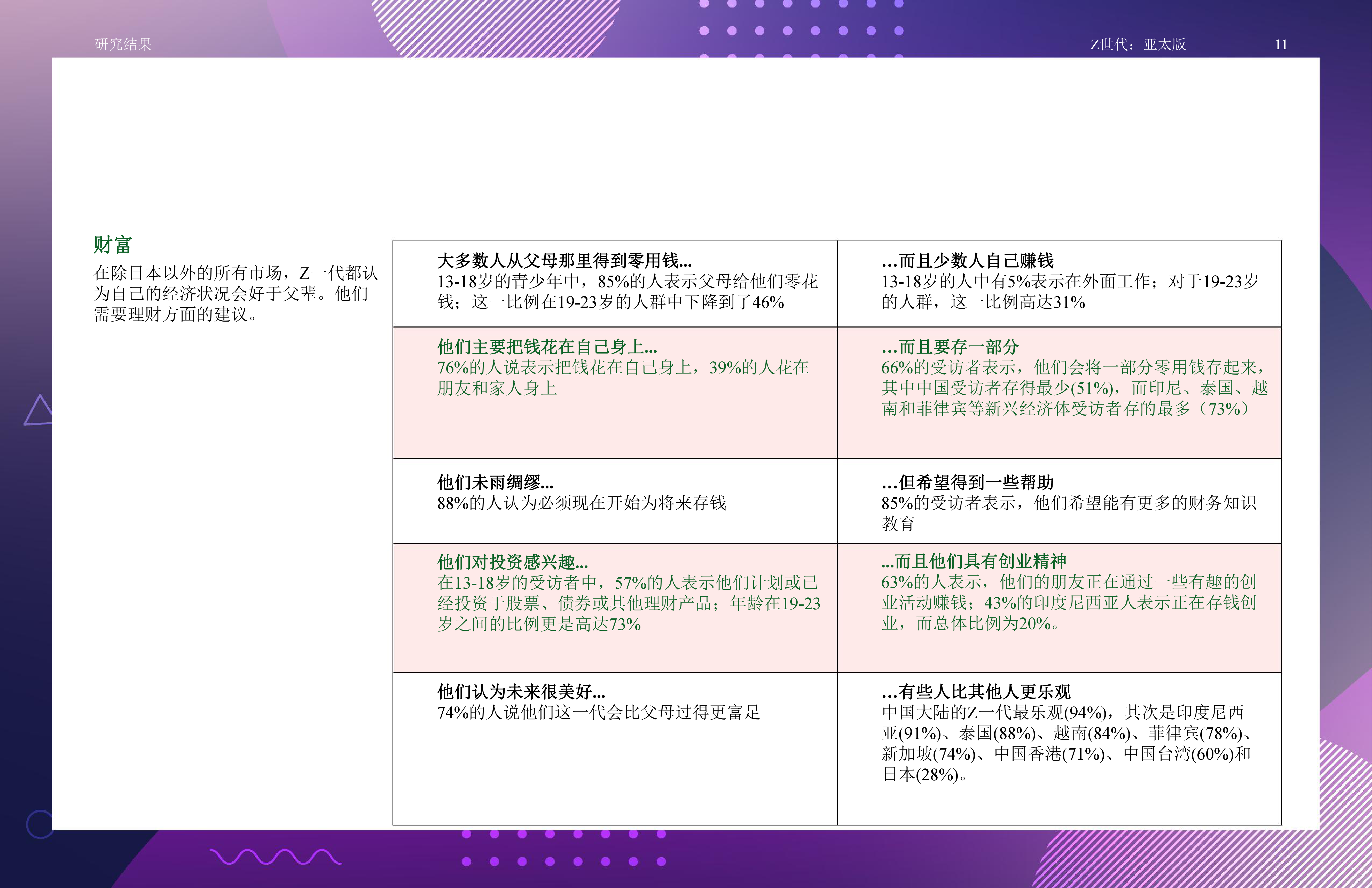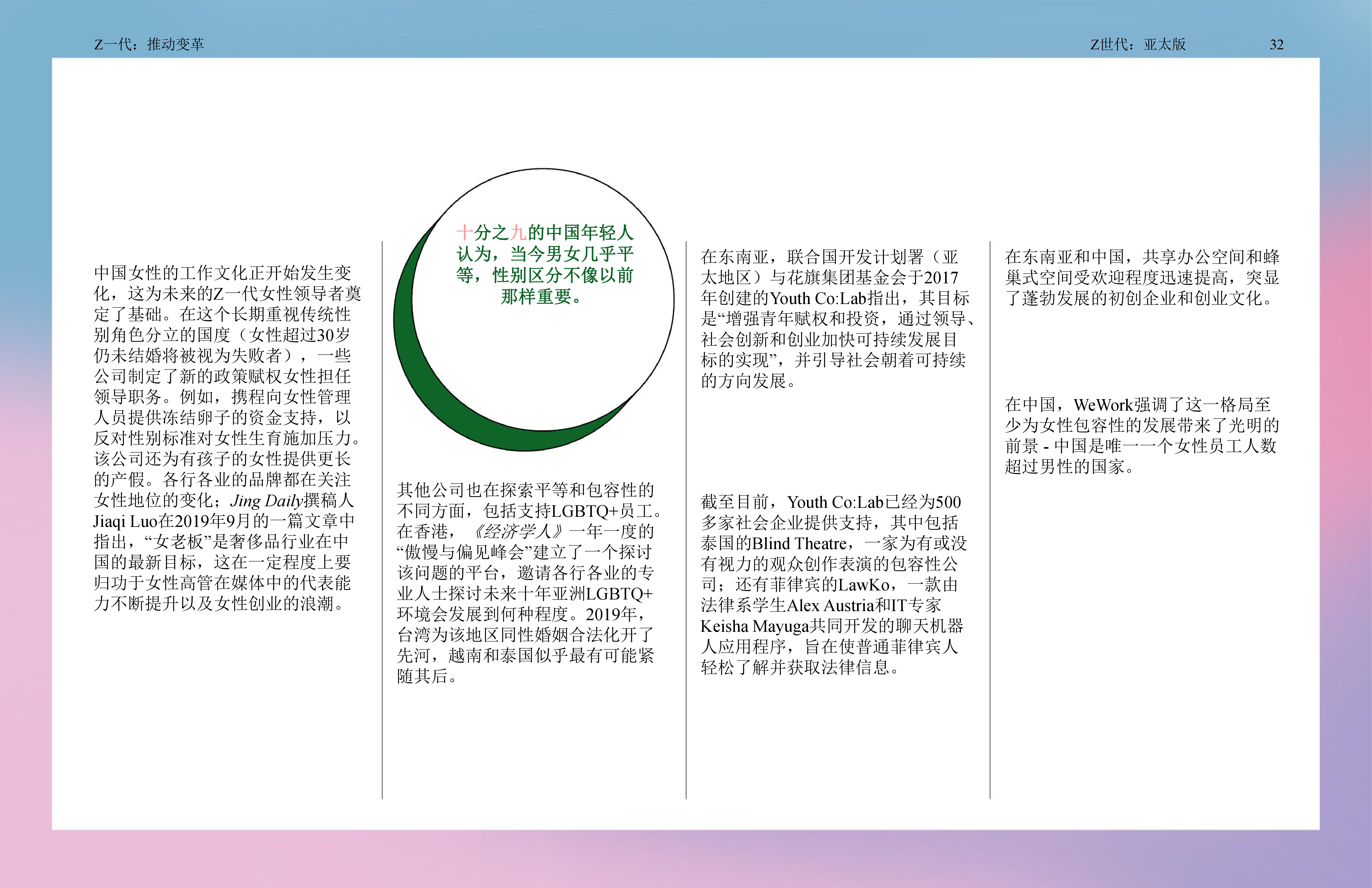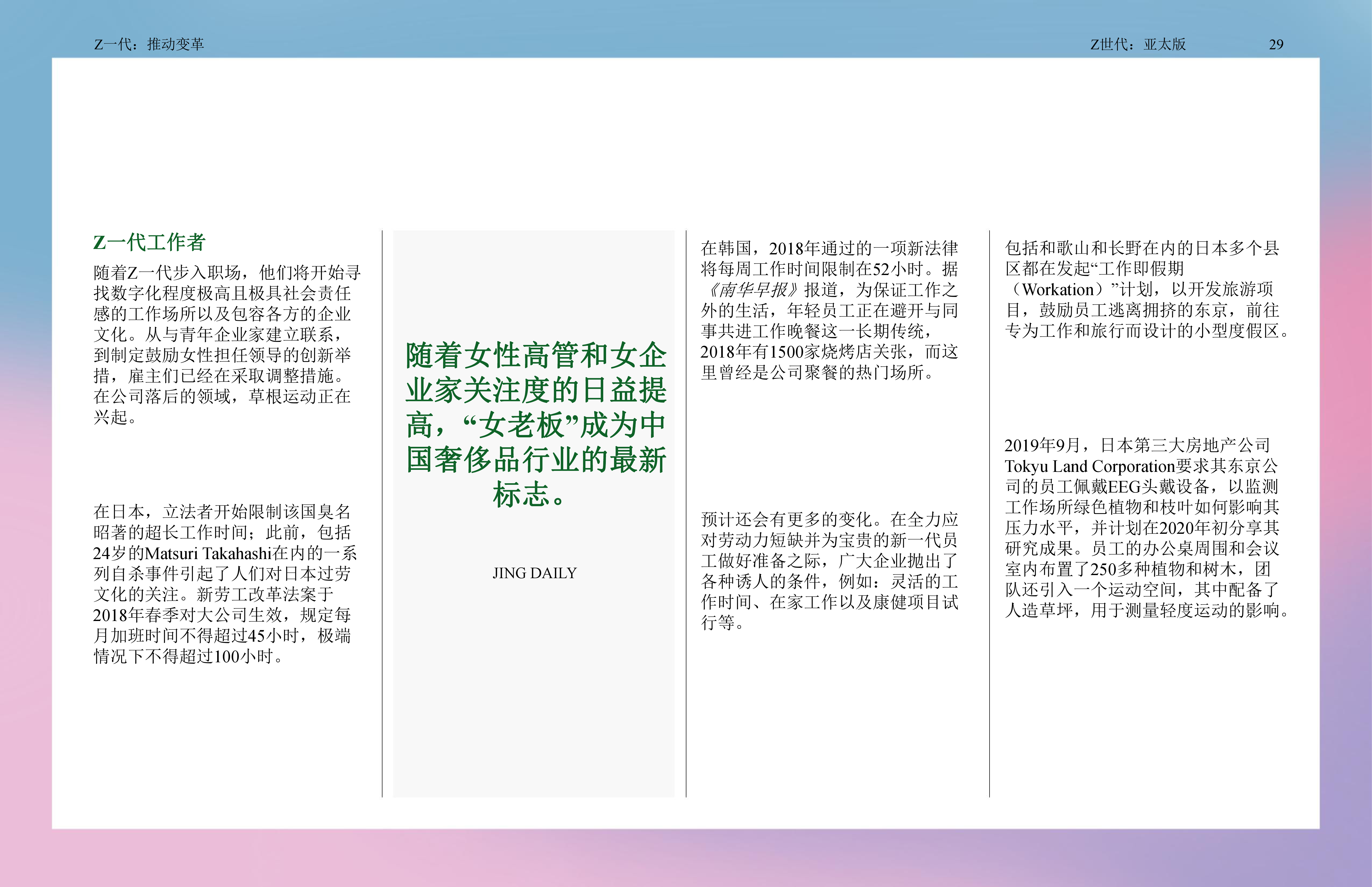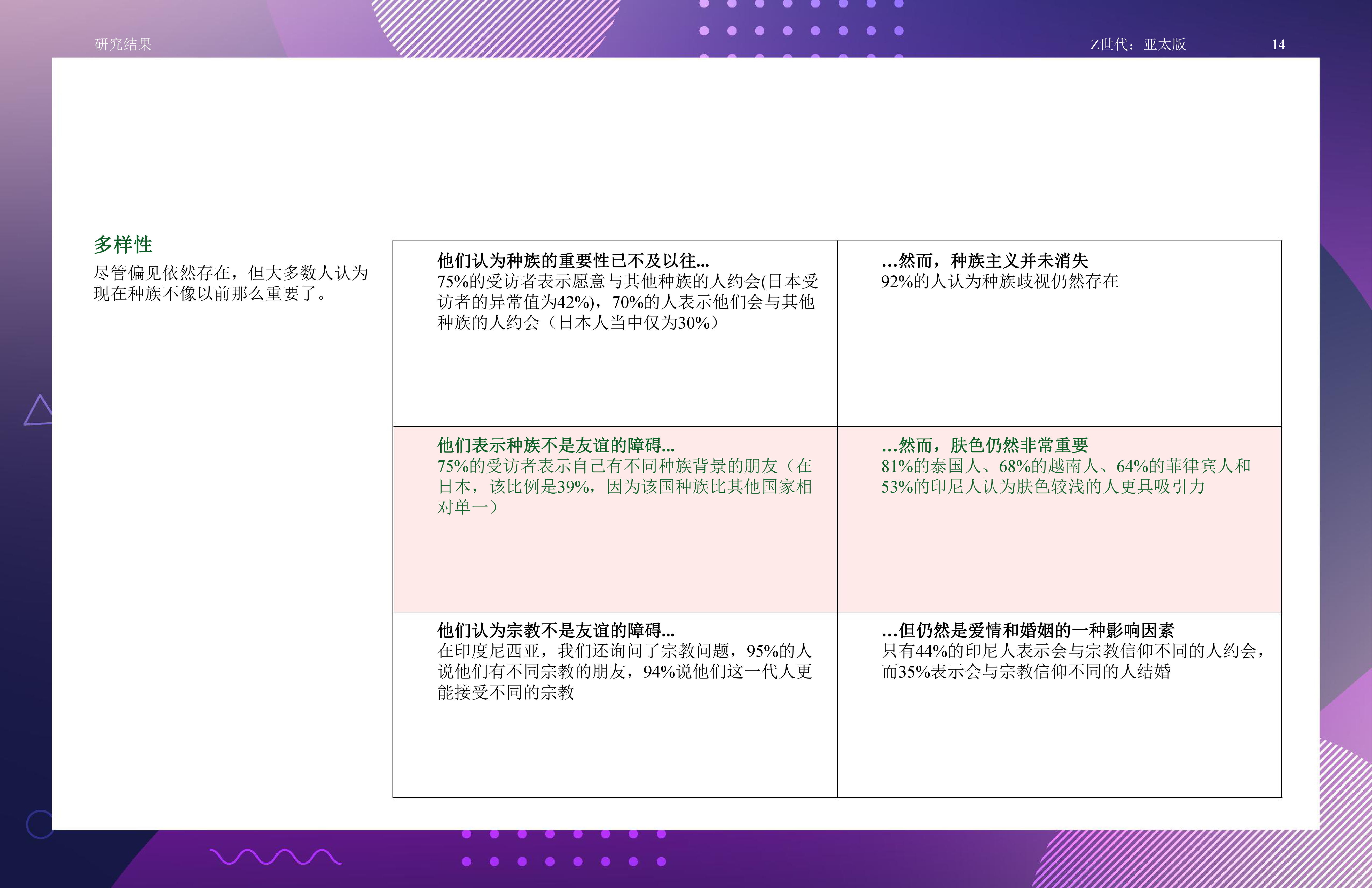 在这份报告中,我们将Z一代定义为90年代中期到21世纪初之间出生的一代。他们既是当今的青少年,又是开始进入职场的年轻人。在西方,Z一代被描述为没有目标的千禧一代或Y一代;亚太地区幅员辽阔,全球60%的人口集中于此,所以整体形势更加微妙。