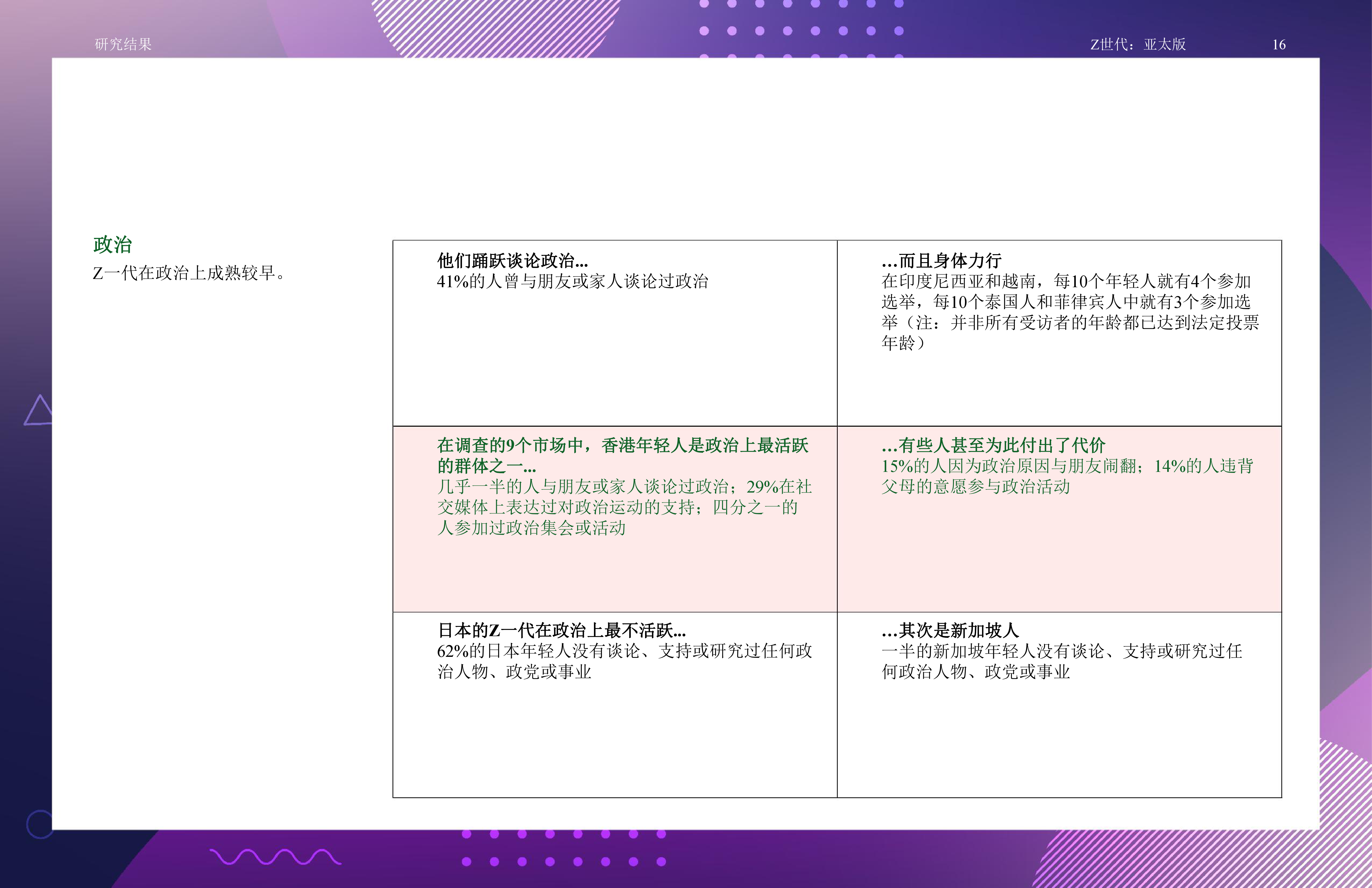 Z一代受国民经济影响 – 既有中国声势浩大的市场实验向纵深发展,又有越南开始向全世界打开国门,还有日本经济的长期停滞。此外,他们还受到文化和宗教的影响 – 以马来西亚和印度尼西亚为例,随着世界上许多其他地区日益世俗化。当然,我们也看到一些共性。尽管在成长过程中经历了各种变革,Z一代仍认为将来基本上会朝着积极的方向发展;在许多情况下,他们正在使用(实际上是塑造)现在可以使用的技术工具。