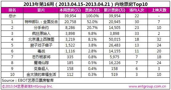 据EBOT艺恩日票房智库数据显示,内地电影市场2013年第16周(2013.04.15-2013.04.21)周总票房约4亿元,环比上升31%,本周观影人次1113万。《特种部队2》以约2.07亿稳占冠军宝座,累计点映达2.09亿;《分手合约》本周收8286万居第二,累计1.45亿;梦工厂新作《疯狂原始人》入市2天收3898万排第三;《北京遇上西雅图》再入3219万位居第四,累计过5亿,在新片冲击下表现渐缓。本周国产片份额降至约37%。