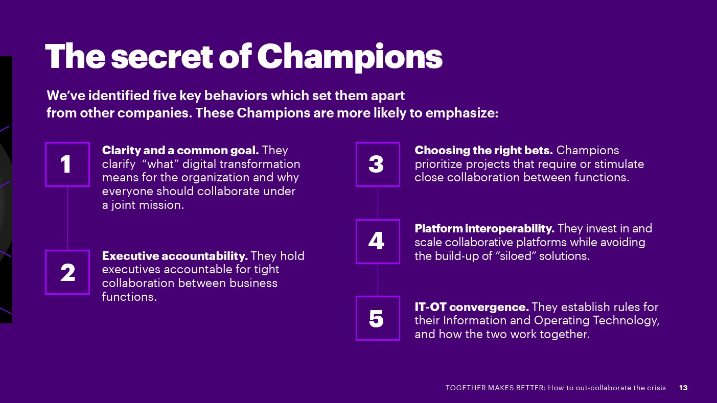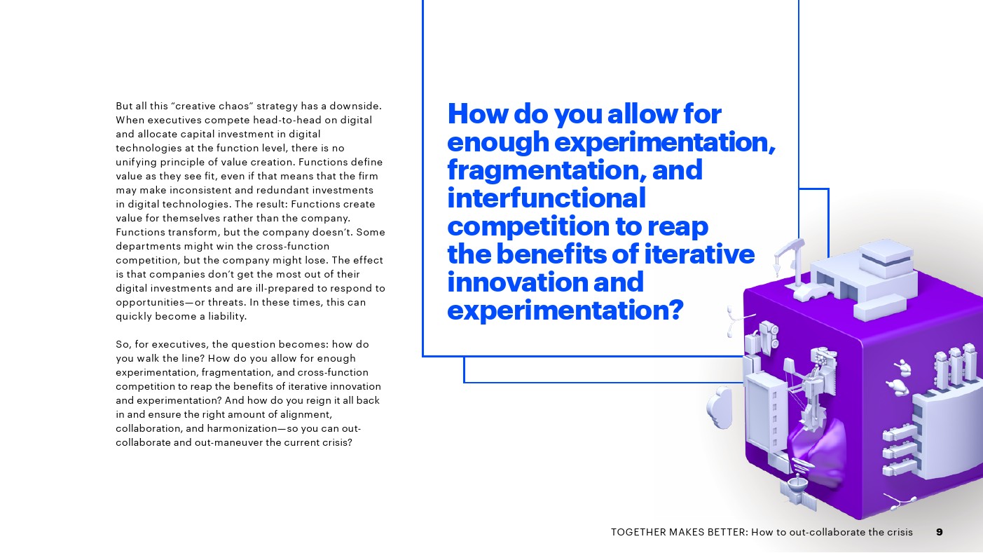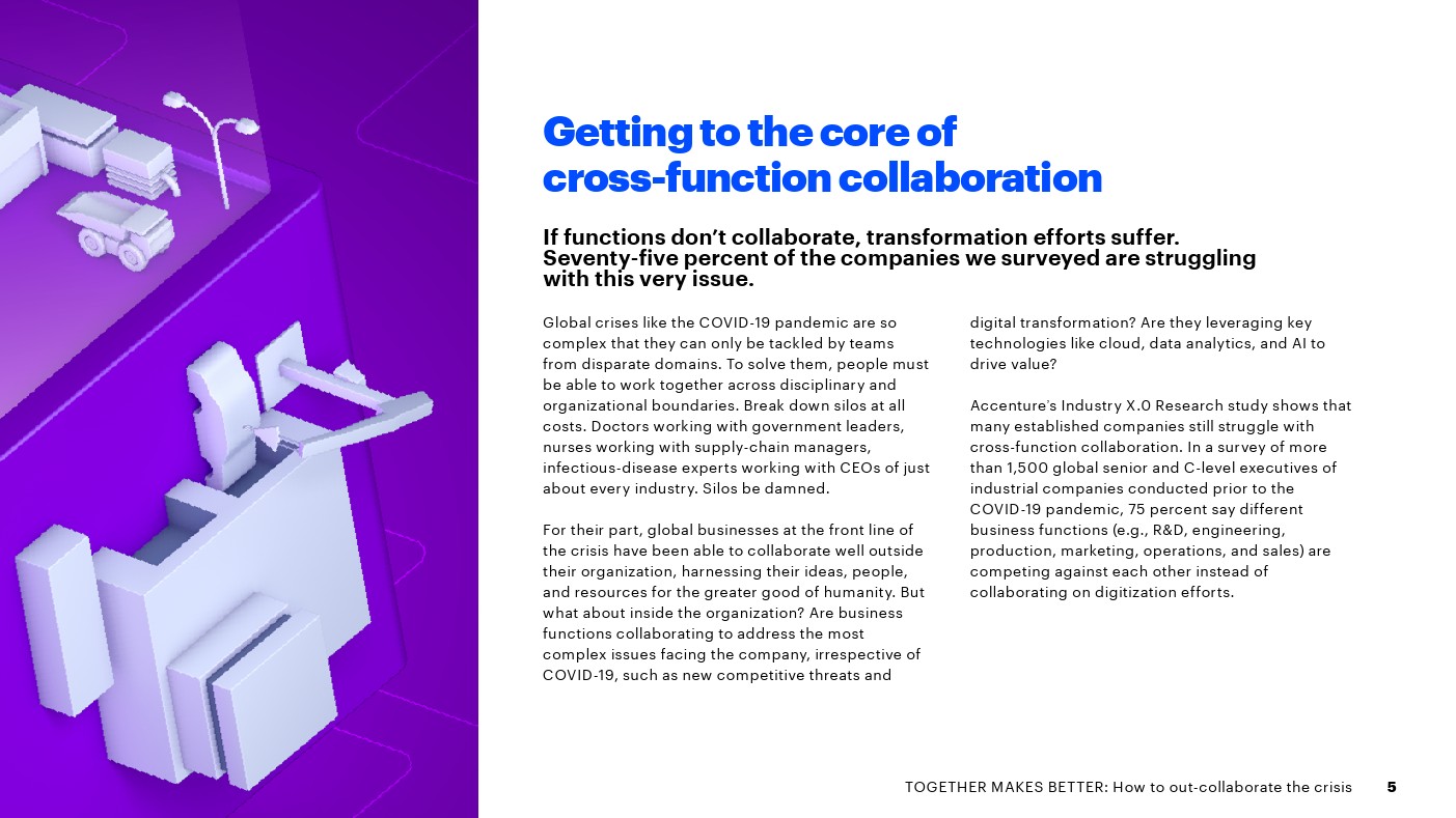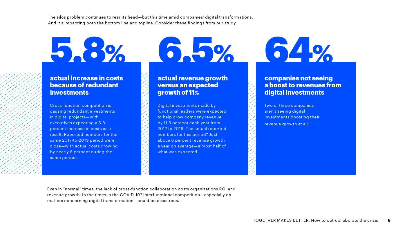 埃森哲发布了新报告“合则两利——如何摆脱危机”。75%的高管表示,各部门在数字化方面是竞争而不是合作关系,这增加了成本,吞噬了预期的收入增长。
