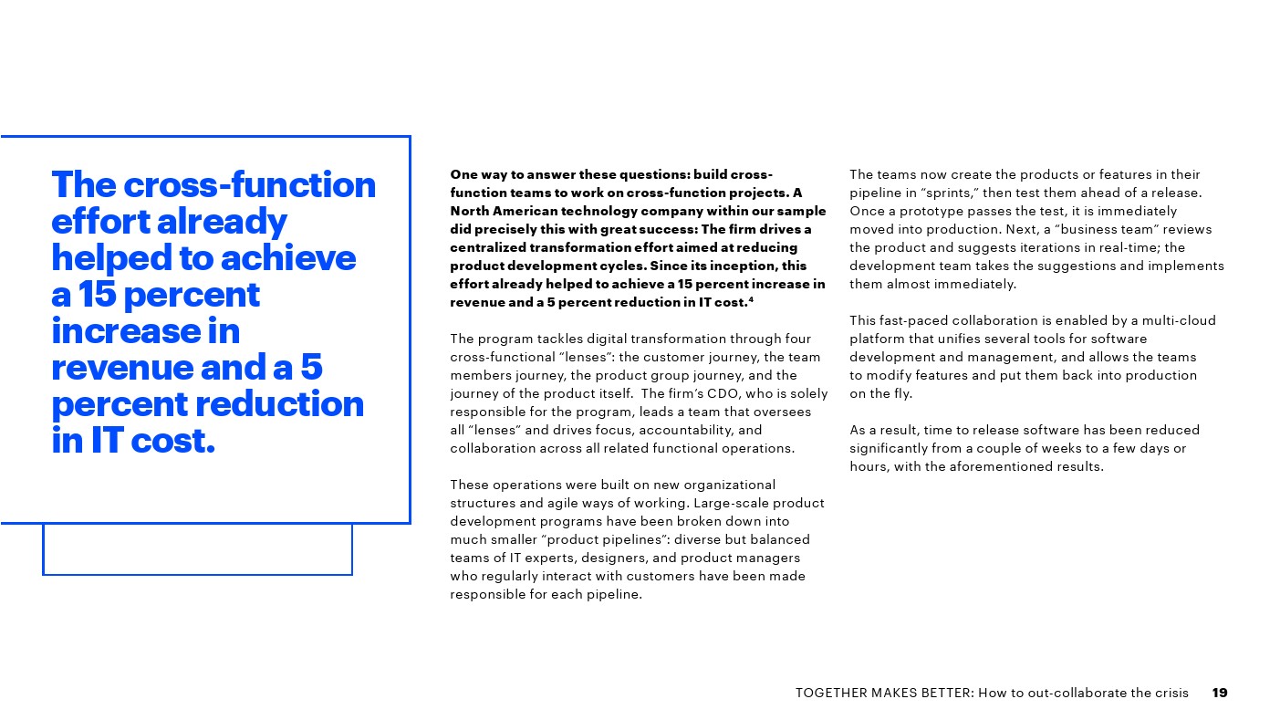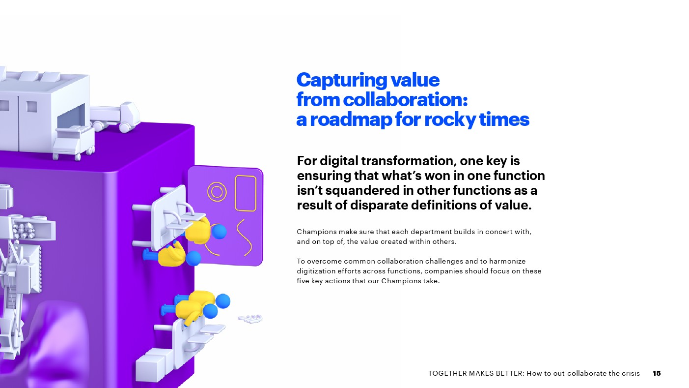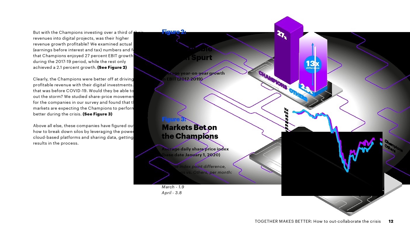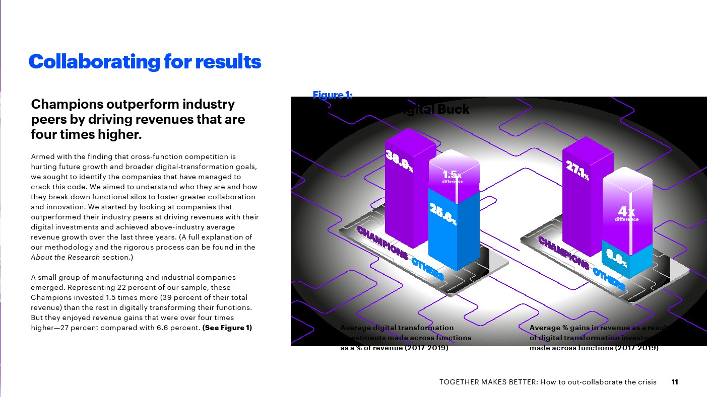 一小部分公司(22%)因其内部协作方式从数字中获得更高价值而脱颖而出。2017-2019年间,这些“冠军”通过将业务职能数字化,取得了明显更好的财务业绩: