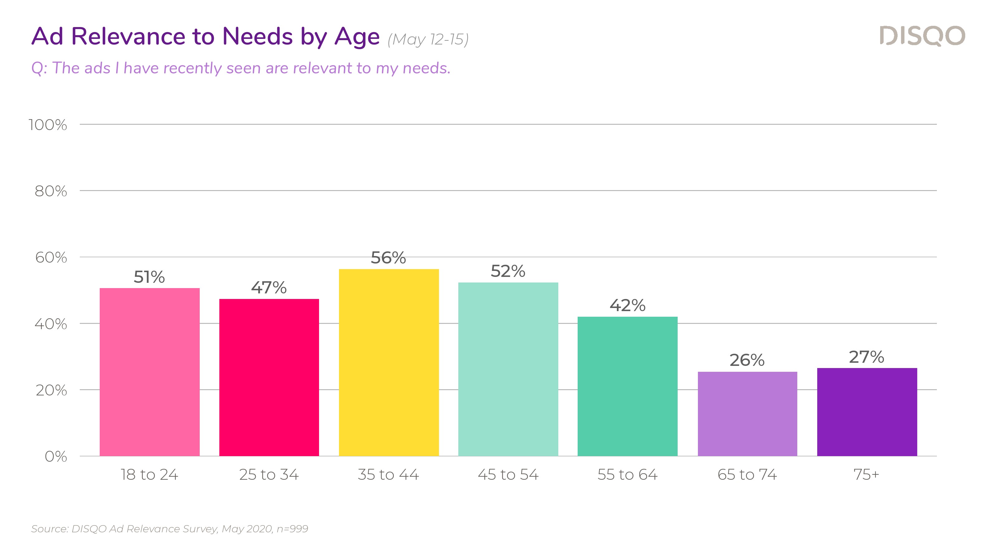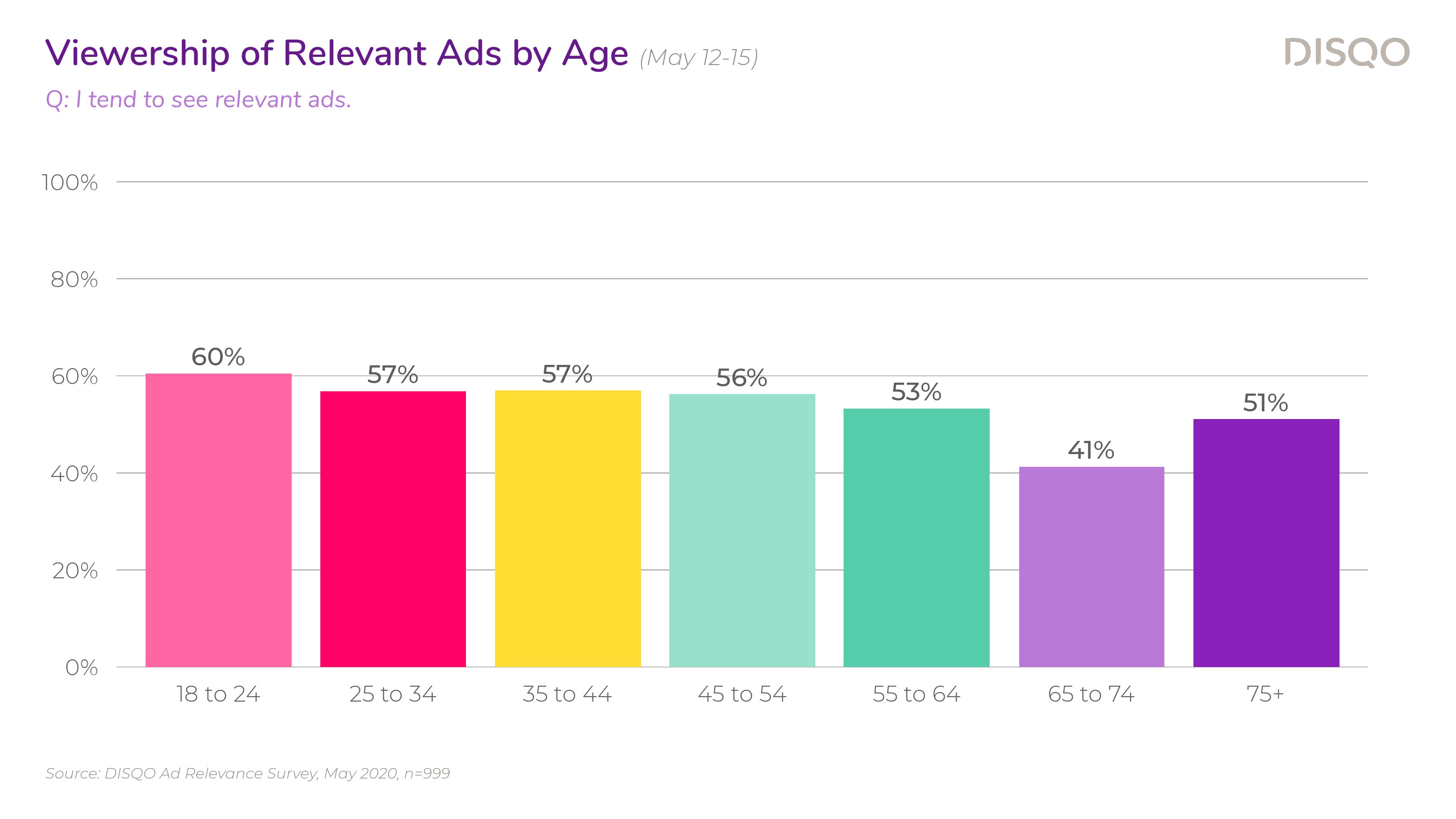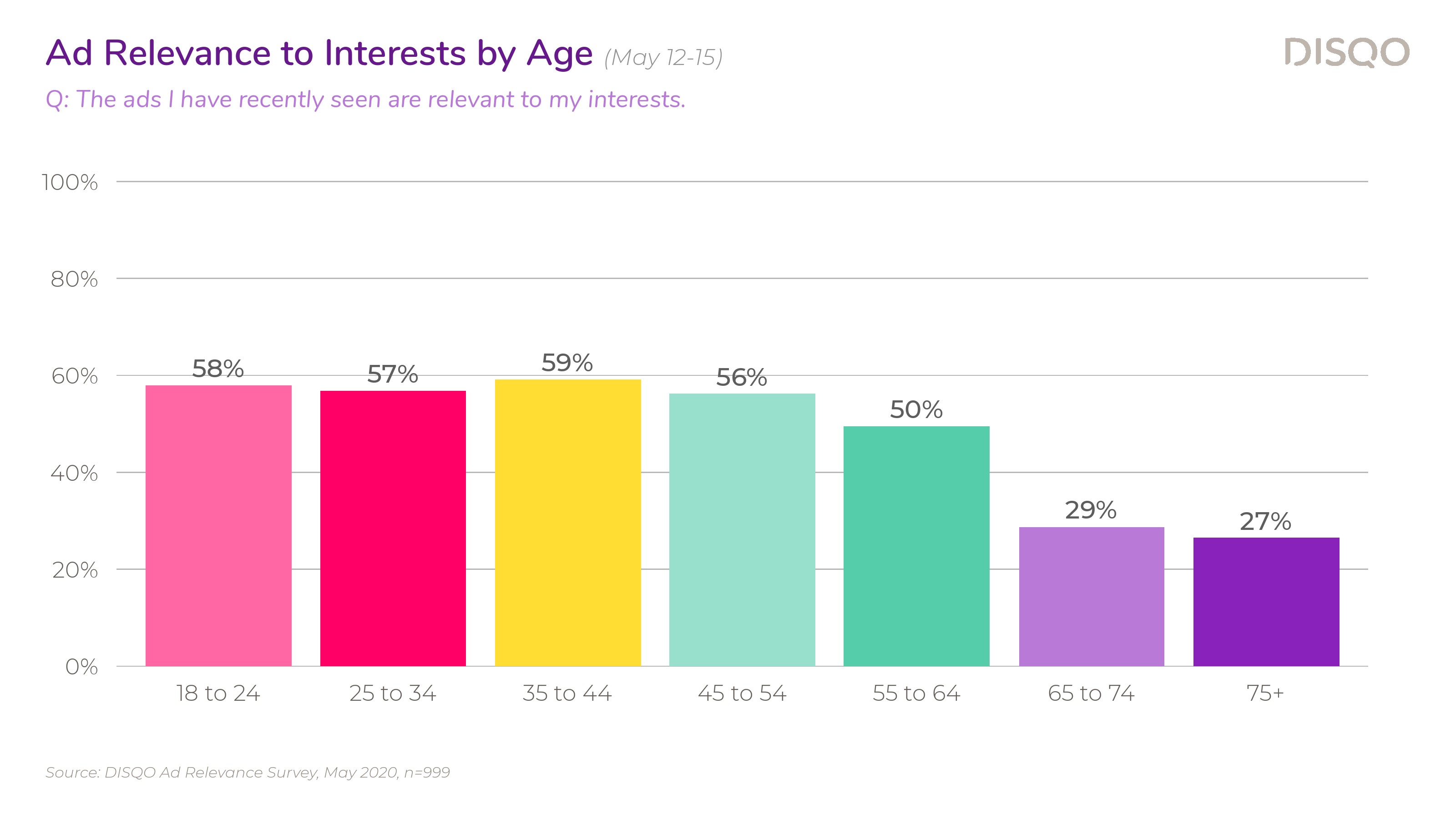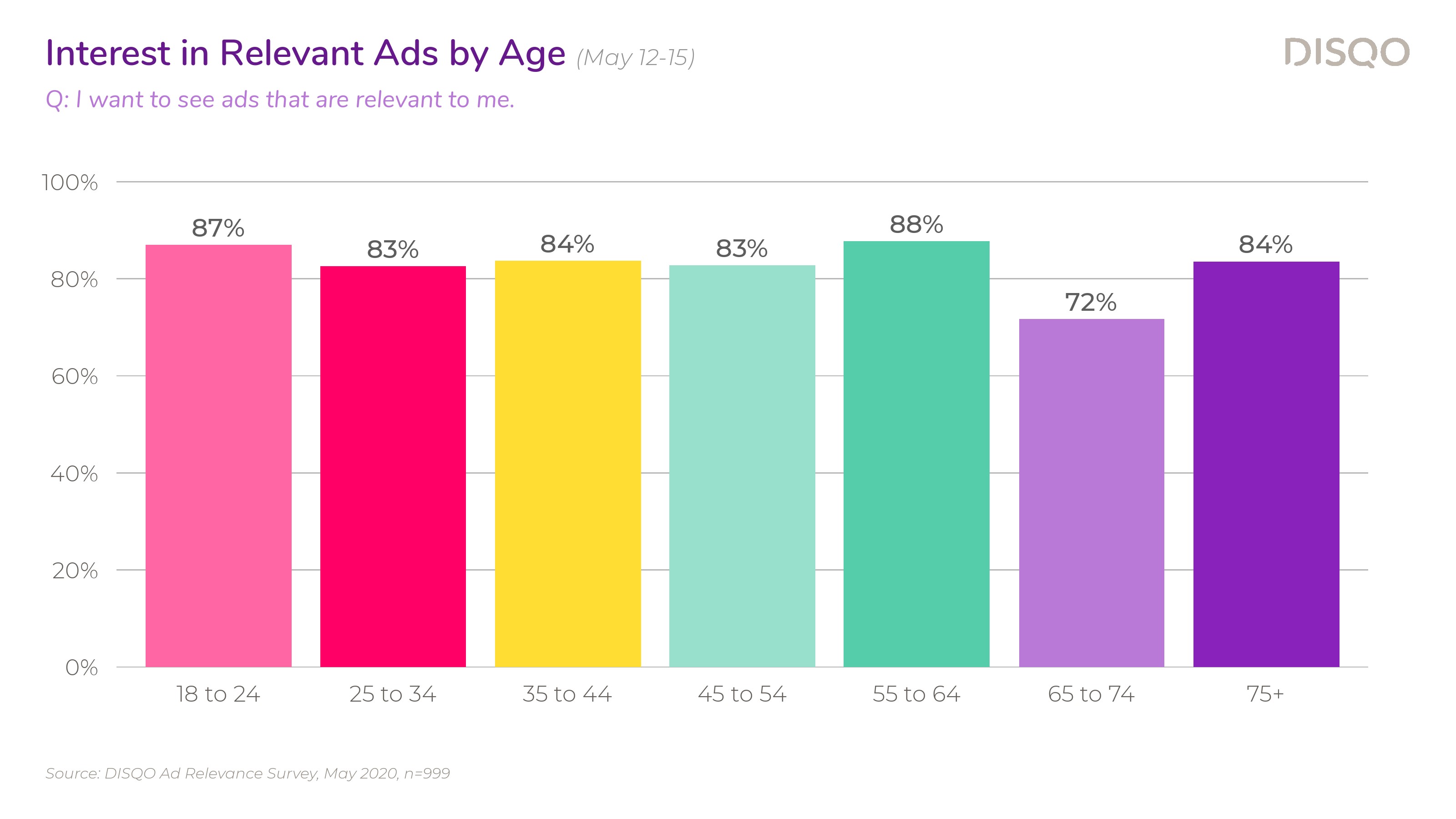 DISQO调查了大约1000名消费者,43%的受访者强烈同意他们希望看到与自己相关的广告,还有38%的受访者表示同意。这种积极的情绪在所有年龄段都存在;除了65岁-74岁(72%),其他年龄段希望看到相关广告的比例在83%-88%之间。