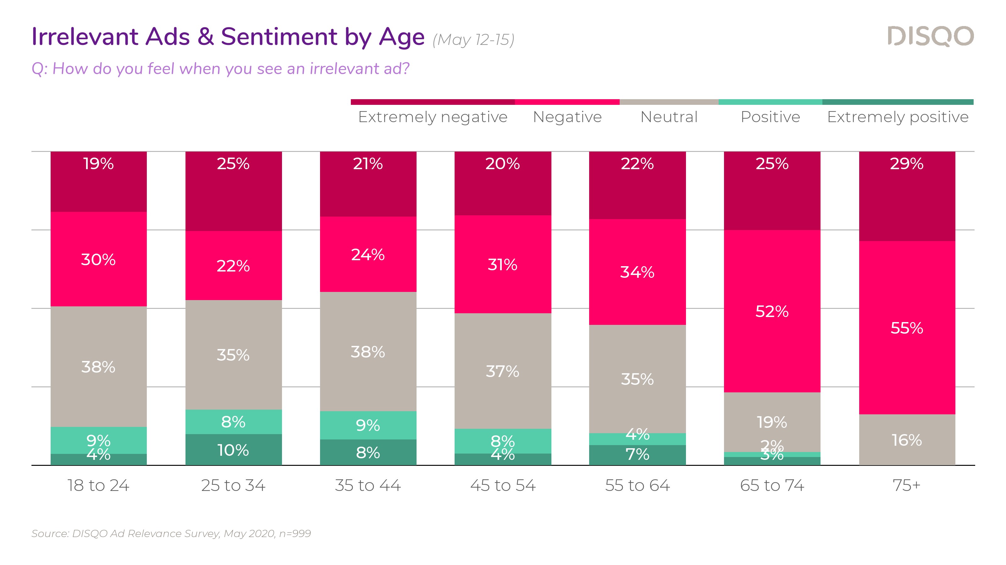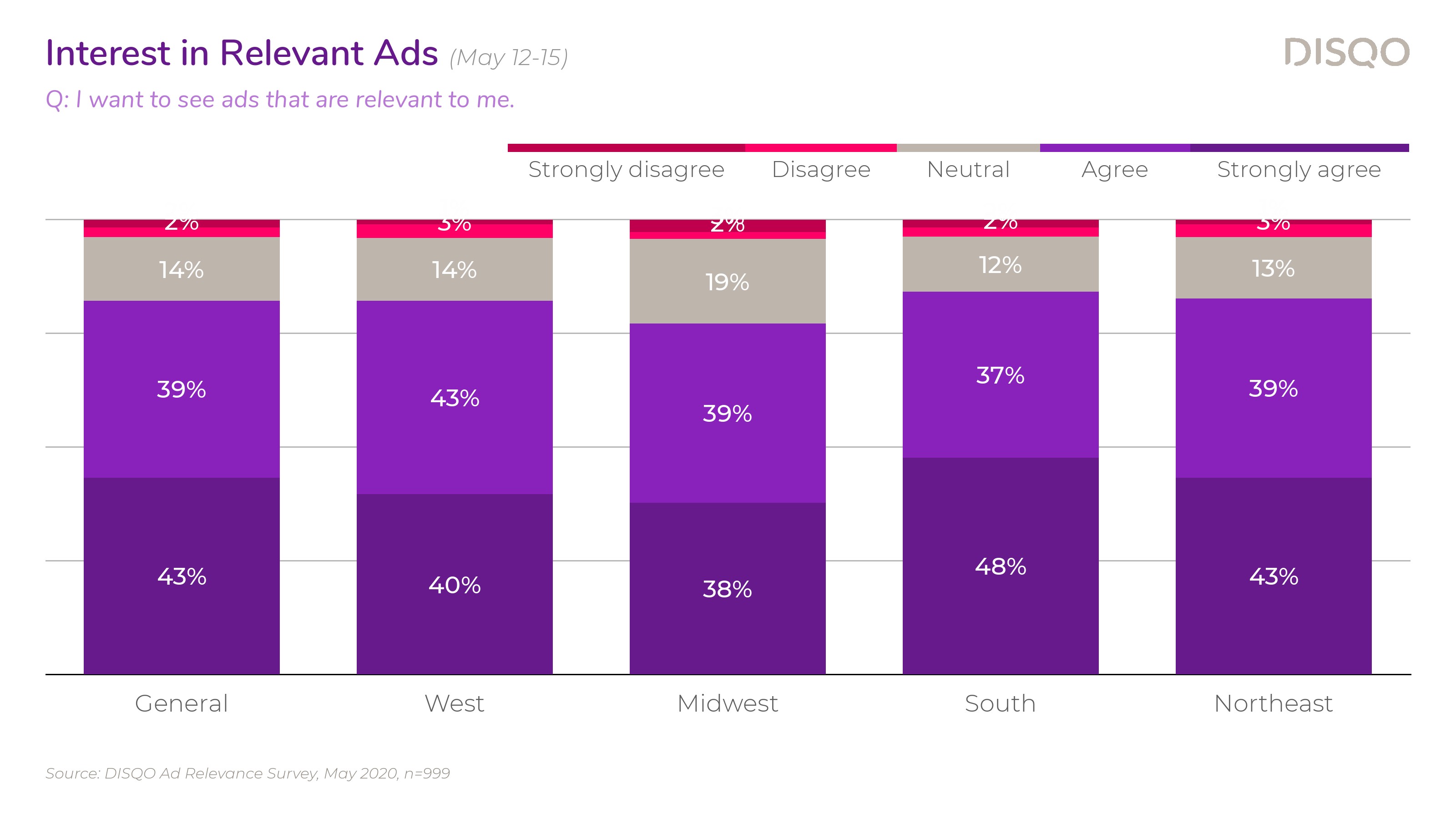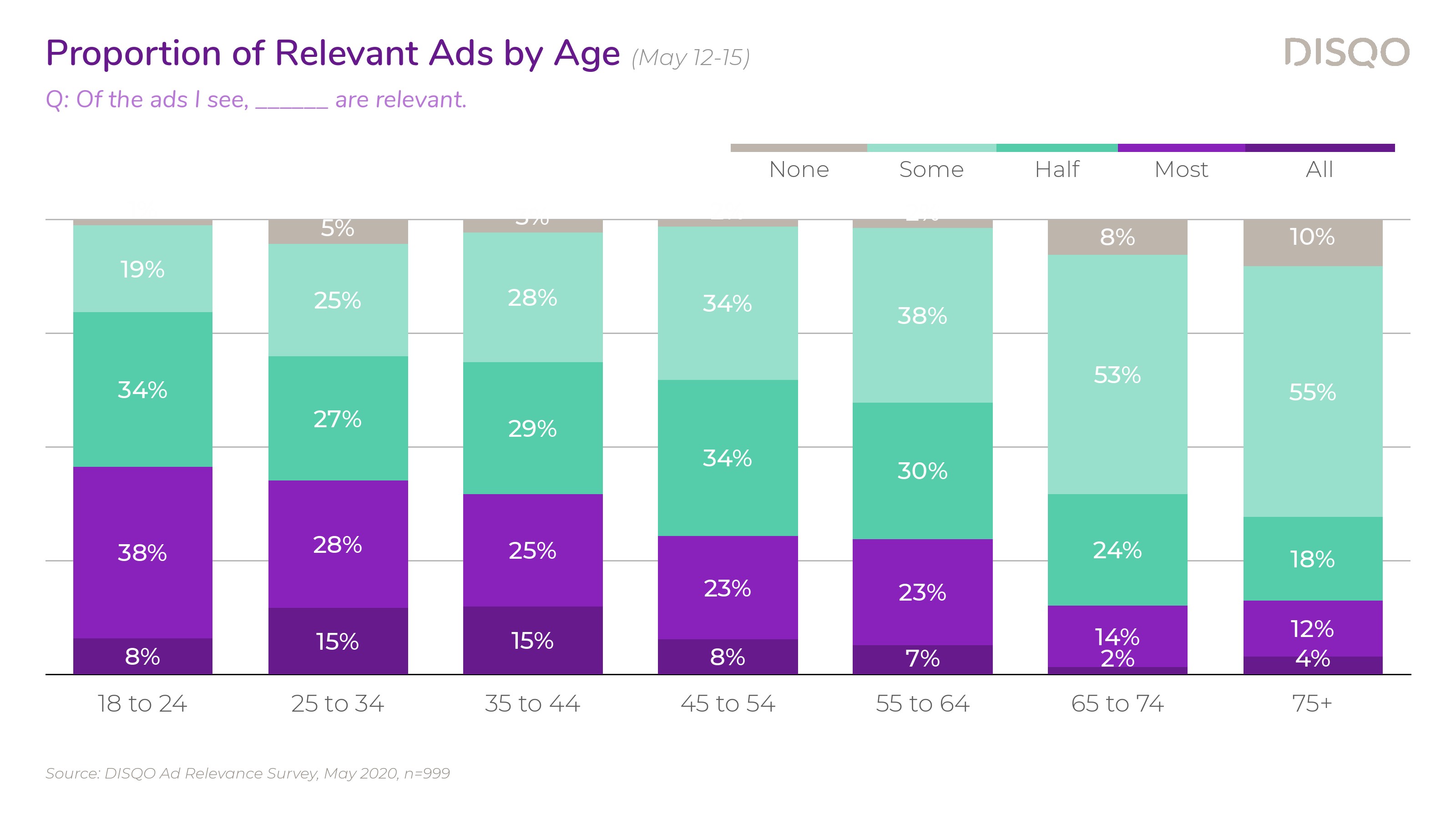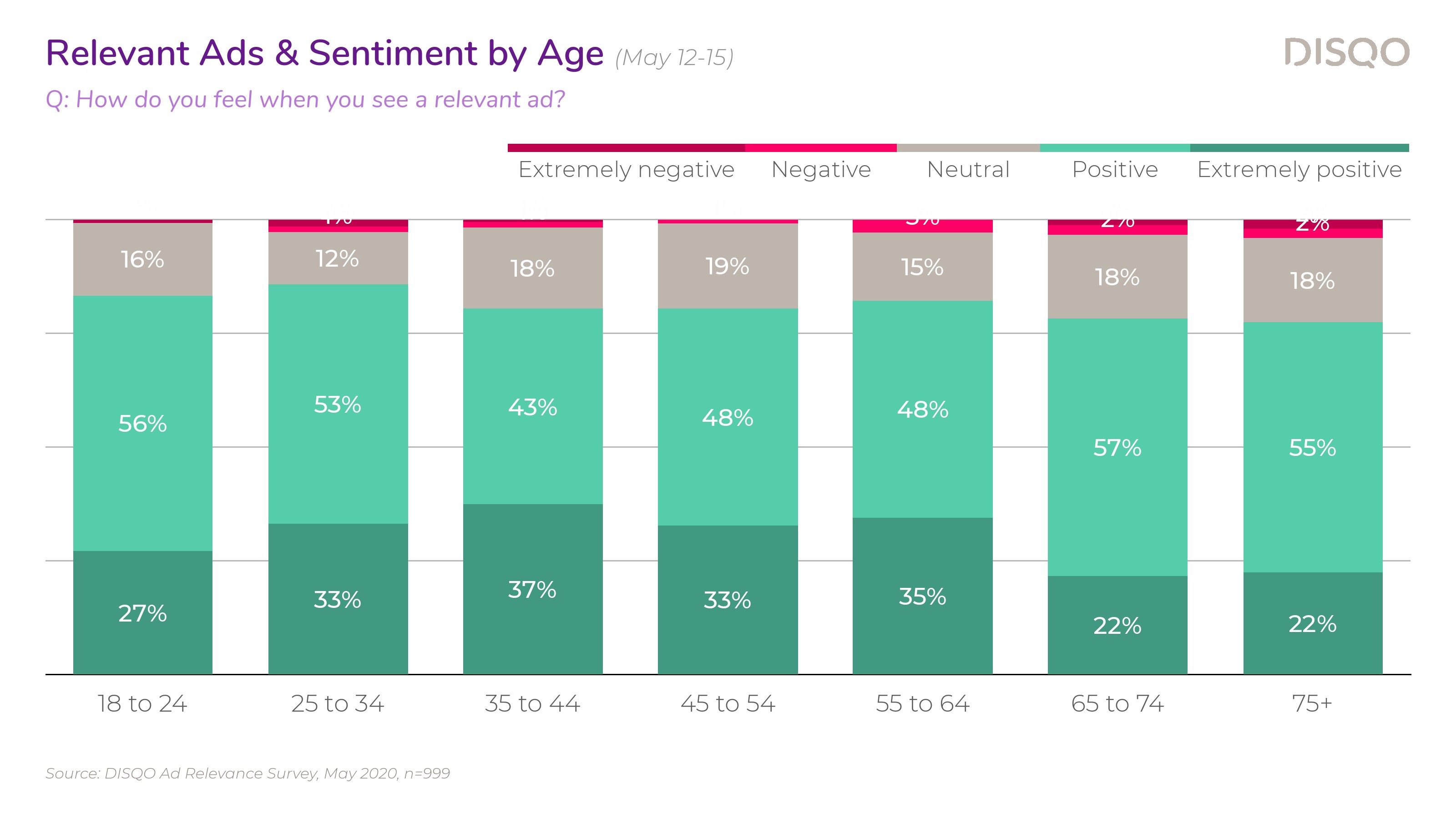 DISQO调查了大约1000名消费者,43%的受访者强烈同意他们希望看到与自己相关的广告,还有38%的受访者表示同意。这种积极的情绪在所有年龄段都存在;除了65岁-74岁(72%),其他年龄段希望看到相关广告的比例在83%-88%之间。