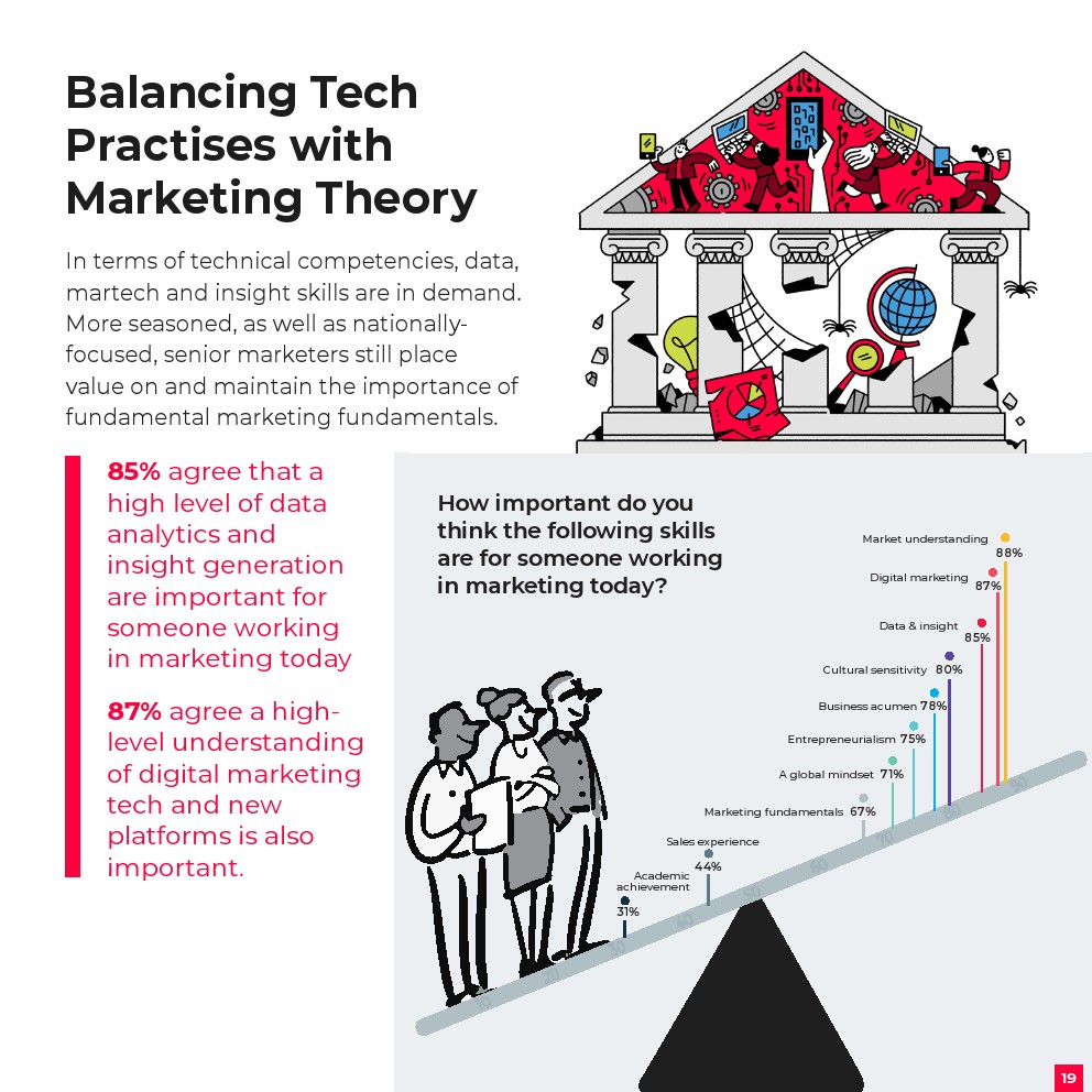 虽然全球化思维(71%)和营销基础知识(67%)也是重要的技能,但很少有受访者认为销售经验(44%)和学术成就(31%)是营销领域的重要技能。