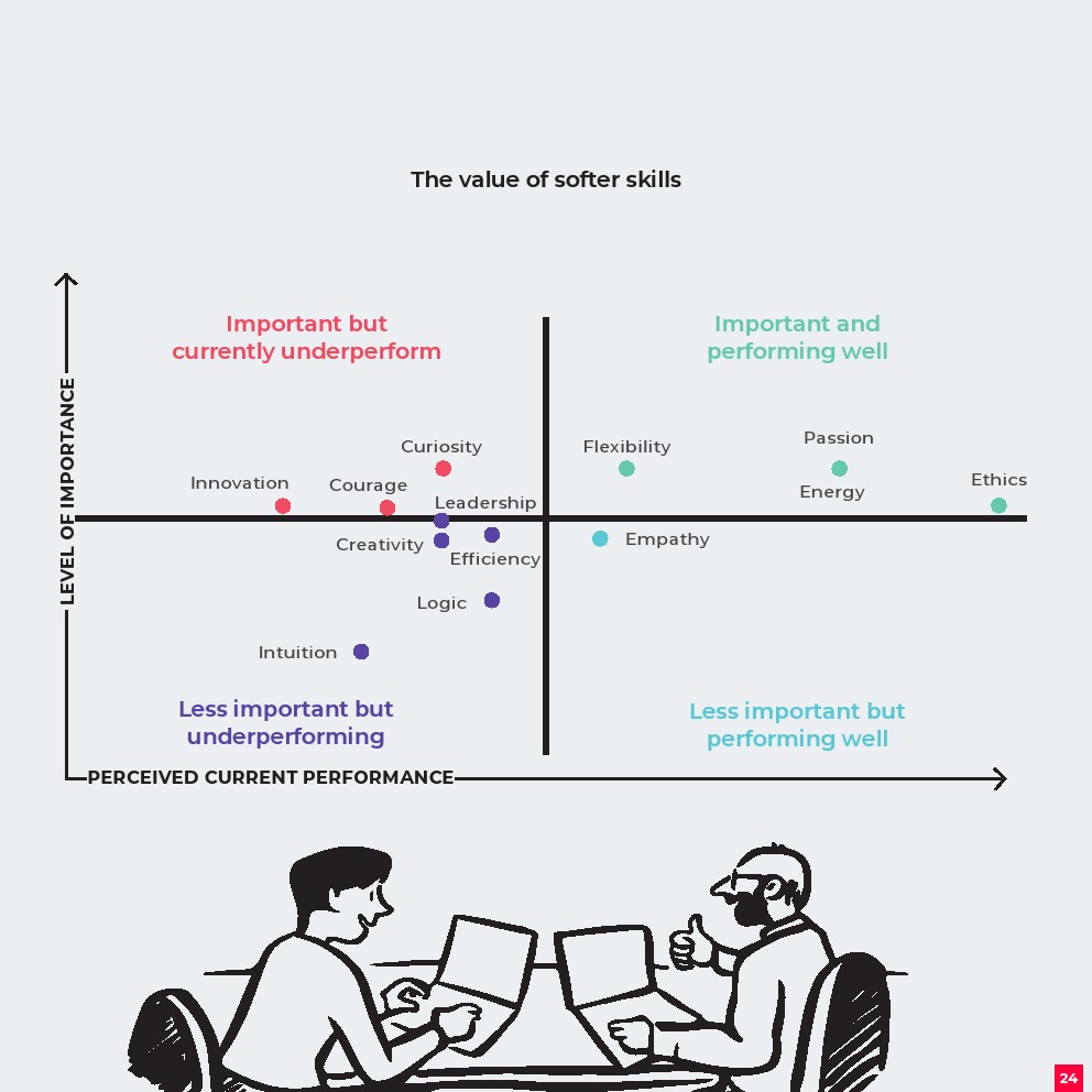 与此同时,大多数受访者也认为许多其他个人特质很重要,从勇气(88%)到创新(88%)、领导力(87%)、创造力(86%)、同理心(86%)和效率(86%)。在某种程度上,逻辑性(81%)和直觉(77%)也是重要的特征。