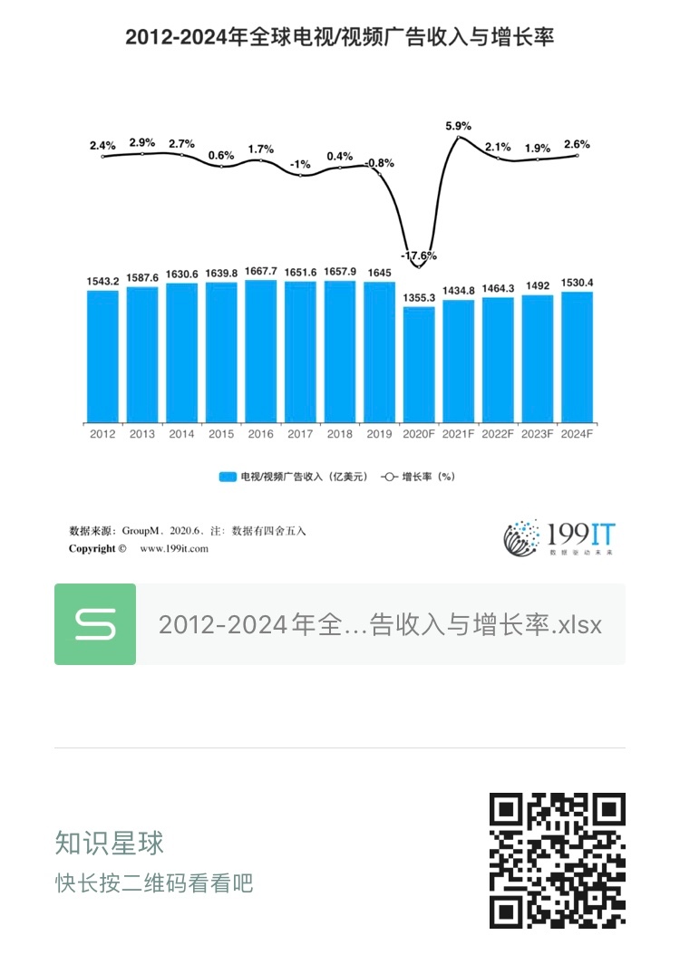 2012-2024年全球电视/视频广告收入与增长率【附原数据表】 更多阅读:爱立信:2013年全球电视及媒体报告2019-2022年美国的互联网电视广告收入来源及占比(附原数据表)Harris:电视和平板,广告效果提升更明显Nielsen:美剧新剧开打,电视广告先行marketingcharts:美国电视广告收入增长仍然强劲Deloitte:2012年英国观众观看的电视广告数量达万亿,联网电视发展缓慢Videology:2018年67%的营销人员维持其传统电视广告支出水平CTR:2023年1-7月电视广告刊例花费同比下跌2.3%酷云互动:618电视广告效果洞察报告Nielsen:2011年美国电视体育广告市场现状CTR:2023年1-2月电视广告刊例花费同比下跌17.1%TVB:电视广告对家装购买决定影响最大ThinkTV:2021年澳大利亚电视广告支出同比增长19.9%CTR:2022年1-10月电视广告刊例花费同比下跌14.1%ThinkTV:2021上半年澳大利亚电视广告收入38.5亿澳元