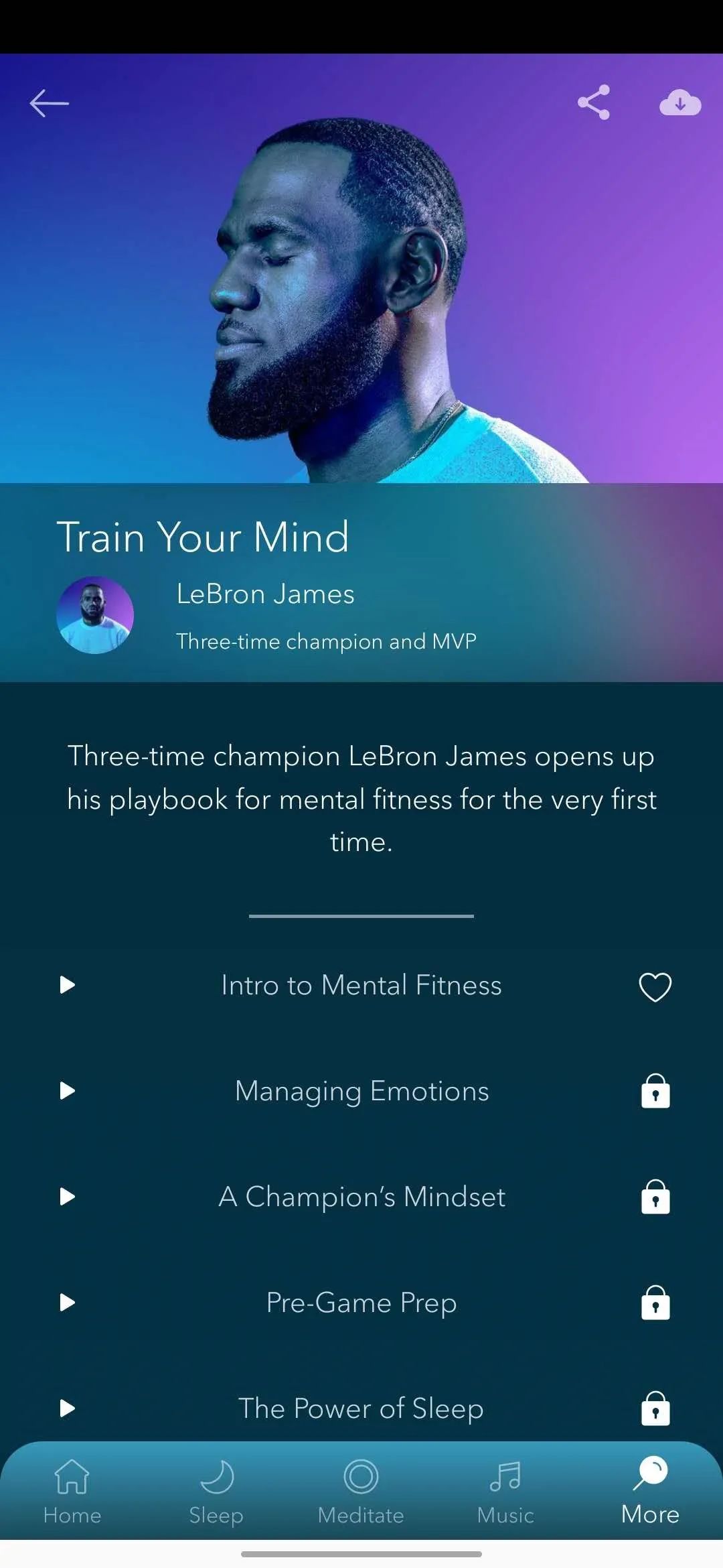 比如 Headspace 成为 NBA 的官方合作伙伴,设立了一个叫 Performance Mindset 的专区,其中收入了四位球星关于冥想的采访视频。而在 Calm 中也有 NBA 球星詹姆斯的音频课程。