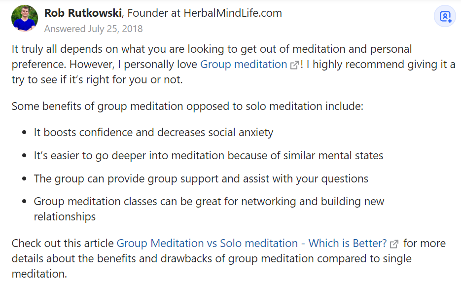 对此,笔者在 Quora 上查到了一个叫做“单独冥想好还是群体冥想好?”的问题,回答者基本上都对群体冥想更认可,从回答中,可以大概总结出线下群体冥想的几点优势:建立人际关系、更方便求助同伴和老师的帮助、注意力更加集中等。