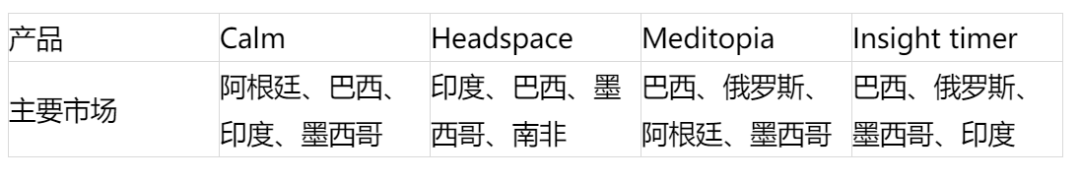 不过不是每个新兴市场的用户都有冥想的习惯,在分析了比较热门的四个产品的市场分布后,发现新兴市场主要集中在巴西、印度、墨西哥、俄罗斯这几个国家。