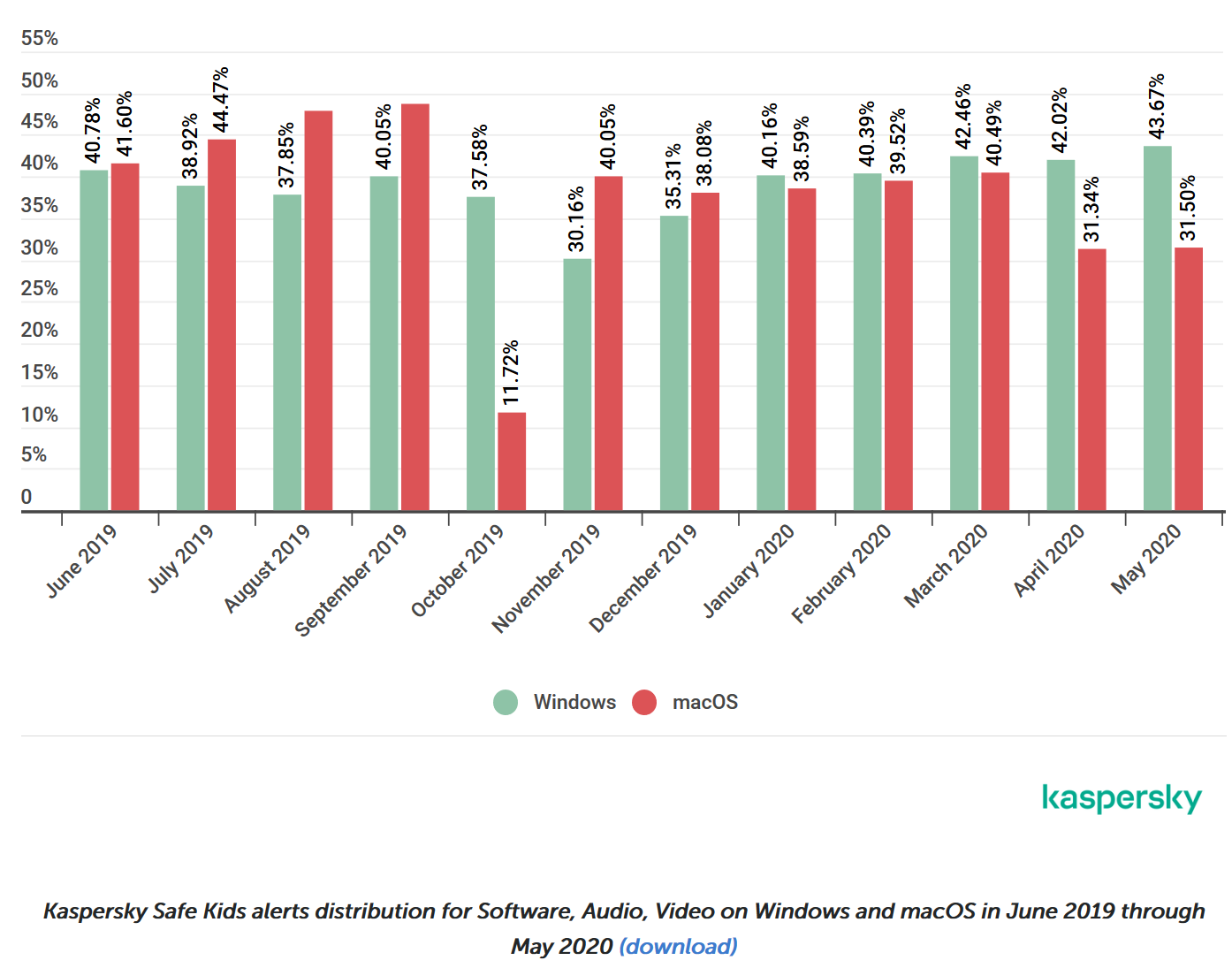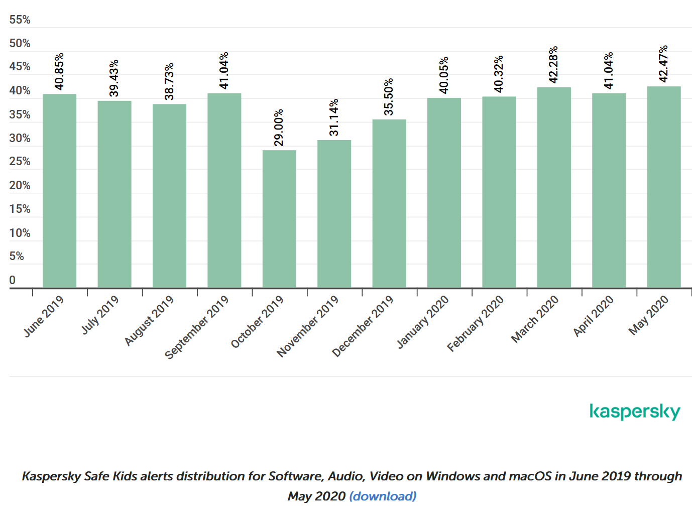 2020年上半年,软件、音频、视频开始在全球范围内增长,到5月份,所有平台上都达到了峰值(42.47%)。