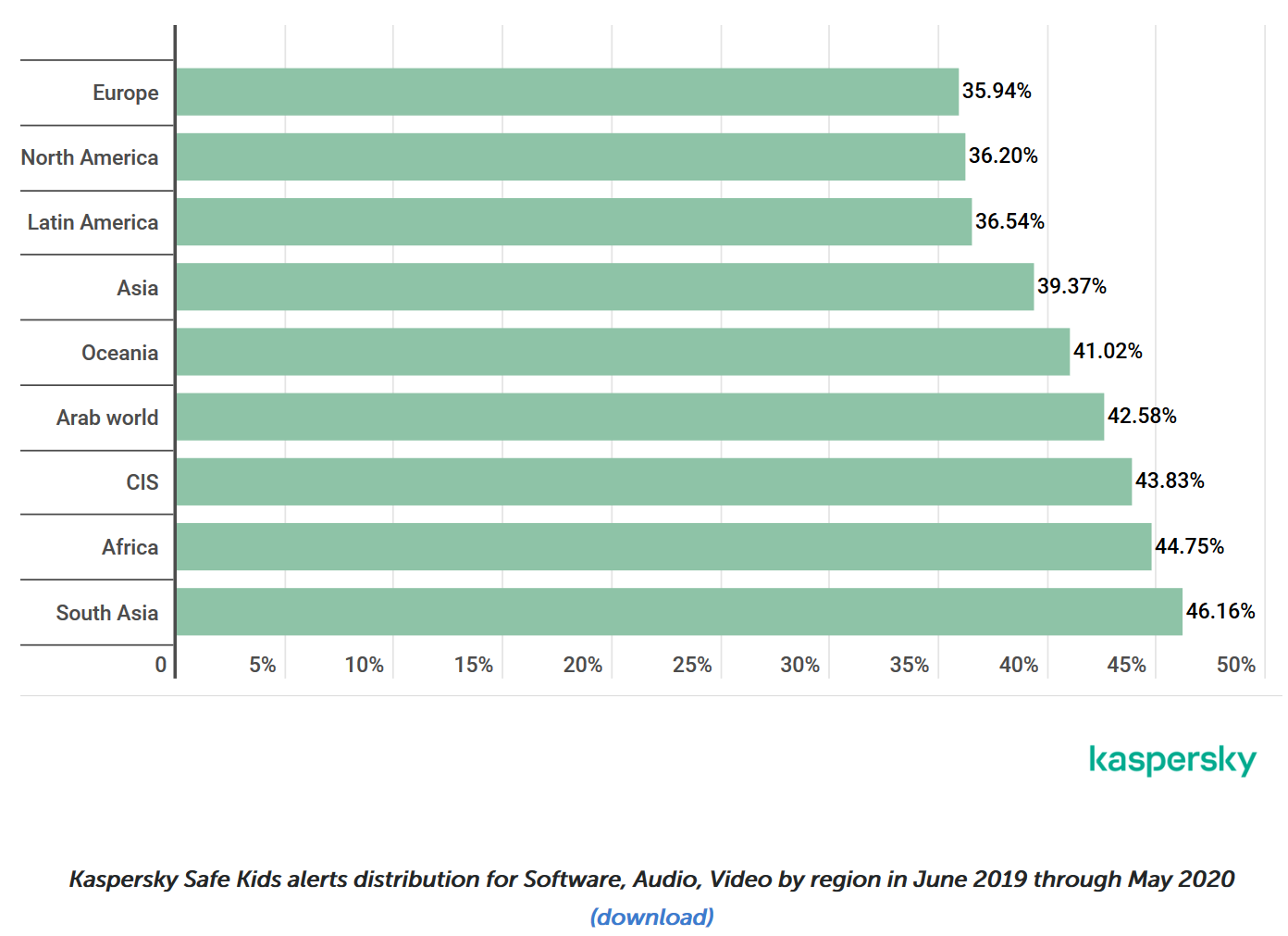 南亚(印度、孟加拉国)的孩子们最有可能把时间花在看视频和听音乐上(46.16%)。其次是非洲(44.75%)和独联体(43.83%)。