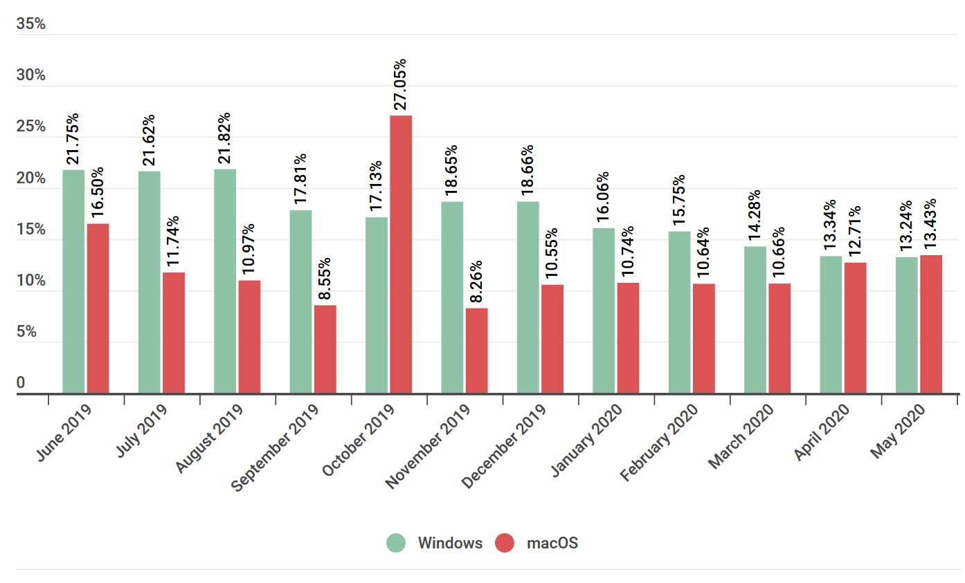 在运行MacOS的台式机和笔记本电脑上,从2019年6月到2020年5月即时通讯使用量激增。