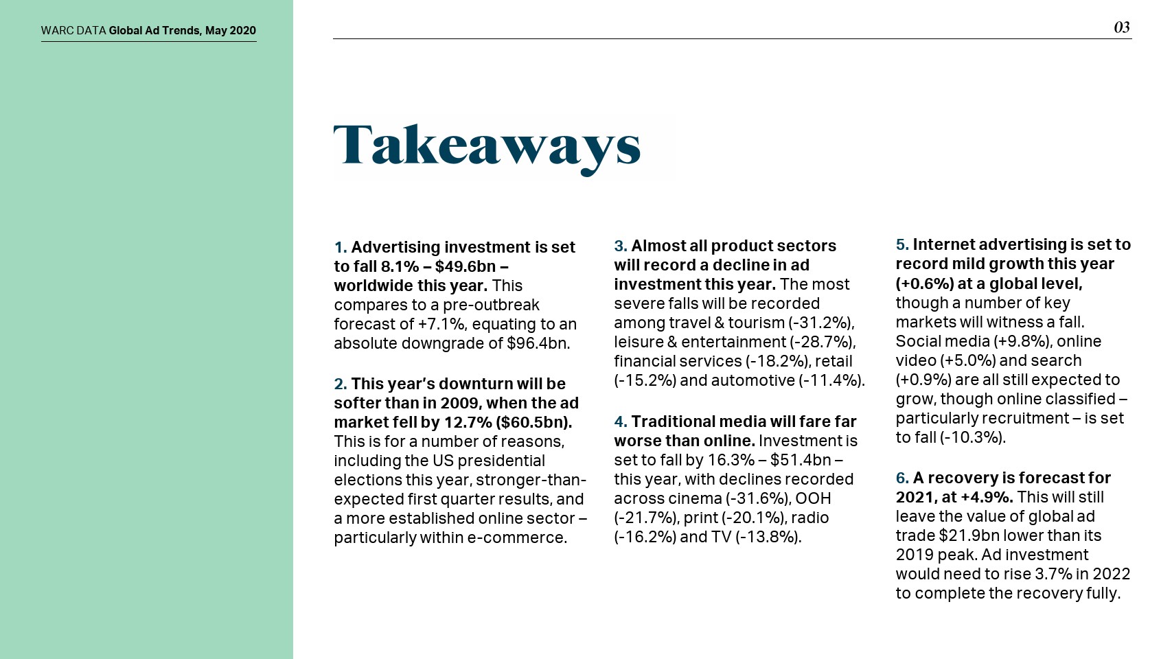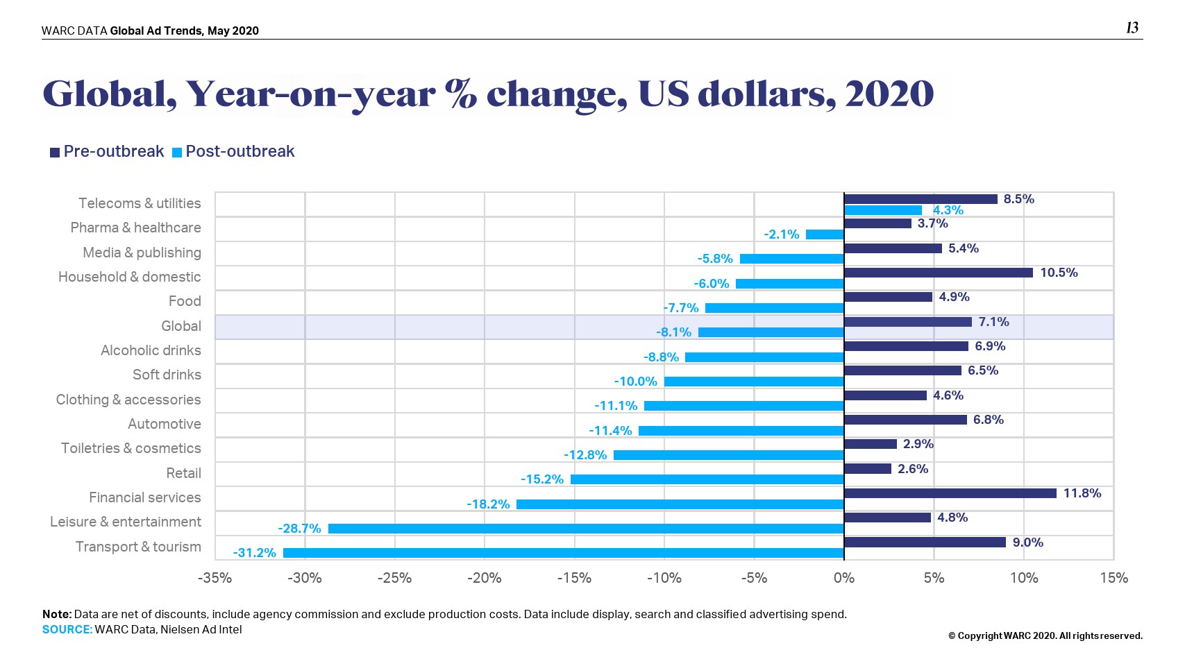 按行业划分全球广告市场时,交通和旅游(-31.2%)、休闲和娱乐(-28.7%)、金融服务(-18.2%)、零售(-15.2%)和汽车(-11.4%)领域的广告支出大幅下降。仅在这五个领域就导致2020年广告市场增长预期下调了548亿美元。