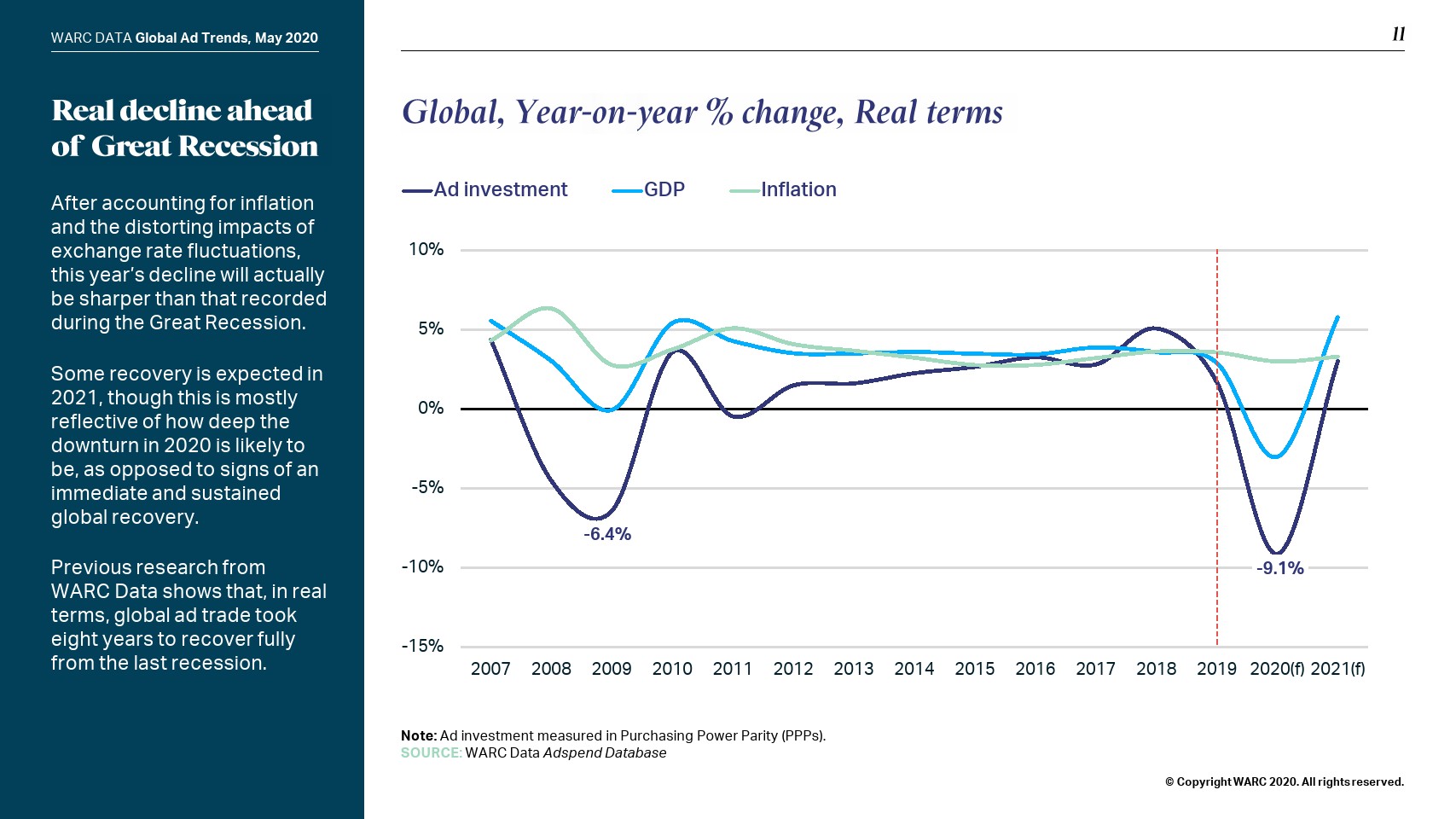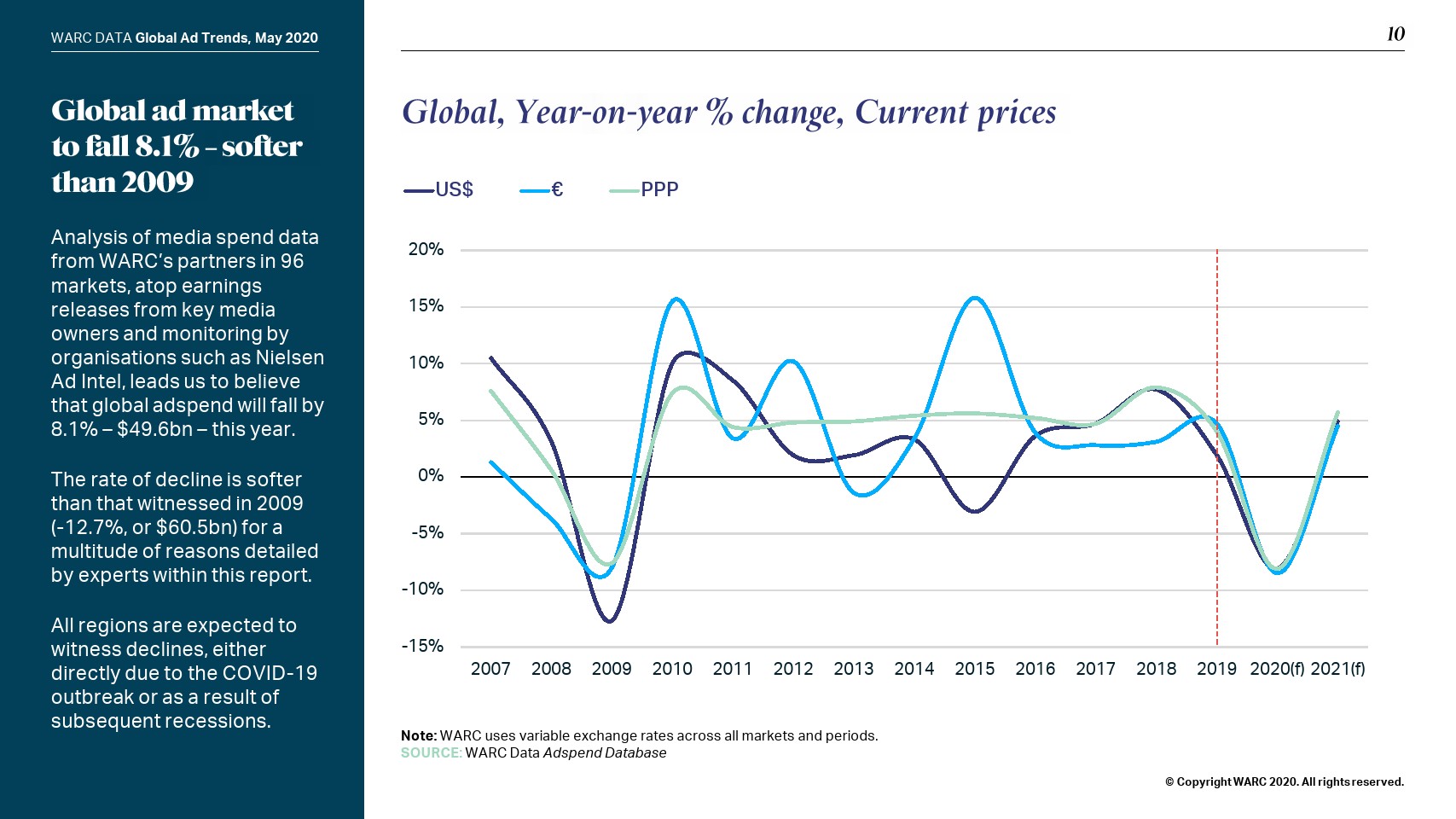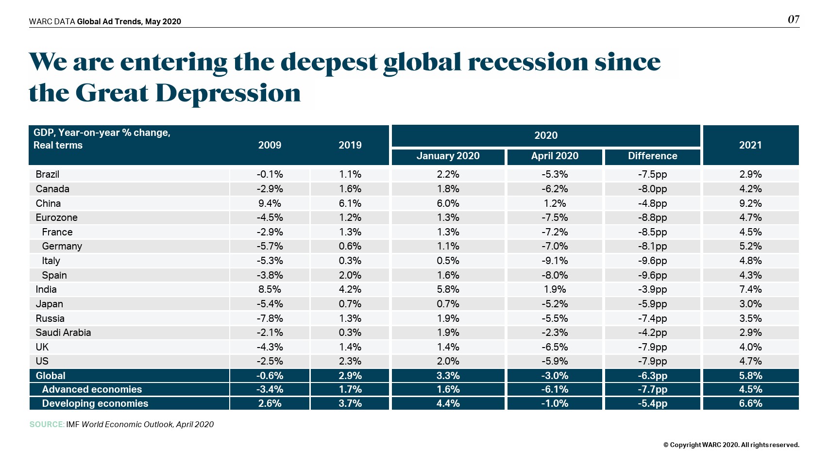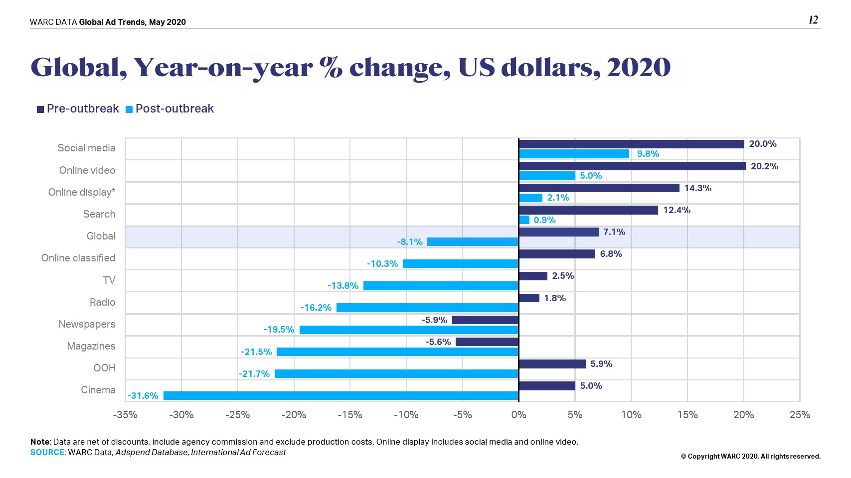 在线模式也没有受到保护;WARC将全球网络广告支出预测下调至365亿美元,即增幅0.6%。社交媒体(+9.8%)将实现最强劲的增长,而在线视频(+5.0%)和搜索(+0.9%)将比之前的预测大幅放缓。