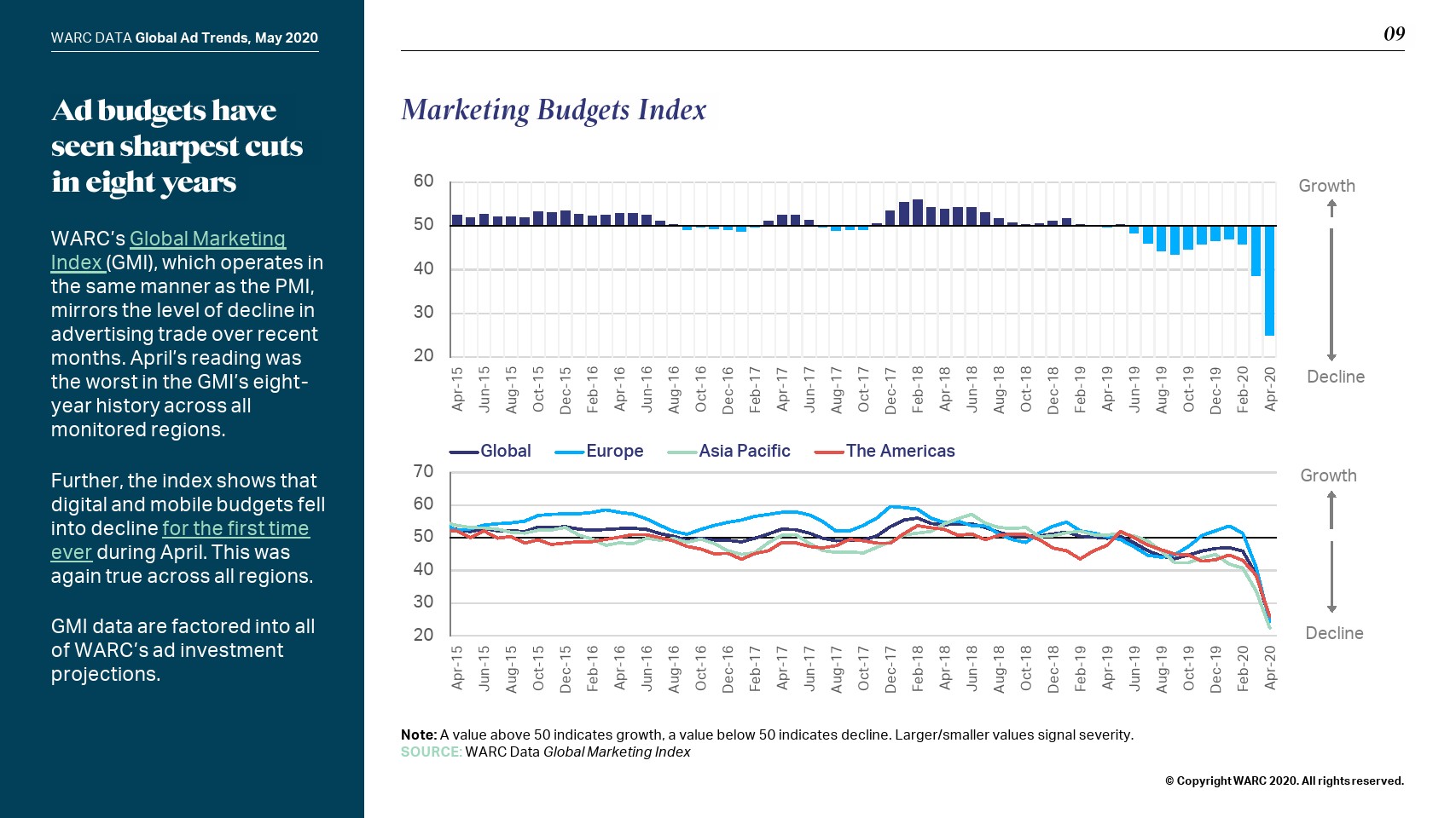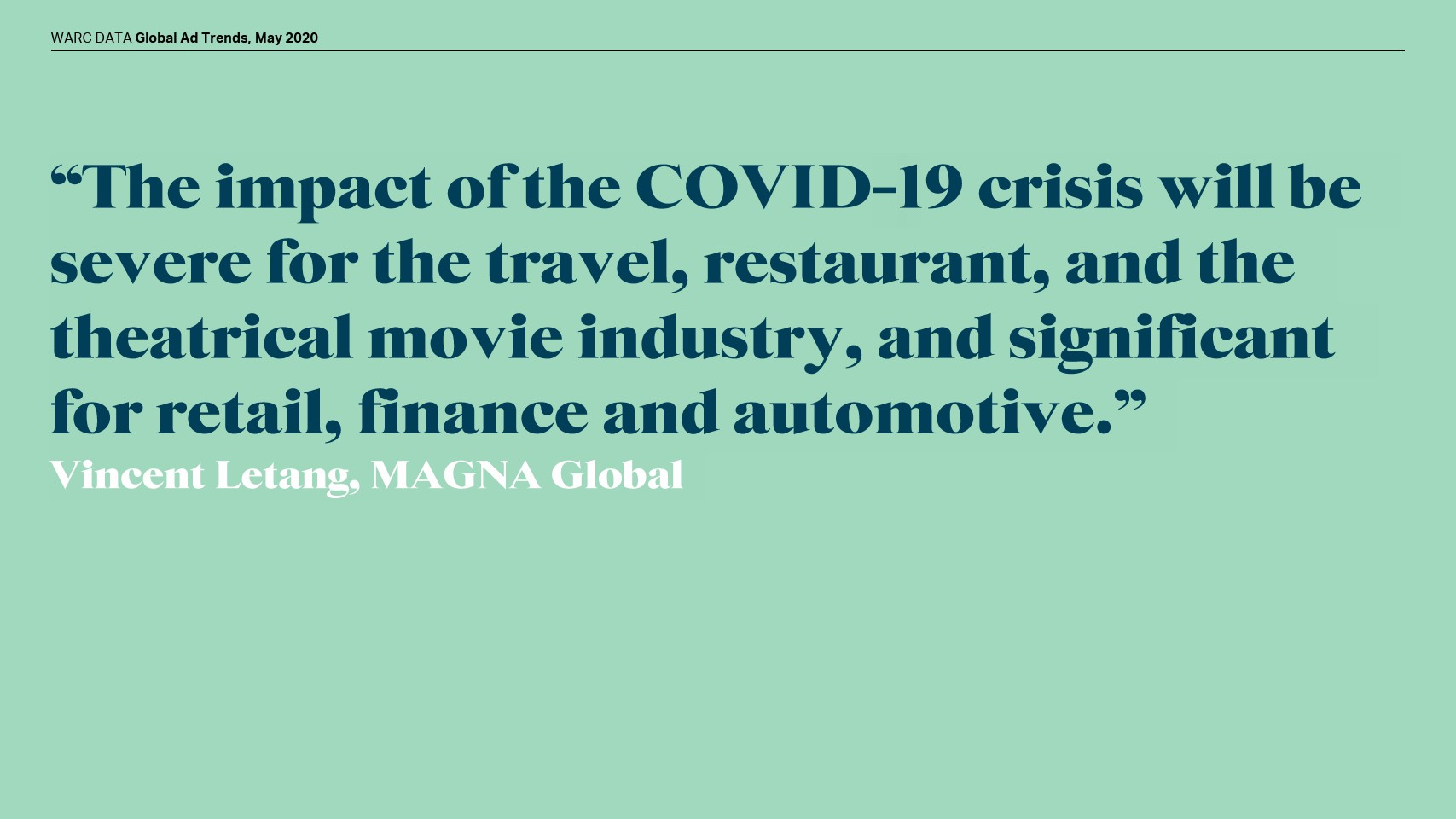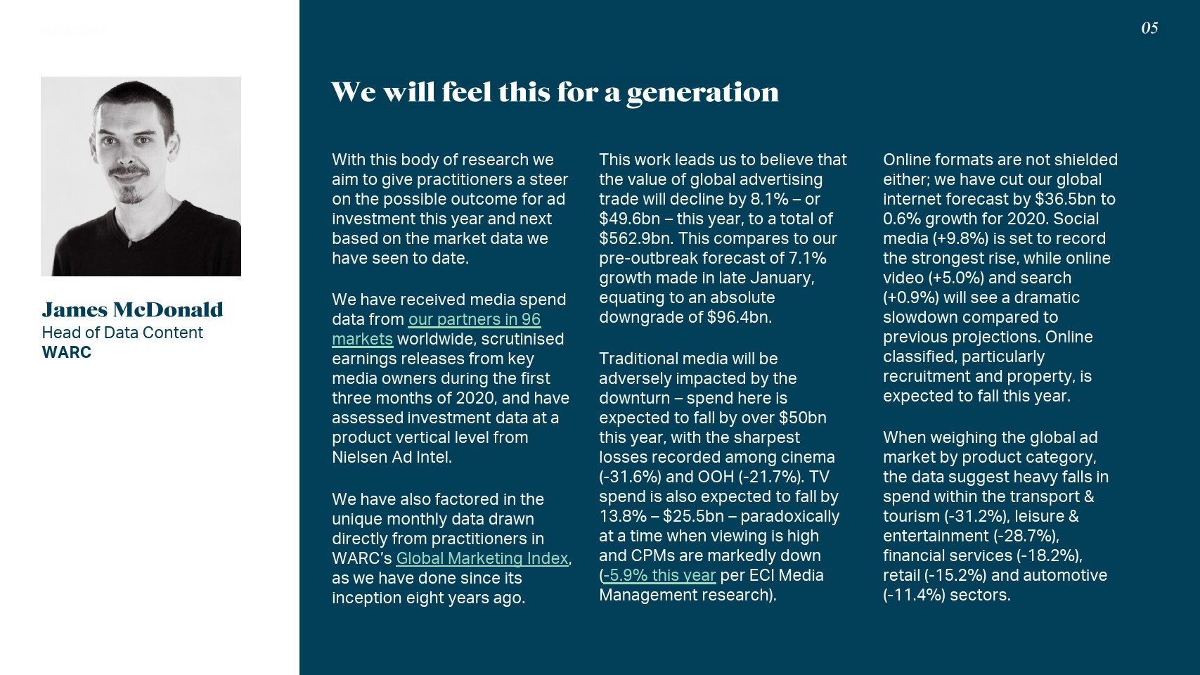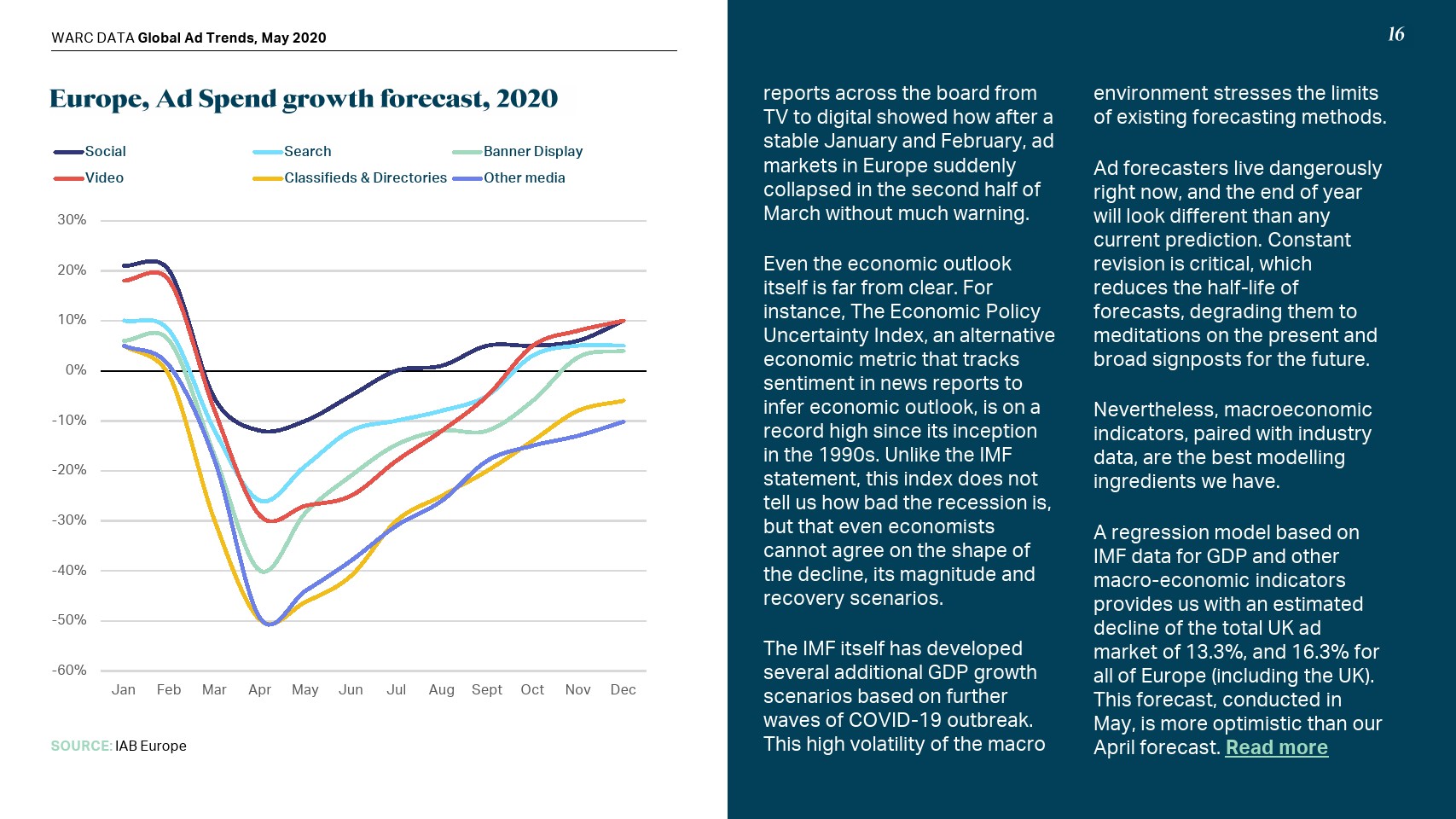 在线模式也没有受到保护;WARC将全球网络广告支出预测下调至365亿美元,即增幅0.6%。社交媒体(+9.8%)将实现最强劲的增长,而在线视频(+5.0%)和搜索(+0.9%)将比之前的预测大幅放缓。