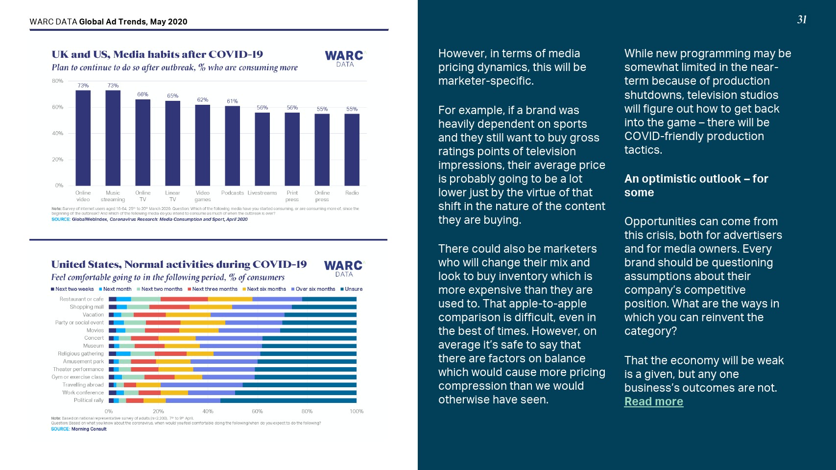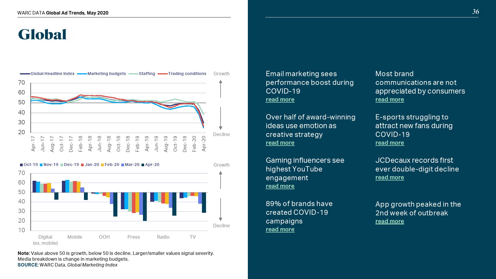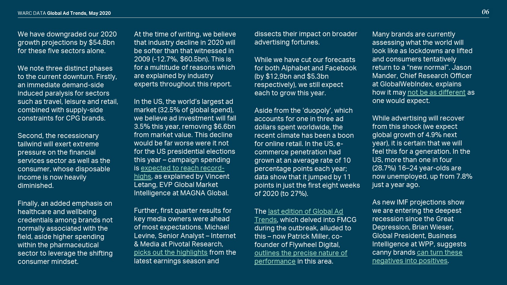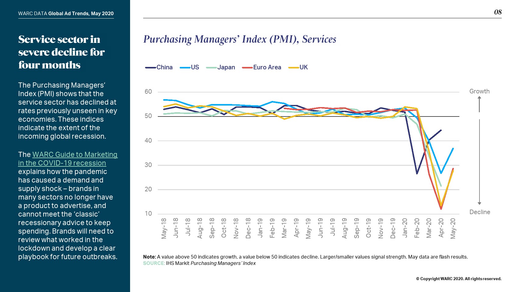 在线模式也没有受到保护;WARC将全球网络广告支出预测下调至365亿美元,即增幅0.6%。社交媒体(+9.8%)将实现最强劲的增长,而在线视频(+5.0%)和搜索(+0.9%)将比之前的预测大幅放缓。