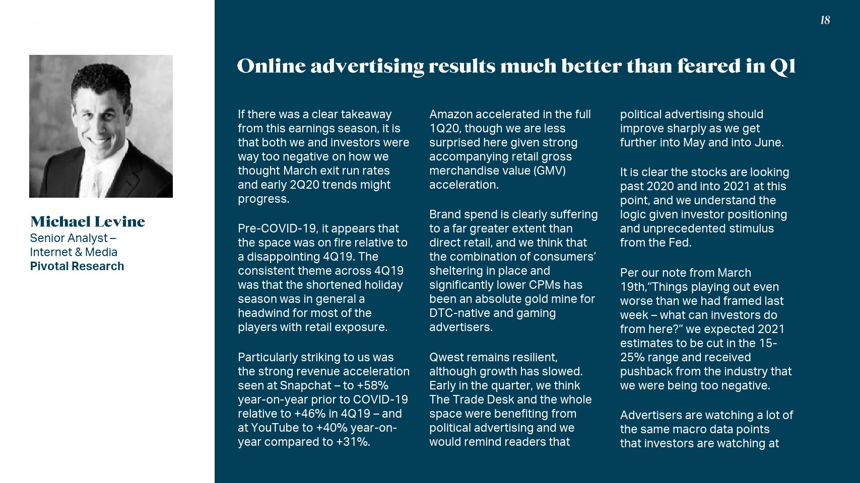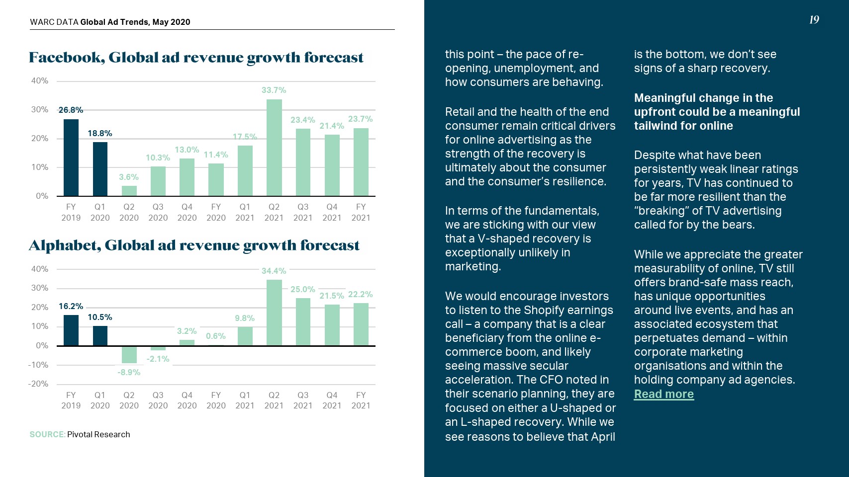 虽然对Alphabet和Facebook的广告收入预期也有所下调(分别下调了129亿美元和53亿美元),但预计这两家公司今年仍会保持增长趋势。
