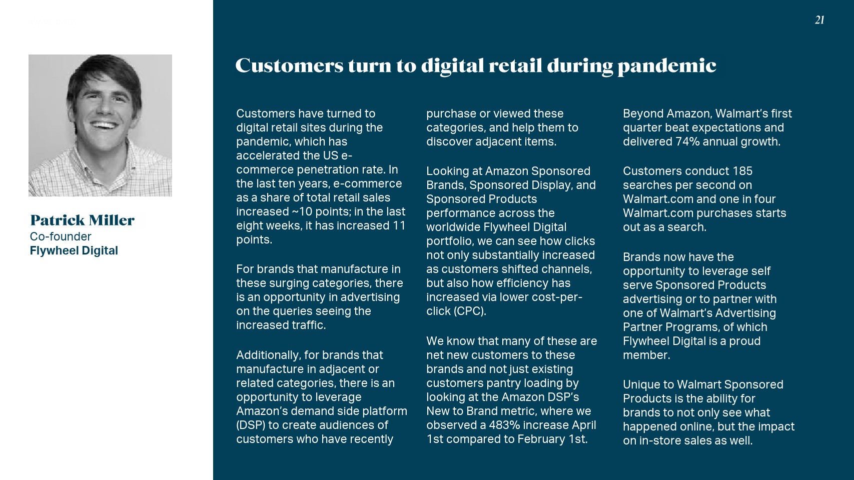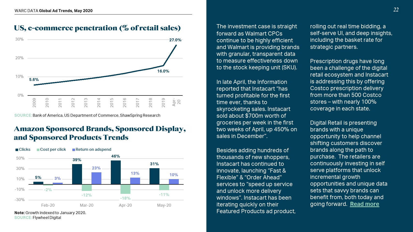 除了占全球广告支出1/3的“双寡头”之外,疫情影响对在线零售来说是一个福音。在美国,电子商务普及率以平均每年10个百分点的速度增长;数据显示,仅在2020年的前8周,电子商务普及率就增长了11个百分点(达到27%)。