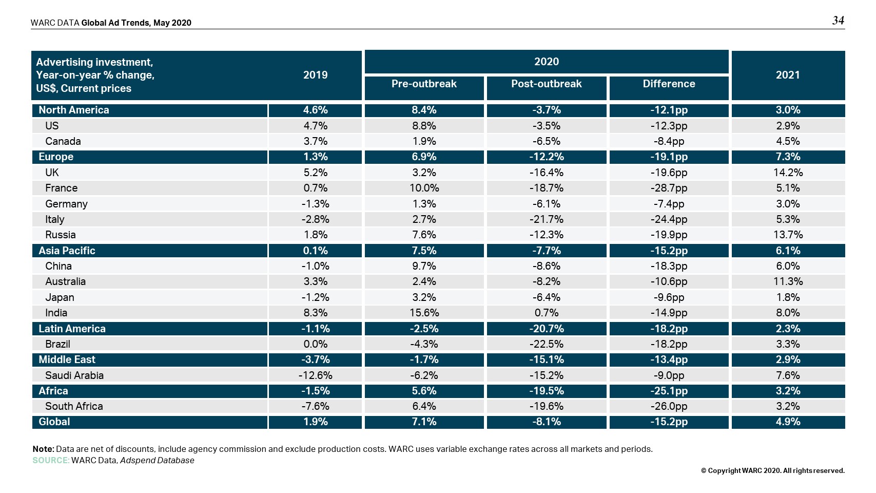 WARC认为,今年全球广告支出将下降8.1%,(即496亿美元),总额将降至5629亿美元。相比之下,在1月下旬疫情爆发前做出的预测为增长7.1%,相当于绝对下调了964亿美元。