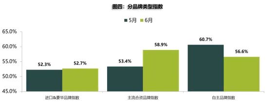 从分品牌类型指数看:调查显示,6月份进口&豪华品牌、主流合资品牌指数环比上升,自主品牌指数环比下降。自主品牌受厂家政策影响,集中在5月发力,6月销量目标相对保守,库存水平下降。